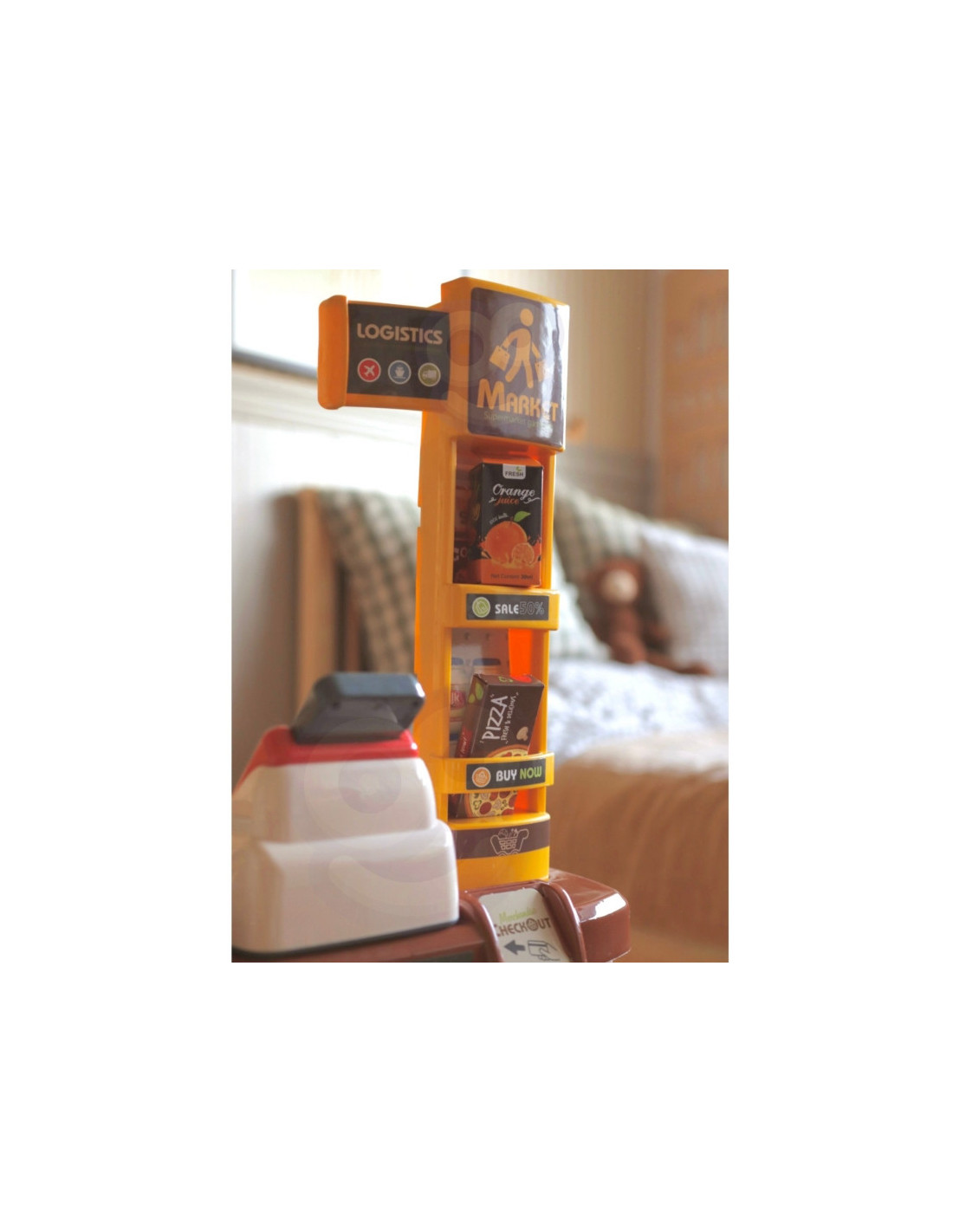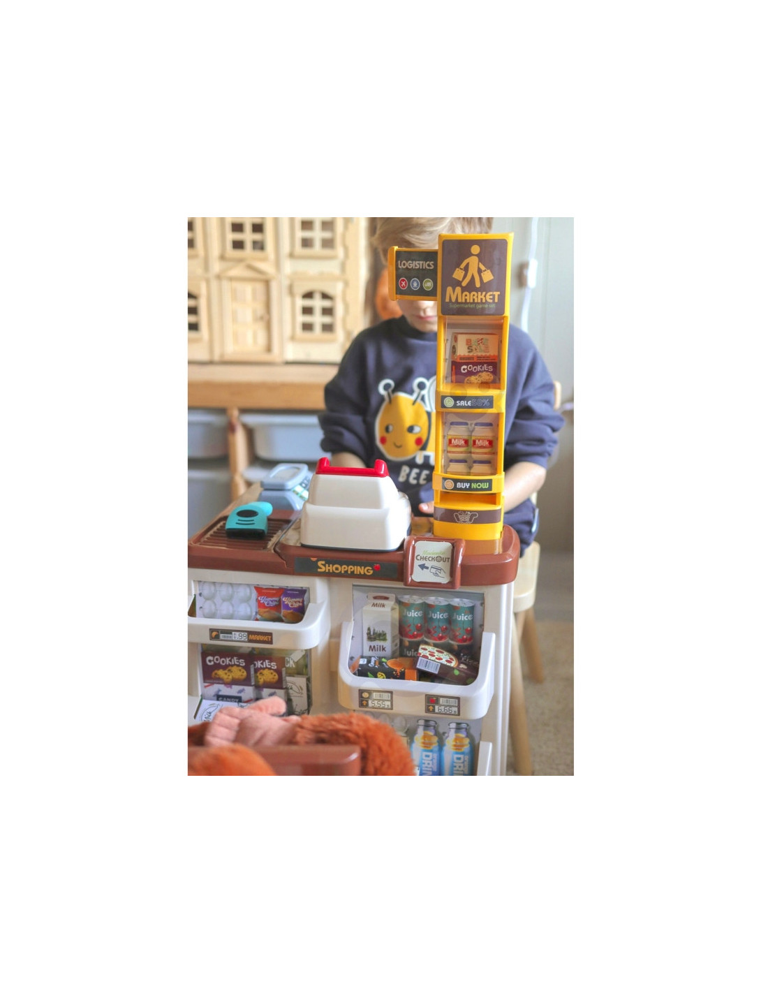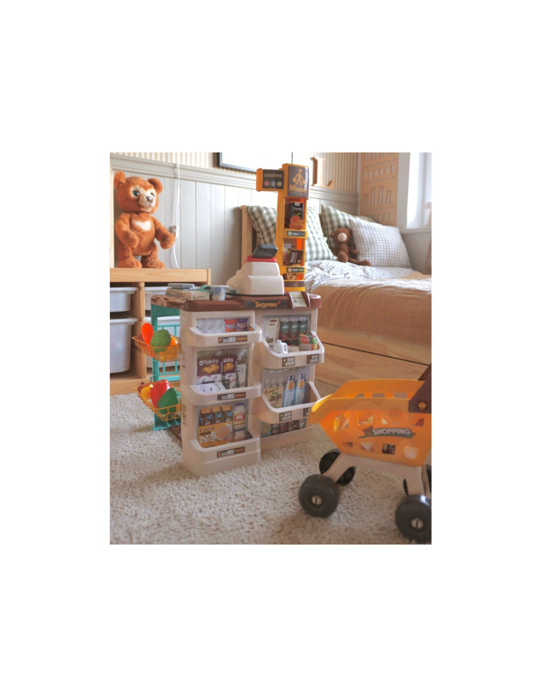 Prekybos centras su pirkinių vežimėliu, kuriame yra iki 48 priedų, iš prekės ženklo Woopie. Idealiai tinka vaikams nuo 3 metų amžiaus. Vaikai mėgsta mėgdžioti savo tėvus atliekant kasdienius darbus, todėl šis rinkinys puikiai tiks jūsų vaikui ir suteiks papildomą galimybę ne tik smagiai praleisti laiką, bet ir ko nors išmokti (vaidmenų žaidimai lavina mažylio vaizduotę ir kūrybiškumą ). Parduotuvėje yra visi būtini elementai, reikalingi mažojo pardavėjo darbo vietai įrengti, įskaitant: kasos aparatą su terminalu, svarstykles , skaitytuvą, mokėjimo kortelę ir daugybę maisto produktų. Pridedamas pirkinių vežimėlis leidžia žaisti su draugais nesvarbu kur ir kada!