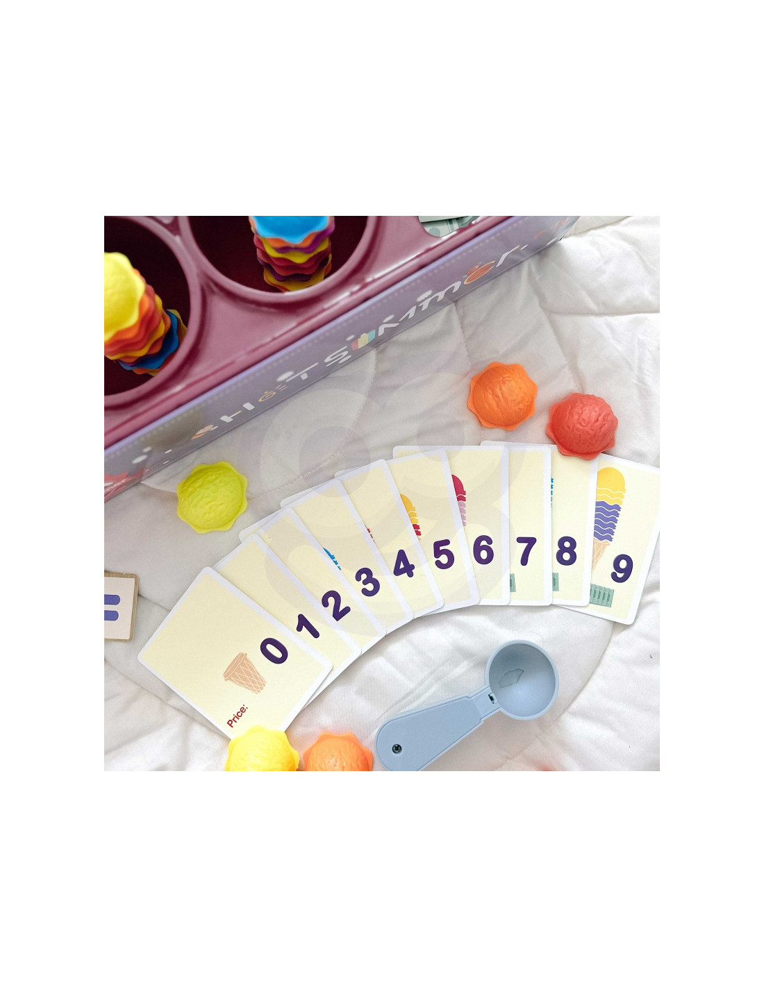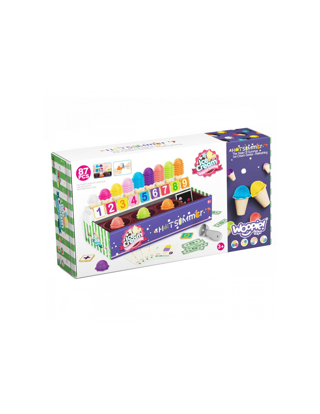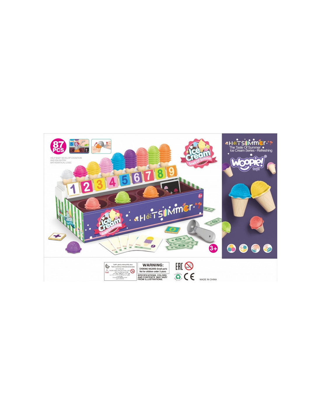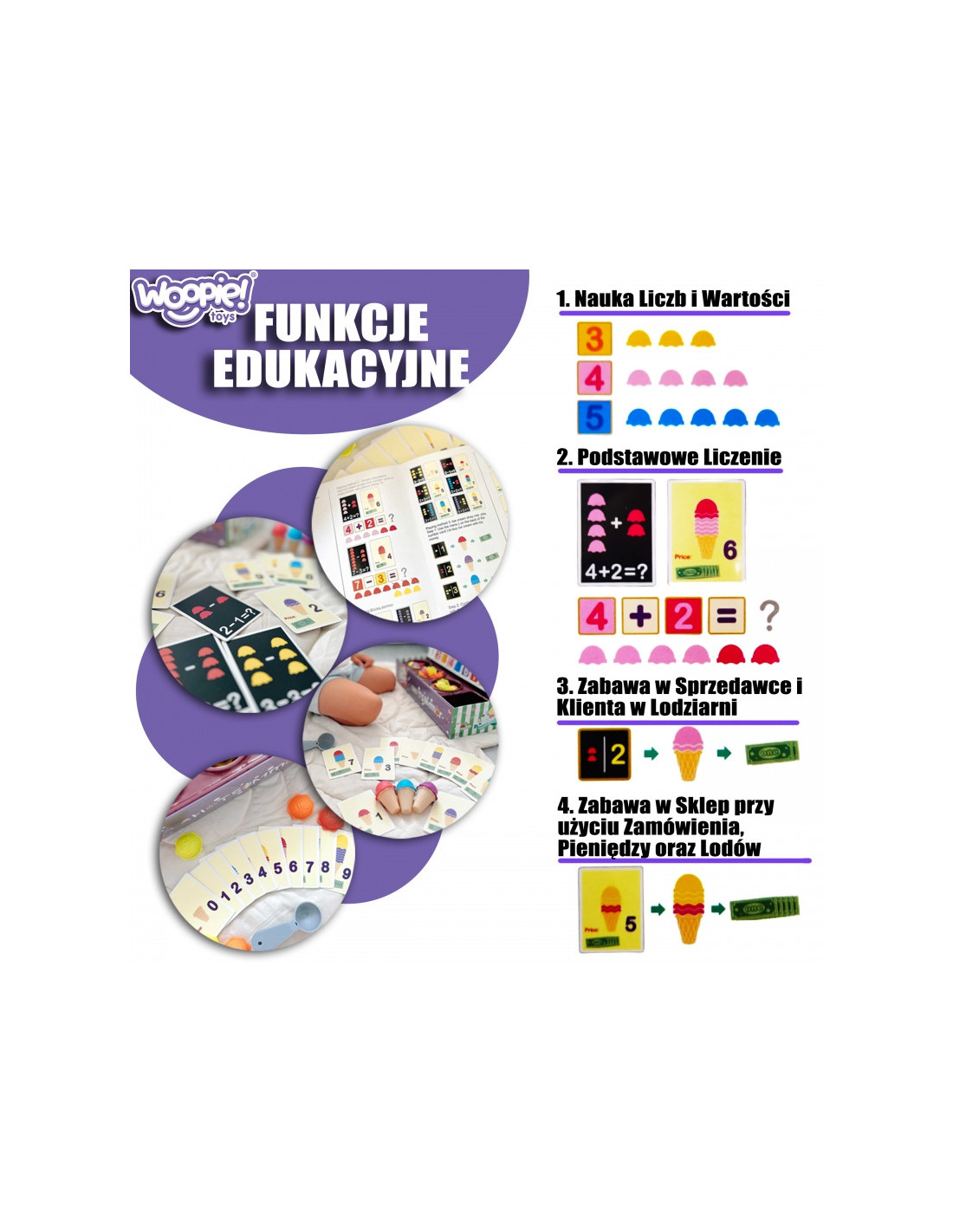 WOOPIE prekės ženkloledų salono rinkinys ne tik leis žaisti kaip mažam ledų pardavėjui, bet ir mokytis skaičiuoti, skaičių, spalvų ir sudėties. Rinkinį sudaro 87 dalys, įskaitant ledų kaušelį, vaflius, užsakymo korteles, pinigus, žetonus su skaičiais ir ledų šaukštą. Ledų kaušeliai skiriasi pagal spalvą, o užsakymo kortelėse pateikiamos paprastos matematinės užduotys. Tuo tarpu žaisdami vaidmenimis vaikai lavins bendravimo įgūdžius, leis sumažinti stresą kasdienėse situacijose ir yra puiki empatijos pamoka.