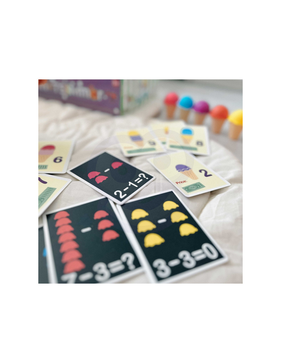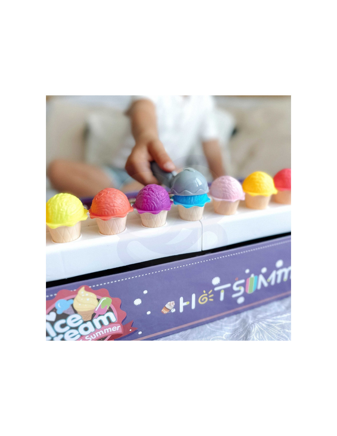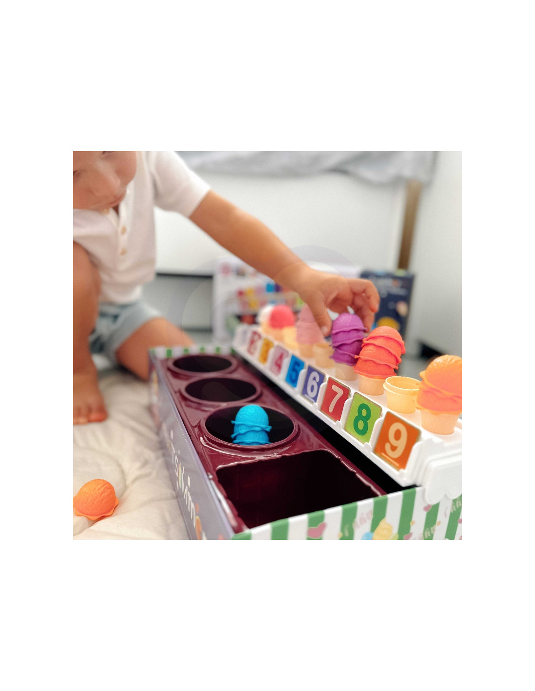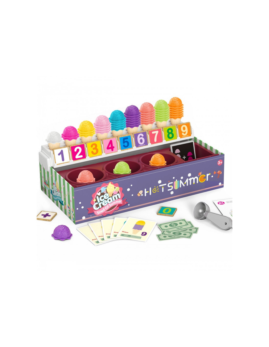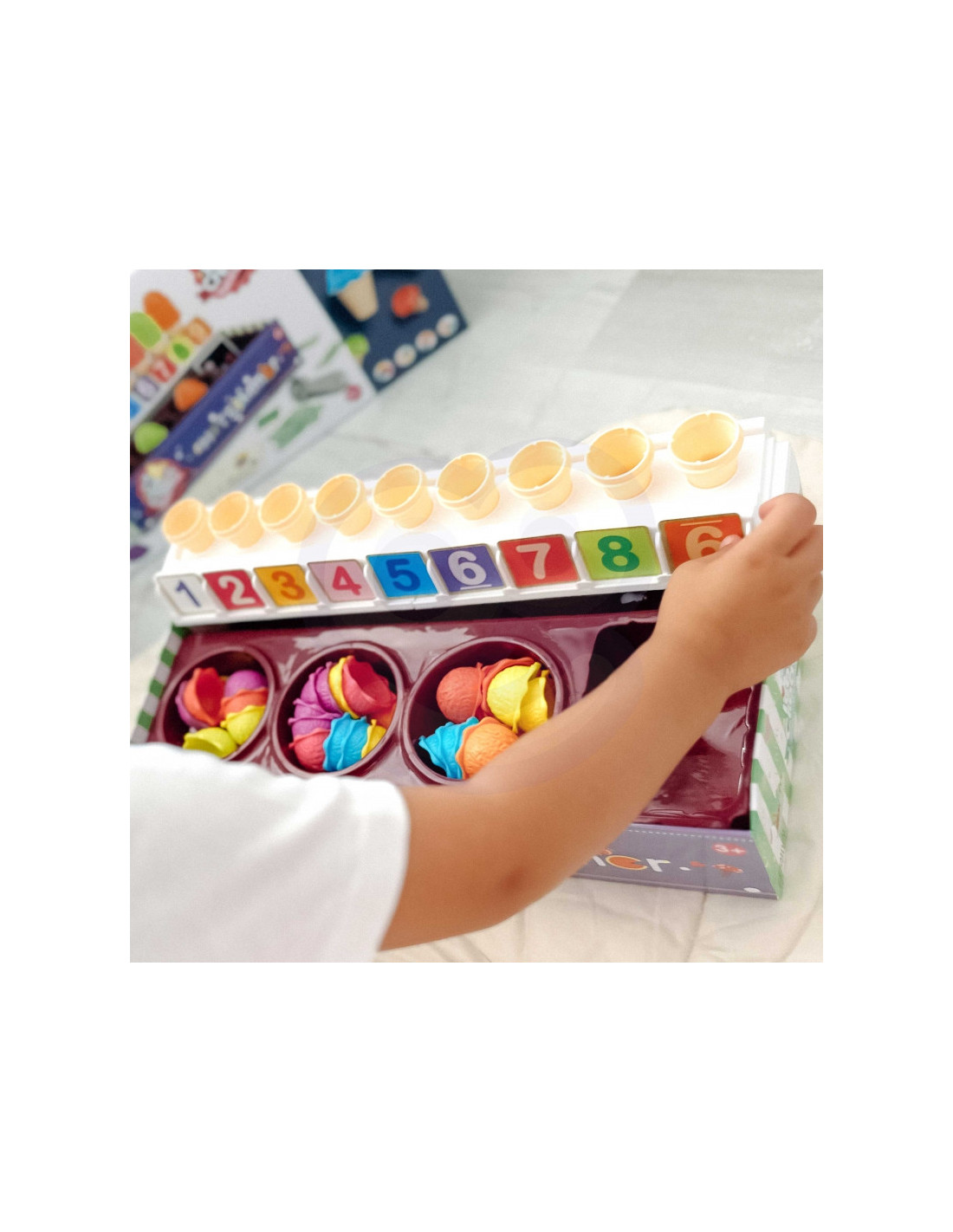 WOOPIE prekės ženkloledų salono rinkinys ne tik leis žaisti kaip mažam ledų pardavėjui, bet ir mokytis skaičiuoti, skaičių, spalvų ir sudėties. Rinkinį sudaro 87 dalys, įskaitant ledų kaušelį, vaflius, užsakymo korteles, pinigus, žetonus su skaičiais ir ledų šaukštą. Ledų kaušeliai skiriasi pagal spalvą, o užsakymo kortelėse pateikiamos paprastos matematinės užduotys. Tuo tarpu žaisdami vaidmenimis vaikai lavins bendravimo įgūdžius, leis sumažinti stresą kasdienėse situacijose ir yra puiki empatijos pamoka.