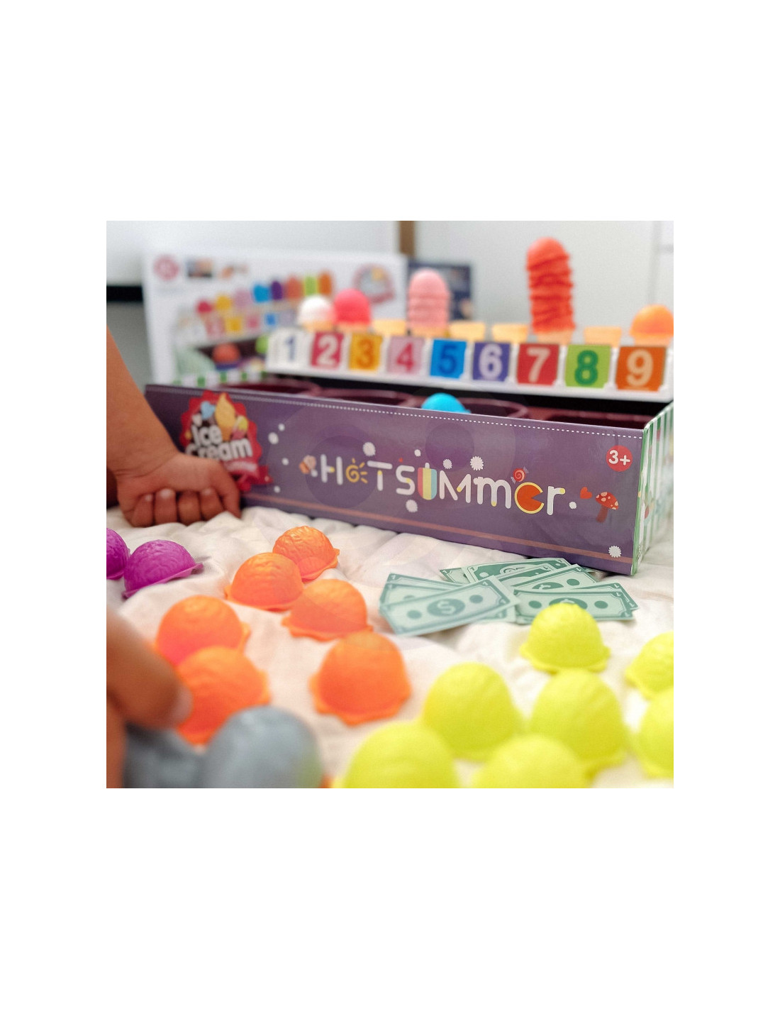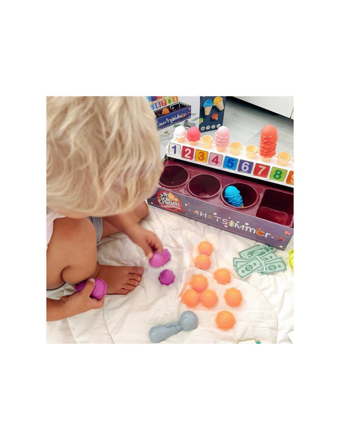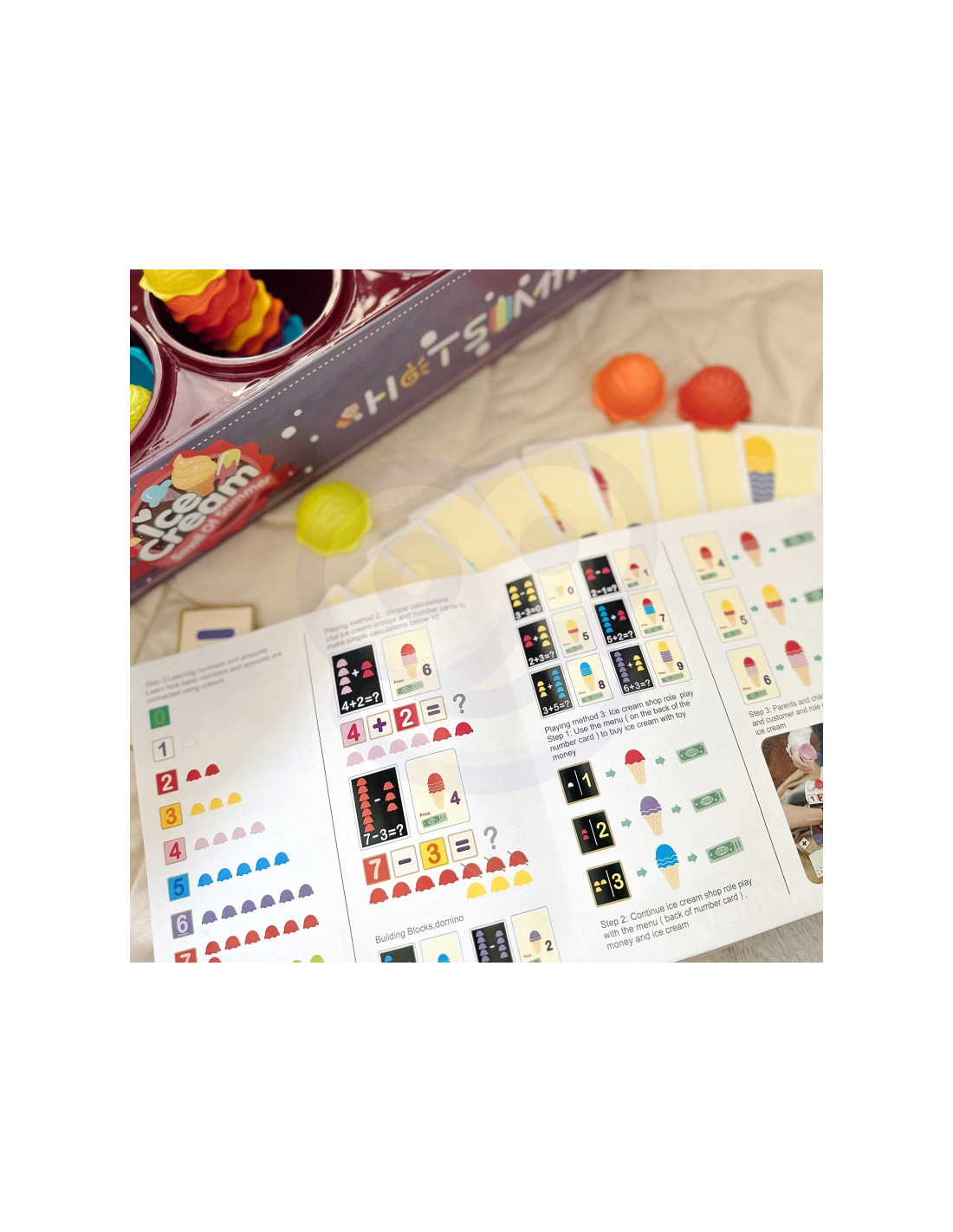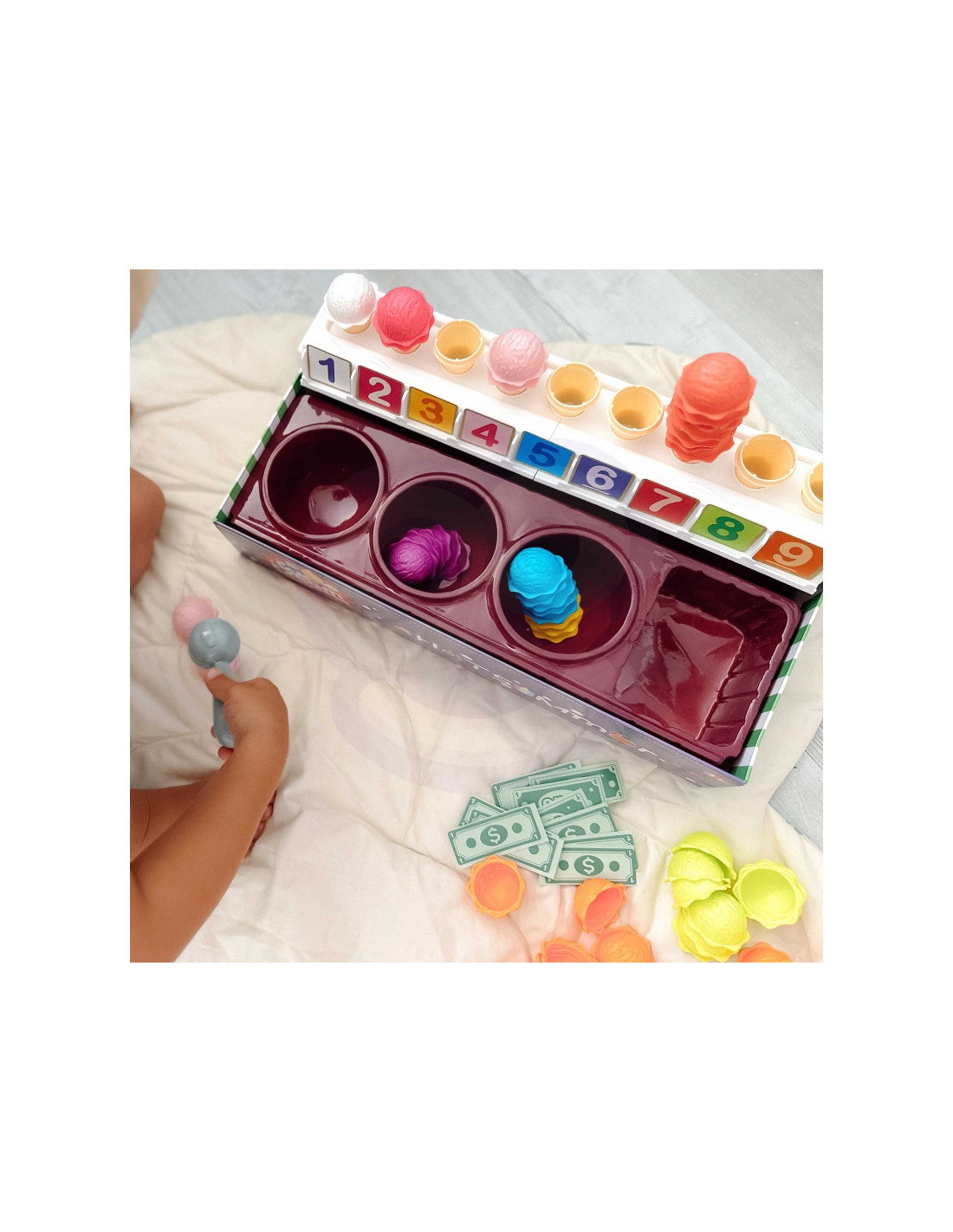 WOOPIE prekės ženkloledų salono rinkinys ne tik leis žaisti kaip mažam ledų pardavėjui, bet ir mokytis skaičiuoti, skaičių, spalvų ir sudėties. Rinkinį sudaro 87 dalys, įskaitant ledų kaušelį, vaflius, užsakymo korteles, pinigus, žetonus su skaičiais ir ledų šaukštą. Ledų kaušeliai skiriasi pagal spalvą, o užsakymo kortelėse pateikiamos paprastos matematinės užduotys. Tuo tarpu žaisdami vaidmenimis vaikai lavins bendravimo įgūdžius, leis sumažinti stresą kasdienėse situacijose ir yra puiki empatijos pamoka.
