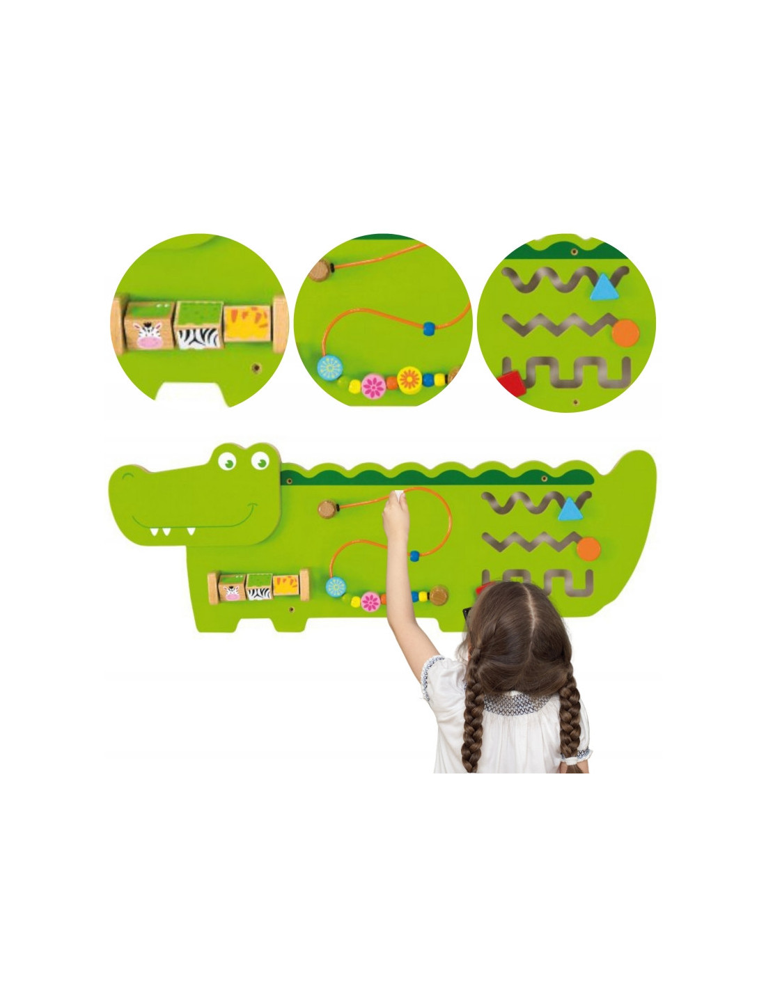 „Viga Toys“ krokodilo sensorinė ir manipuliacinė lenta yra medinis, daugiafunkcis sieninis žaislas , kuris suteiks vaikams valandų valandas pramogų. Tarp įvairių veiklų rasite labirintą, kilpą (motorinę kilpą su karoliukais) ir kaladėles . Žaislas skirtas stimuliuoti pojūčius ir lavinti vaikų motorinius įgūdžius . Tai puikus pratimas mažųjų pirštelių miklumui lavinti . Jis taip pat lavina loginį mąstymą ir kantrybę. „Viga“ sieniniai žaislai puikiai tinka darželiams, ikimokyklinėms įstaigoms, mokykloms ir viešosioms erdvėms. Žaislo tvirtinimas prie sienos taupo grindų plotą.