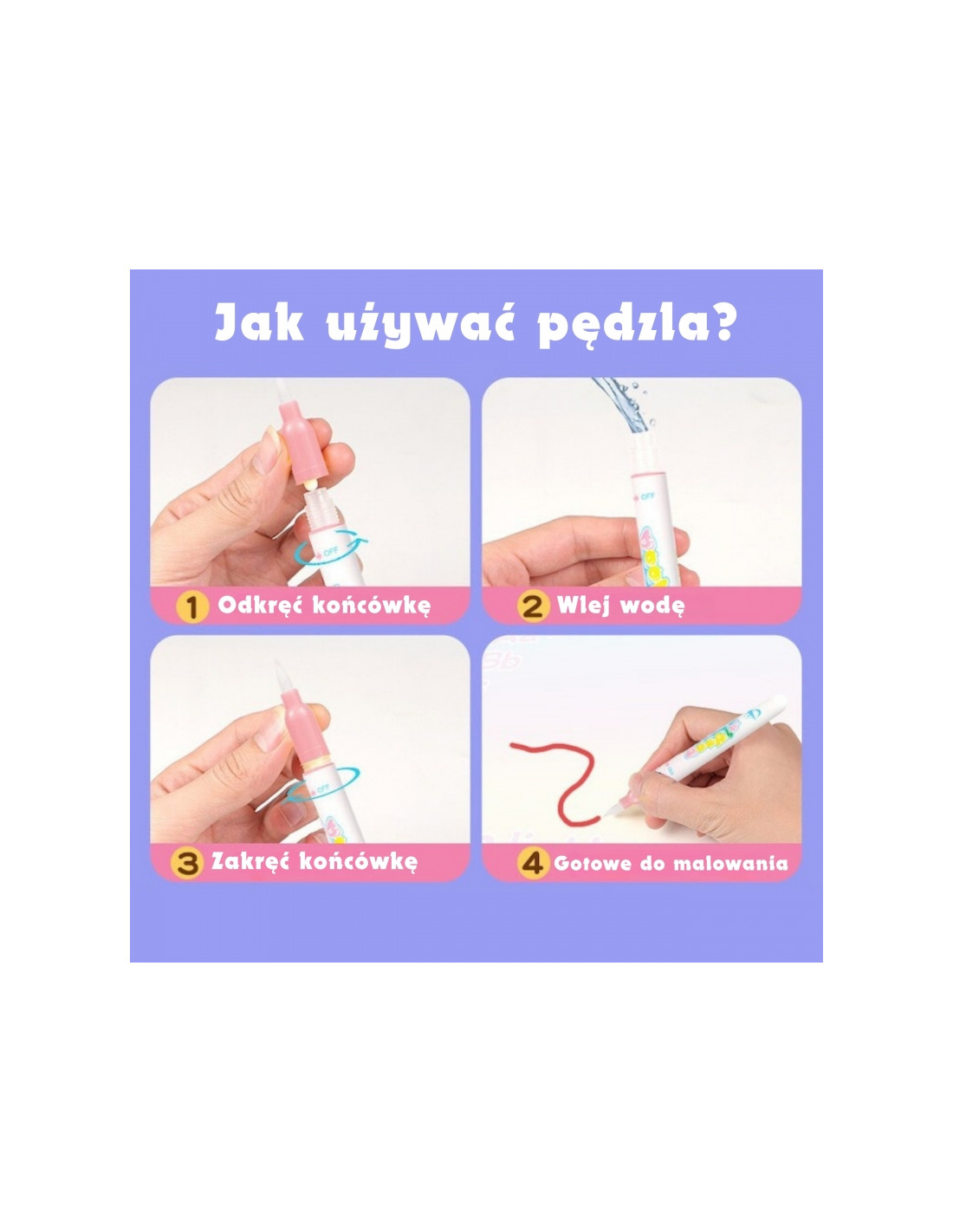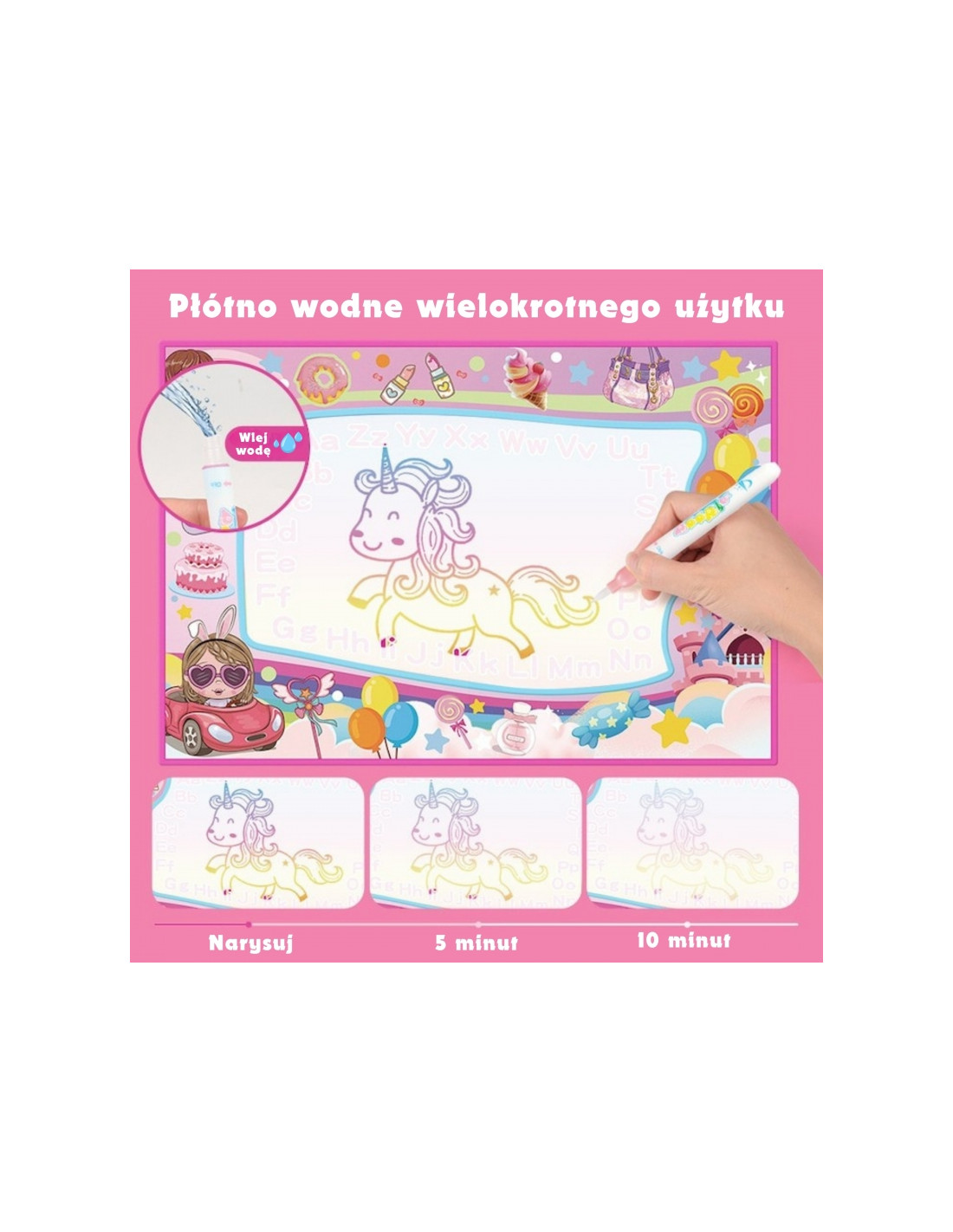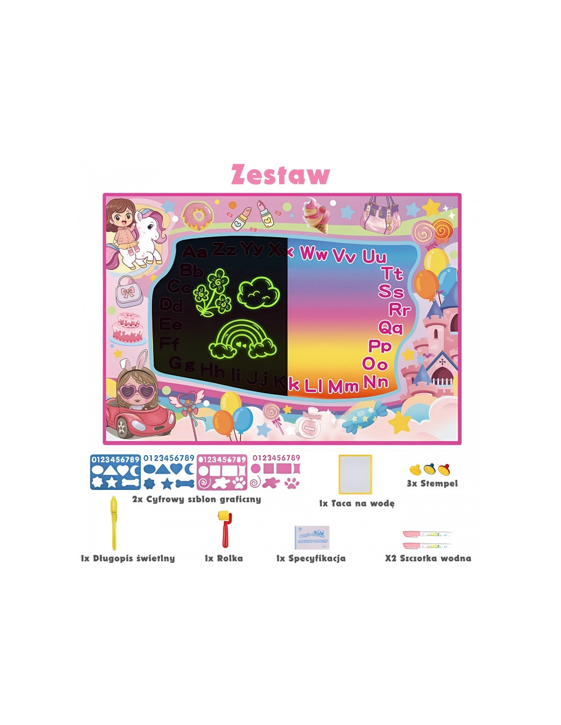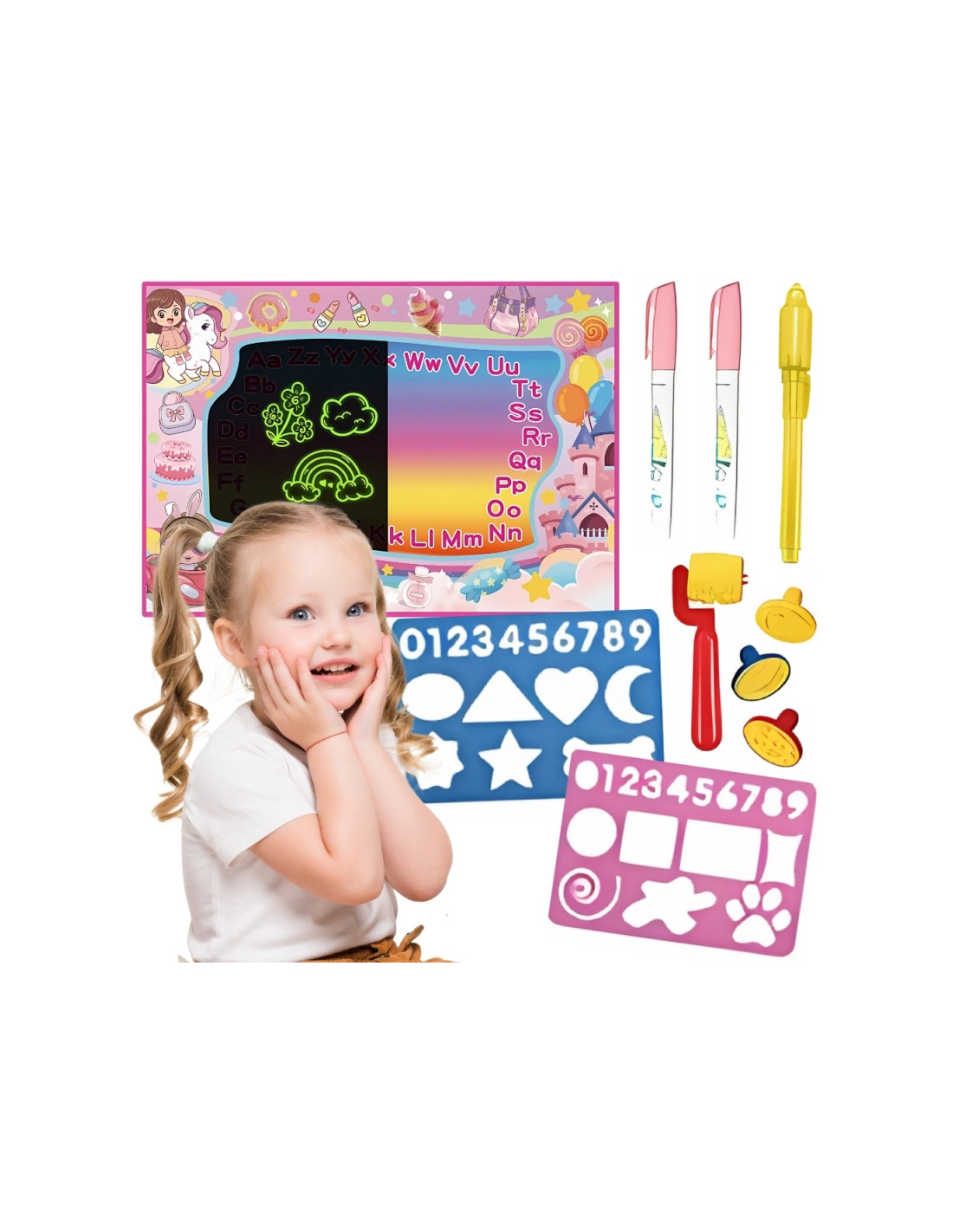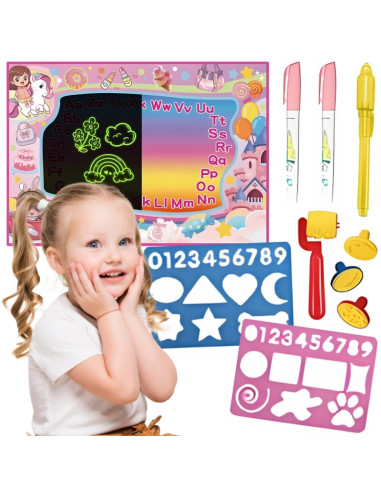 Įžiebkite savo vaiko vaizduotę su daugiafunkciniu vandens kilimėliu 2in1 by Woopie! Šis unikalus piešimo kilimėlis sujungia akvarelės ir piešimo UV šviesoje funkcijas. Po kelių minučių piešiniai pamažu išnyksta, suteikdami vaikui galimybę be galo kurti naujus darbus. Pasakų mergaitiška tema, kupina balionų, vienaragių, pilių ir žvaigždžių, nukels jūsų vaiką į magišką kūrybiško žaidimo pasaulį. Tereikia šiek tiek vandens, kad sukurtumėte spalvingus šedevrus – jokio rašalo, nešvarumų, jokios žalos rizikos. Puikiai tinka žaisti vienam arba su broliais ir seserimis, draugais ar tėvais. Kilimėlis gerina rankų įgūdžius, rankų ir akių koordinaciją ir yra puikus būdas mokytis žaidžiant. Jis gali būti naudojamas tiek namuose, tiek sode.