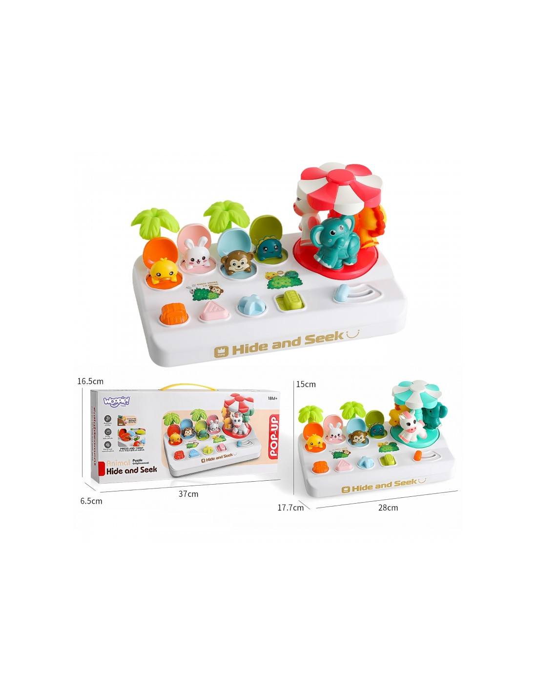 Interaktyvus edukacinis žaislas „Wopie“ prekės ženklo „Iššokantys gyvūnai - Slėpynės“ yra tikras hitas tarp žaislų patiems mažiausiems. Tai ne tik spalvingas vizualinis atrakcionas, bet, svarbiausia, gerai apgalvota priemonė, padedanti įvairiapusiškai vystytis vaikams. Derinant klasikinio žaidimo elementus su moderniais edukaciniais sprendimais, žaislas veiksmingai padeda lavinti mažylių motorinius, pažintinius ir sensorinius įgūdžius. Rinkinį sudaro keturi žavingi gyvūnai, paslėpti po spalvingais atvartais. Kiekvienas gyvūnas slepiasi atskirame skyriuje, aktyvuojamas įvairiais mechanizmais – paspaudus, sukant arba stumdant. Be to, yra karuselė su trimis gyvūnais, kuri sukasi pajudinus svirtį. Šios įvairios sąveikos formos moko vaikus priežasties ir pasekmės ryšių, stiprina susikaupimą ir skatina rankų bei koordinacijos vystymąsi. Žaidimas yra nepaprastai įtraukiantis ir lavina gebėjimą atpažinti formas ir spalvas. Kiekvienas mygtukas turi unikalią formą (pvz., žvaigždė, trikampis, kvadratas) ir atitinka konkretų gyvūną. Tai padeda vaikams lavinti loginį mąstymą ir gebėjimą derinti formas. Pagaminta iš netoksiškų, patvarių ir saugių medžiagų, atsižvelgiant į detales ir vaikų saugumą. Visi kraštai yra užapvalinti, o mechanizmai yra spyruokliniai, be baterijų, todėl žaislas yra visiškai mechaninis ir ekologiškas. Dėl kompaktiško dydžio ir tvirtos konstrukcijos jis puikiai tinka tiek namams, tiek kelionėms – jis patogiai telpa ant stalo, lagamine ar ant vaiko kelių. Savybės: