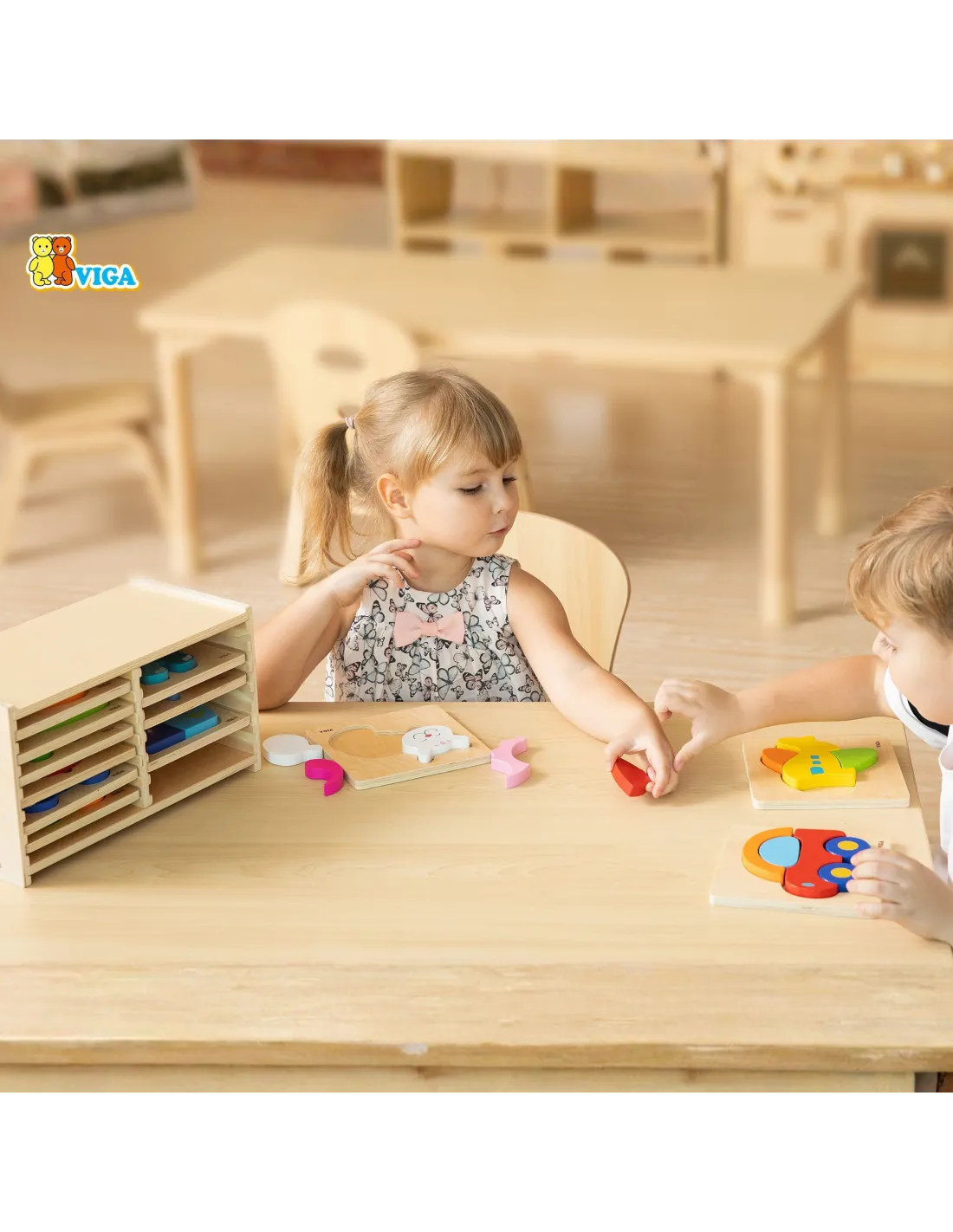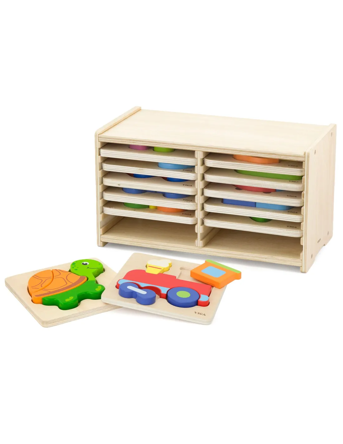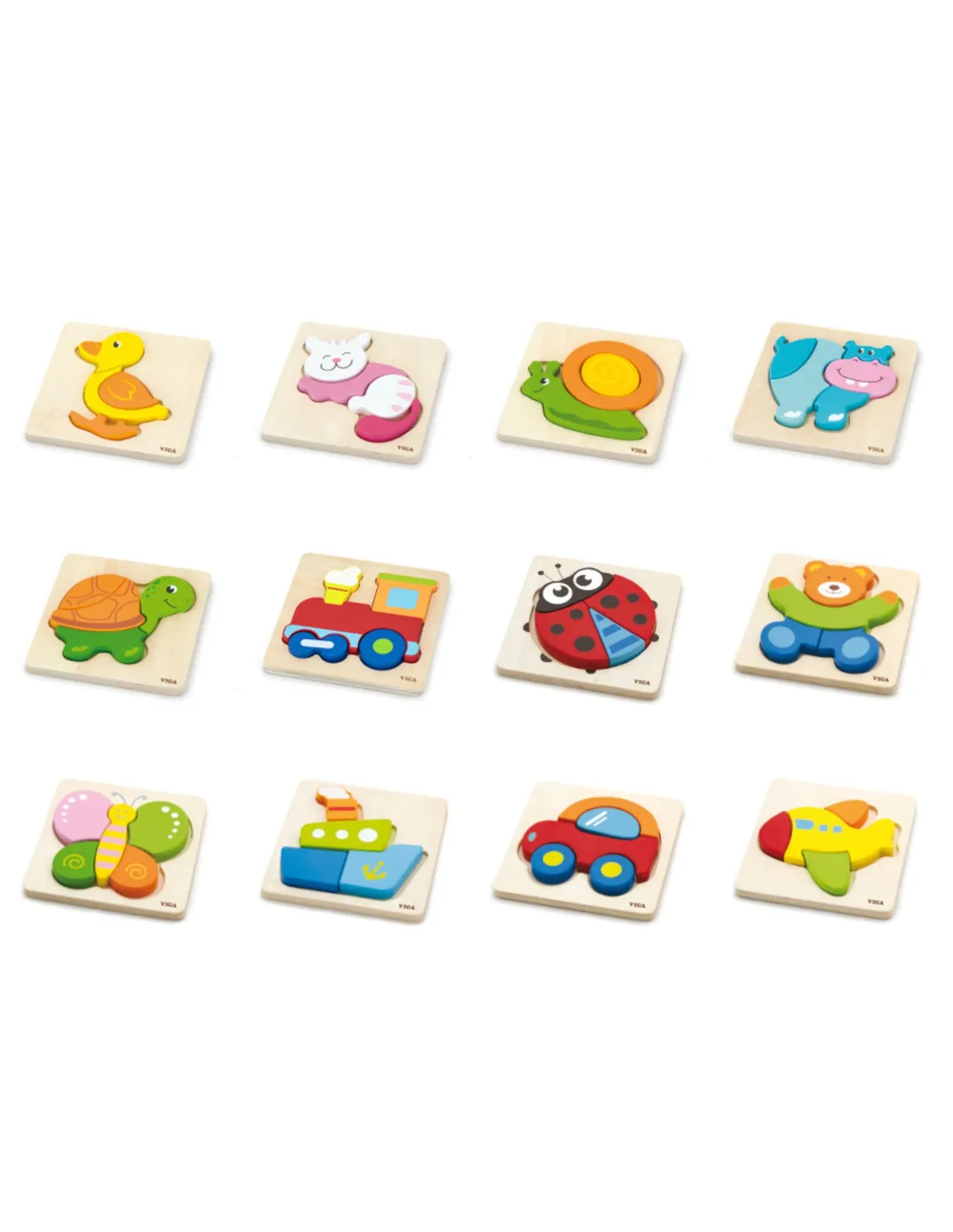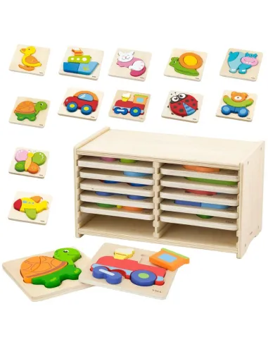 Leiskite savo vaikui pasinerti į kūrybinio žaidimo pasaulį su „Viga“ medinėmis dėlionėmis. 12 spalvingų lentelių su paprastomis formomis ir žavingais paveikslėliais skatina surinkimą ir eksperimentavimą. Vaikų užduotis – sudėti detales į teisingas vietas, o tai lavina rankų įgūdžius ir loginį mąstymą. Saugi, lakuota mediena ir ryškios spalvos daro žaidimą ne tik malonų, bet ir visiškai saugų. Idealus būdas mokytis žaidžiant ir suteikti pirmąją patirtį su dėlionėmis.