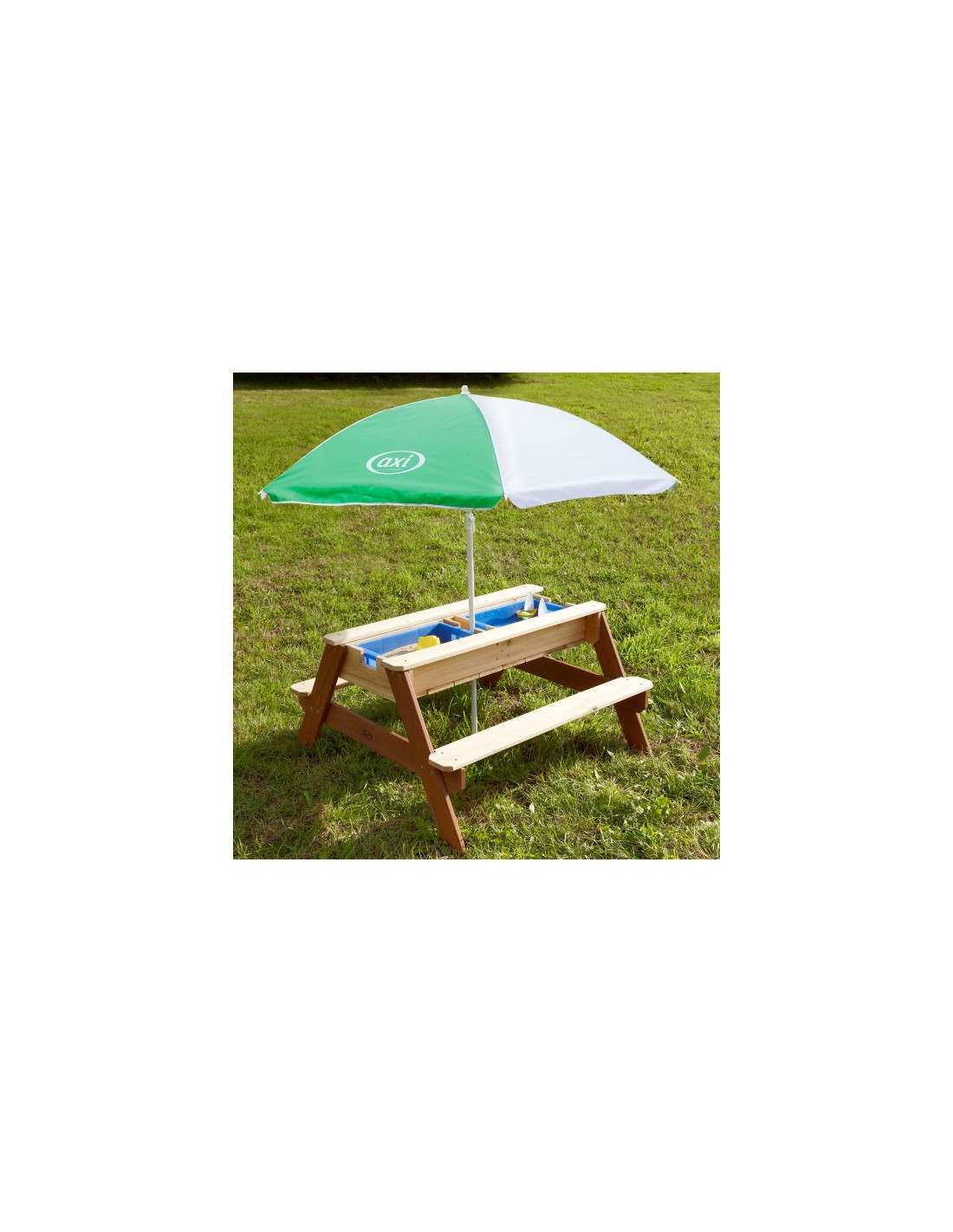 Garsaus prekės ženklo AXI „Nick“ pikniko stalas yra daugiafunkcis stalas su slaptu skyriumi ir dviem mėlynais konteineriais po nuimamu stalviršiu. Šiuos mėlynus konteinerius galima pripildyti smėliu ir (arba) vandeniu, tačiau, žinoma, juose taip pat galima laikyti žaislus. Be to, konteineriai yra nuimami , todėl juos lengva valyti. Klasikinis smėlio ir vandens derinys visada tinka vaikams! Akimirksniu smėlio ir vandens stalą galite paversti pikniko stalu, prie kurio vaikai galės kurti, piešti ar mėgautis skanėstais.