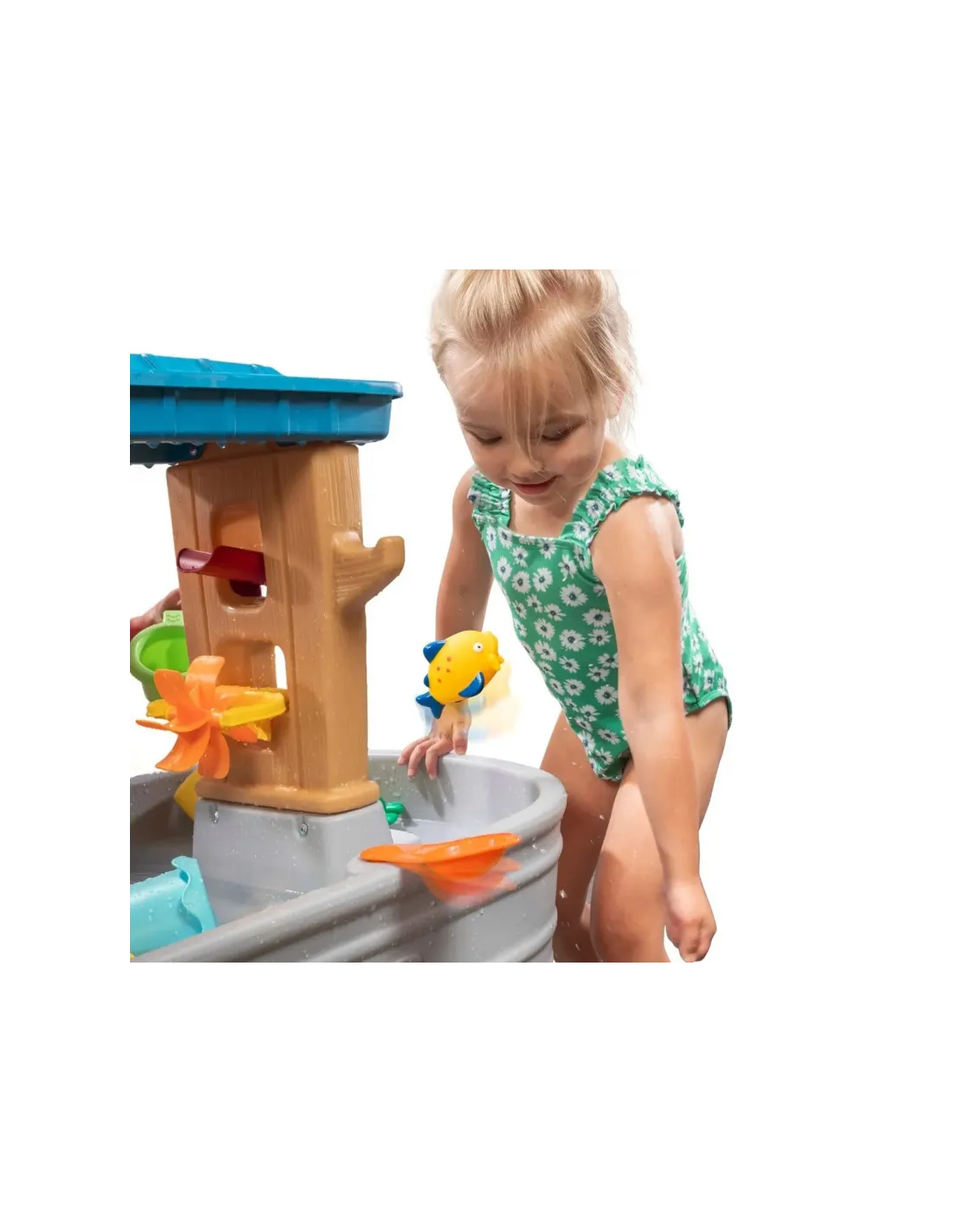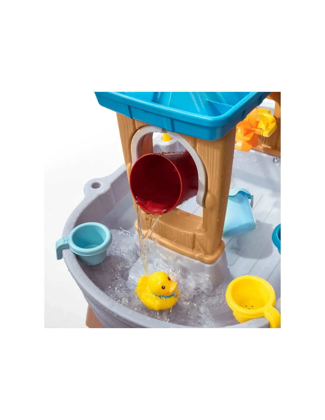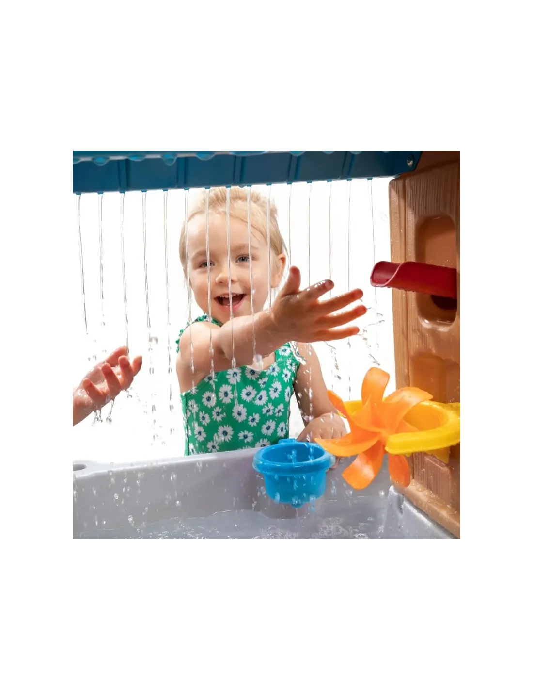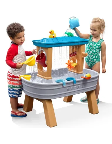 Visapusiškos vandens pramogos prasideda nuo mielo vaikiško vandens stalo. Palepinkite save linksmybėmis vandenyje. Apverčiamas padėklas sukuria tikrovišką lietaus efektą – tiesiog užpilkite vandens, kad pramogos prasidėtų! Vanduo iš ant viršaus padėto padėklo sukuria tikrovišką lietaus efektą. Iš vienos pusės jis taip pat perpildomas į kibirą, kuris, pripildęs, sukasi ir išpila vandenį, o kitoje pusėje yra latakas, nukreipiantis vandenį tiesiai į besisukantį ventiliatorių. Rinkinyje taip pat yra iššokantys langai augintiniams, kibiro laikiklis ir sietelis. Visa tai nusileidžia į irklavimo baseiną pačiame apačioje.