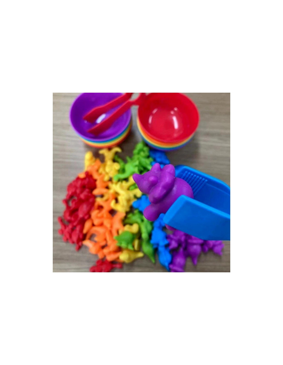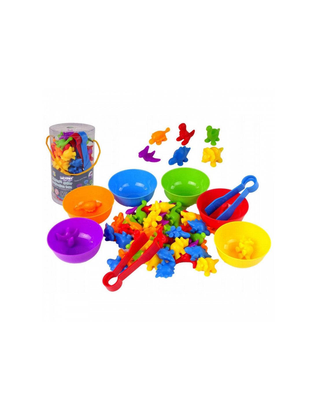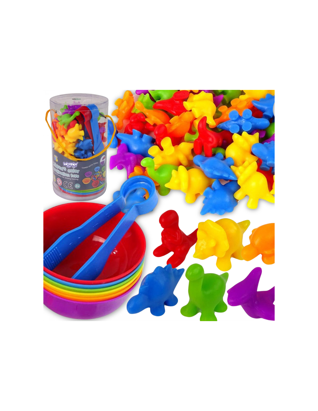 WOOPIE mokomasis žaislas " Dinozaurų rūšiuoklis " yra paprasta, bet veiksminga mokymosi ir žaidimo priemonė. Žaidimo metu visos figūrėlės sudedamos į vidurį, o tada žnyplėmis kiekviena figūrėlė perkeliama į atitinkamą dubenėlį. Be to, žaislas turi daugybę edukacinių paskirčių. Figūrėlės gali būti naudojamos ne tik mokytis spalvų, bet ir mokyti skaičiuoti. Vienu metu su rinkiniu gali žaisti du vaikai ir mokytis dalytis ir bendradarbiauti arba varžytis dėl laiko. Rinkinys yra puiki alternatyva standartiniam mokymo būdui - mokymasis žaidžiant!