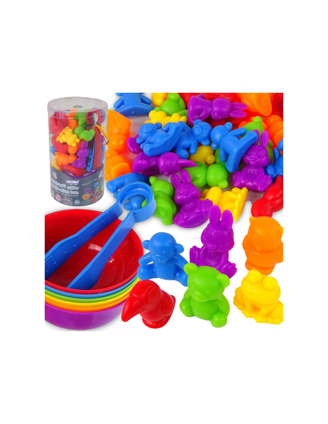" WOOPIE" prekės ženklo žaislas "Edukacinis rūšiuoklis - gyvūnai " yra paprasta, bet veiksminga mokymosi ir žaidimo priemonė. Žaidimo metu reikia išmesti visas figūrėles į vidurį, o tada žnyplėmis perkelti kiekvieną figūrėlę į reikiamą dubenėlį. Be to, žaislas turi daugybę edukacinių paskirčių. Figūrėlės ne tik moko spalvų, bet ir gali būti naudojamos skaičiuoti. Vienu metu su rinkiniu gali žaisti du vaikai ir mokytis dalytis, bendradarbiauti arba varžytis dėl laiko. Rinkinys yra puiki alternatyva standartiniam mokymo būdui - mokymasis žaidžiant!