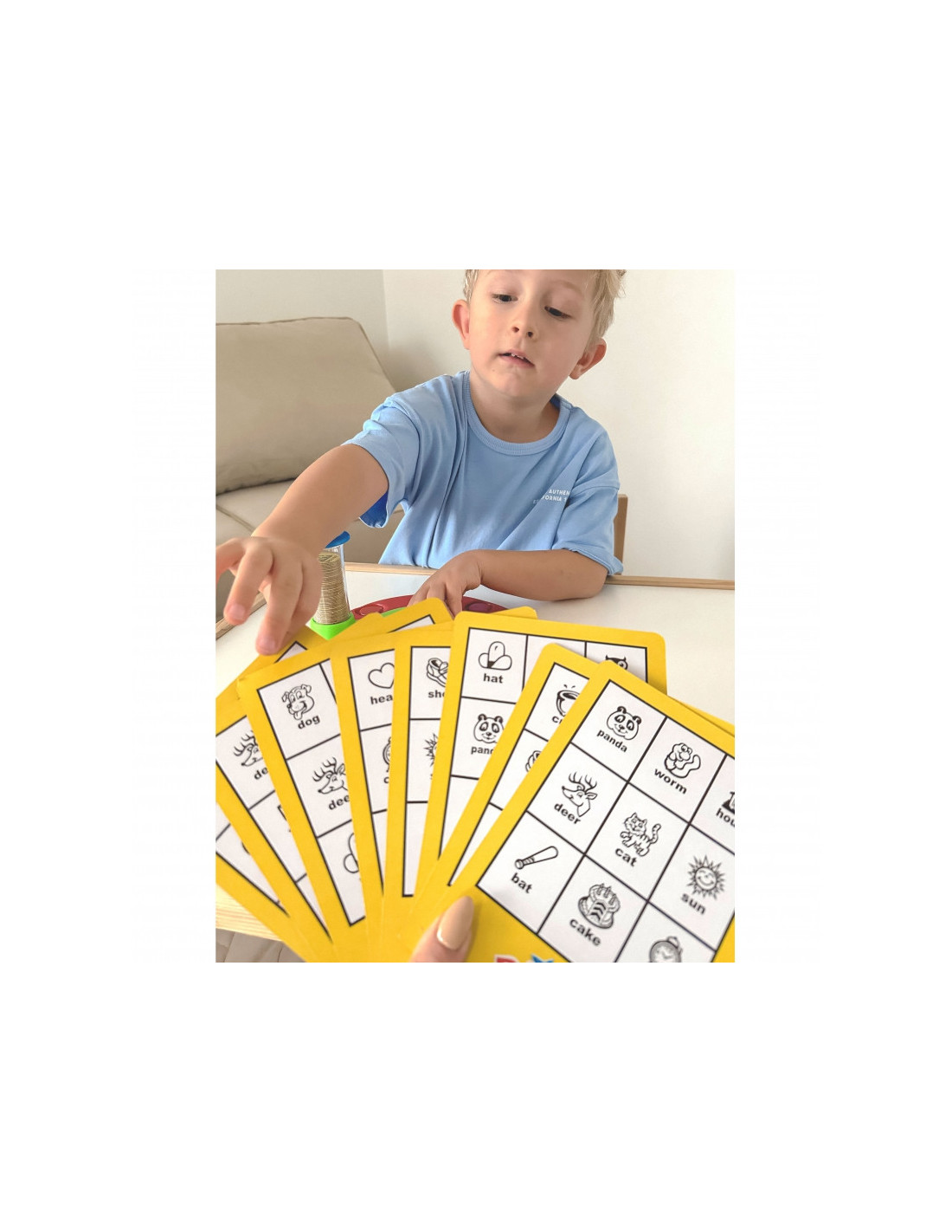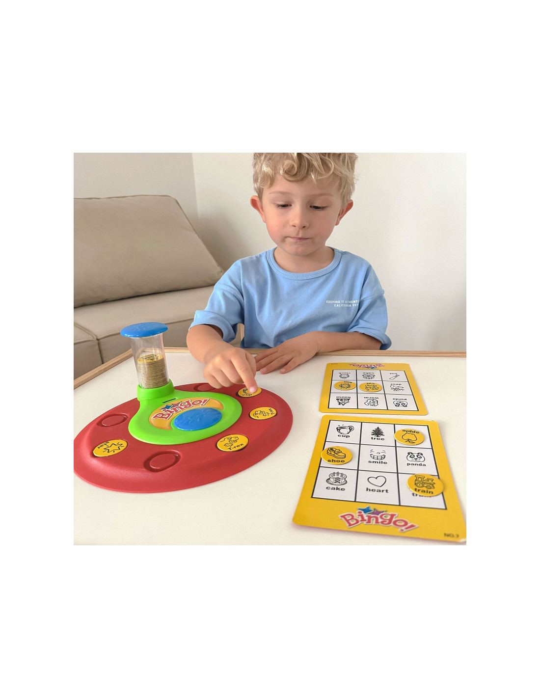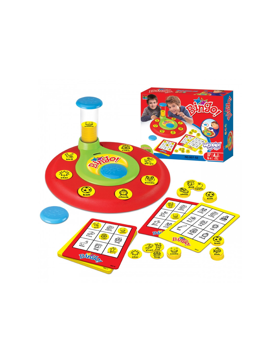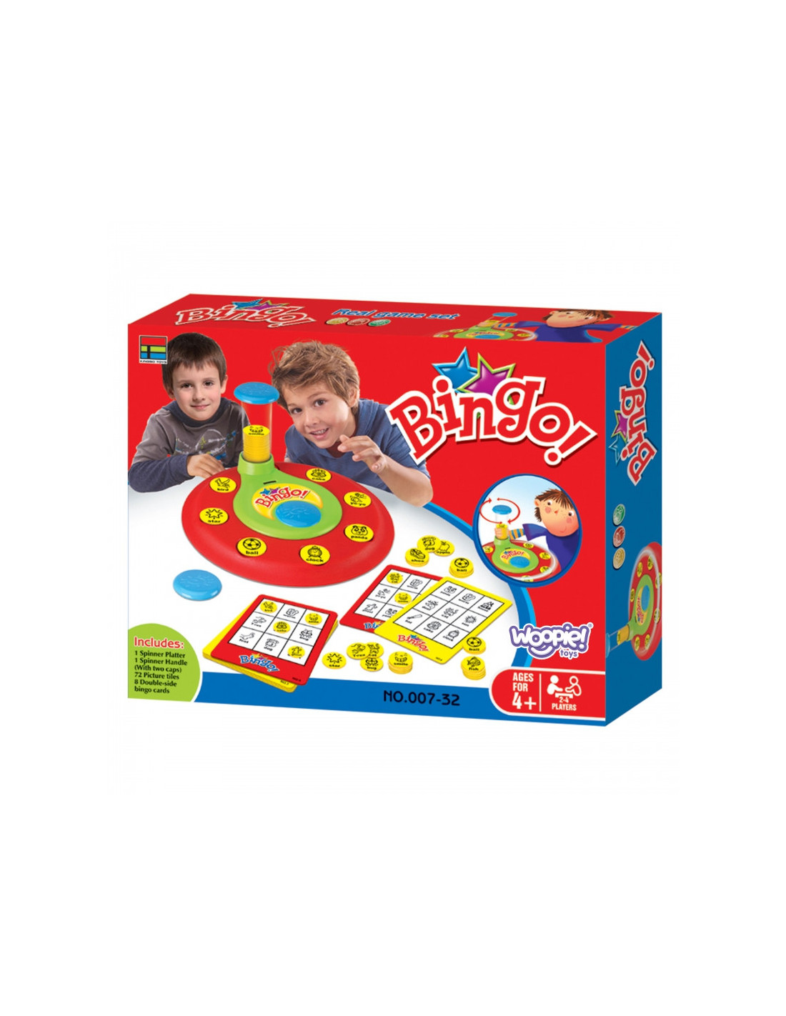 Gra BINGO od marki Woopie jest idealna na przedszkolaków i uczniów, ponieważ wykorzystuje zarówno obrazy jak i słowa. Gra polega na przesunięciu koła Bingo aby uwolnić siedem żetonów podczas jednego obrotu kołem gry. Gdy gracze zauważą żeton pasujący do obrazka na swojej karcie słownie wskazuje nazwę przedmiotu na obrazku, chwytają odpowiedni żeton i umieszczają go na karcie przy odpowiednim obrazku. Pierwszy gracz który zakryje wszystkie obrazki na swojej karcie pasującymi żetonami, krzyczy BINGO i wygrywa grę.