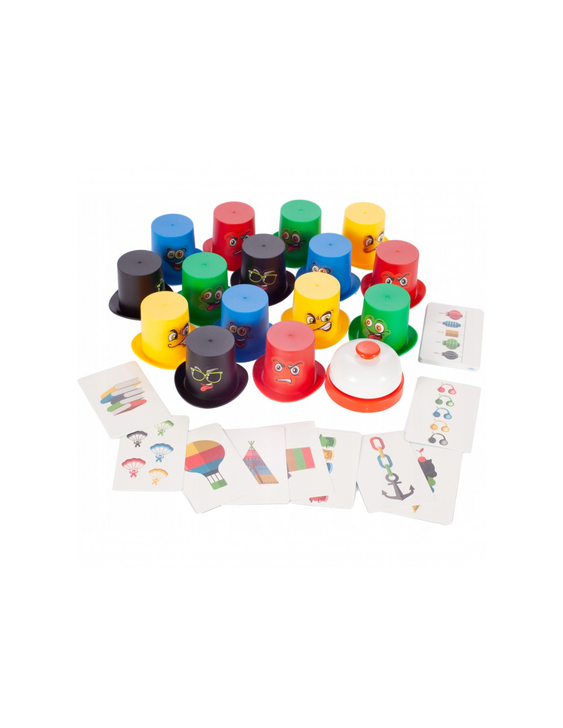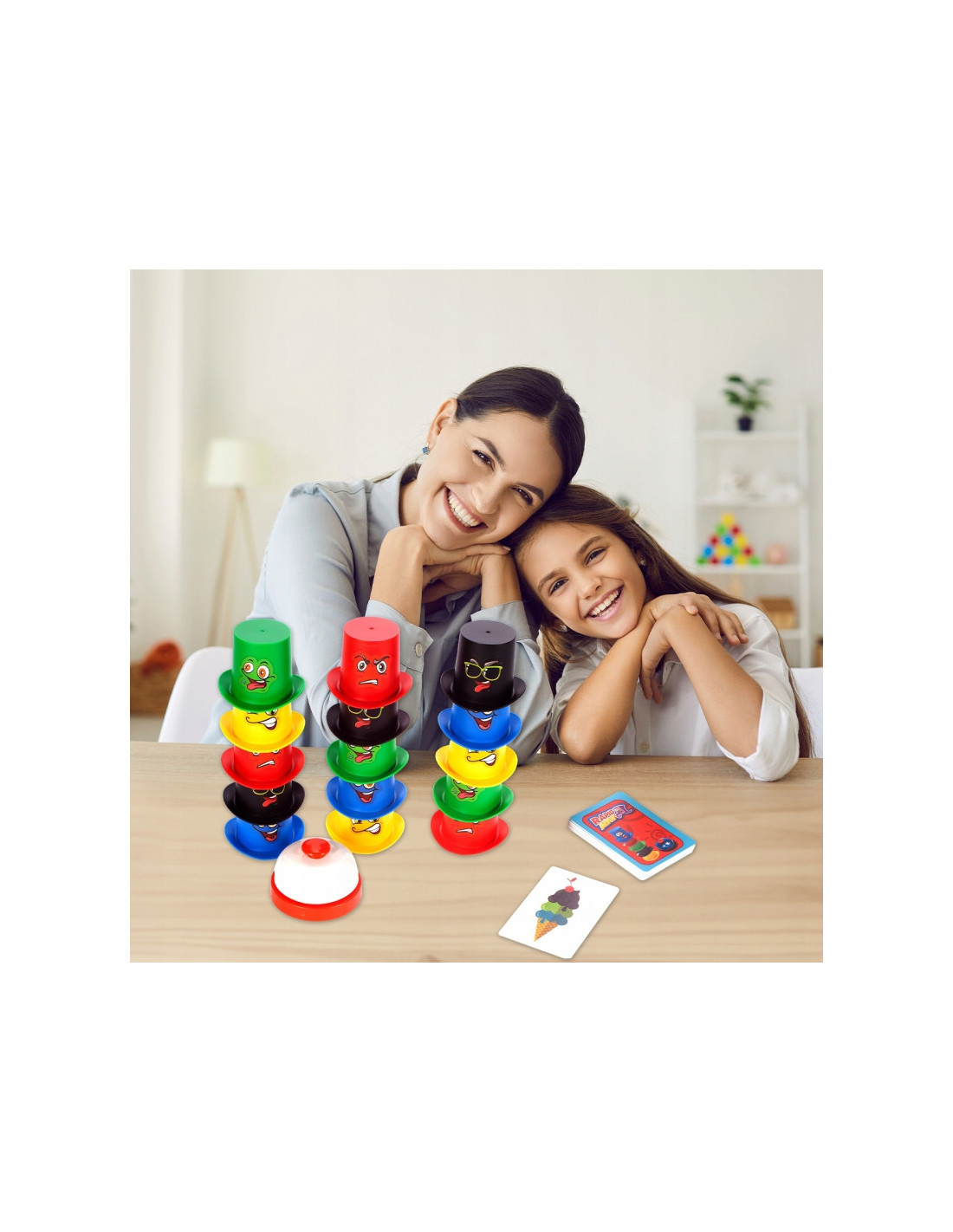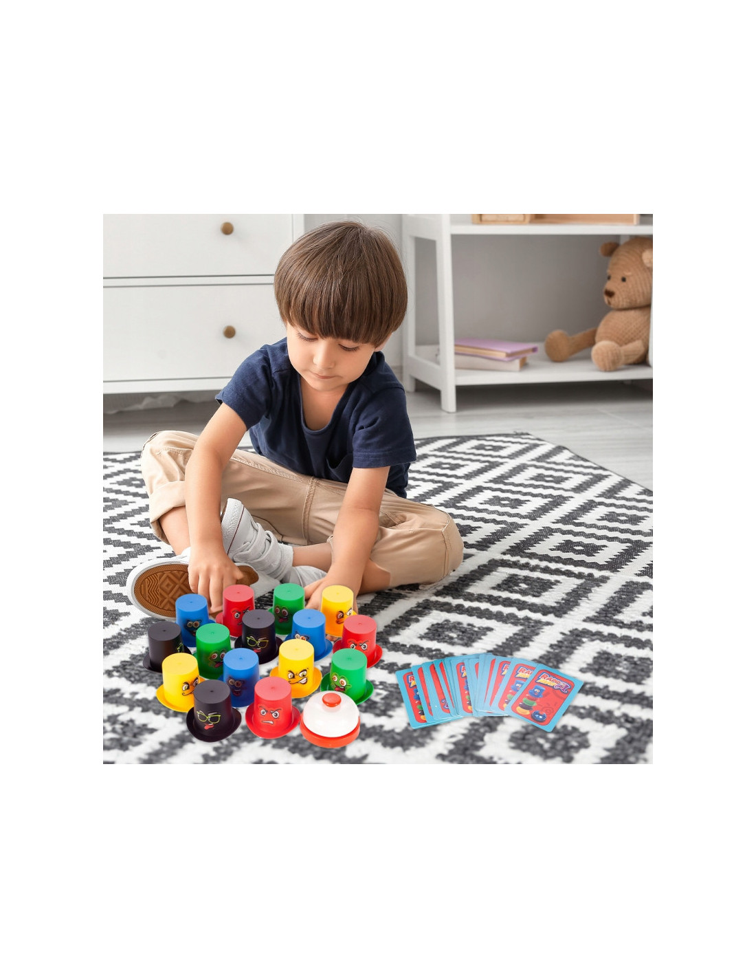 Każdy z graczy otrzymuje 5 różnokolorowych kubeczków i musi jak najszybciej ułożyć je w kolejności pokazanej na karcie z rysunkiem. Ta wskazuje, czy kubki mają być ułożone obok siebie, czy ustawione jeden na drugim. Zadanie wykonane? Czas jak najszybciej zadzwonić dzwonkiem! Najbardziej spostrzegawcza osoba zostanie zwycięzcą. W grę może grać od 2 do 4 osób.