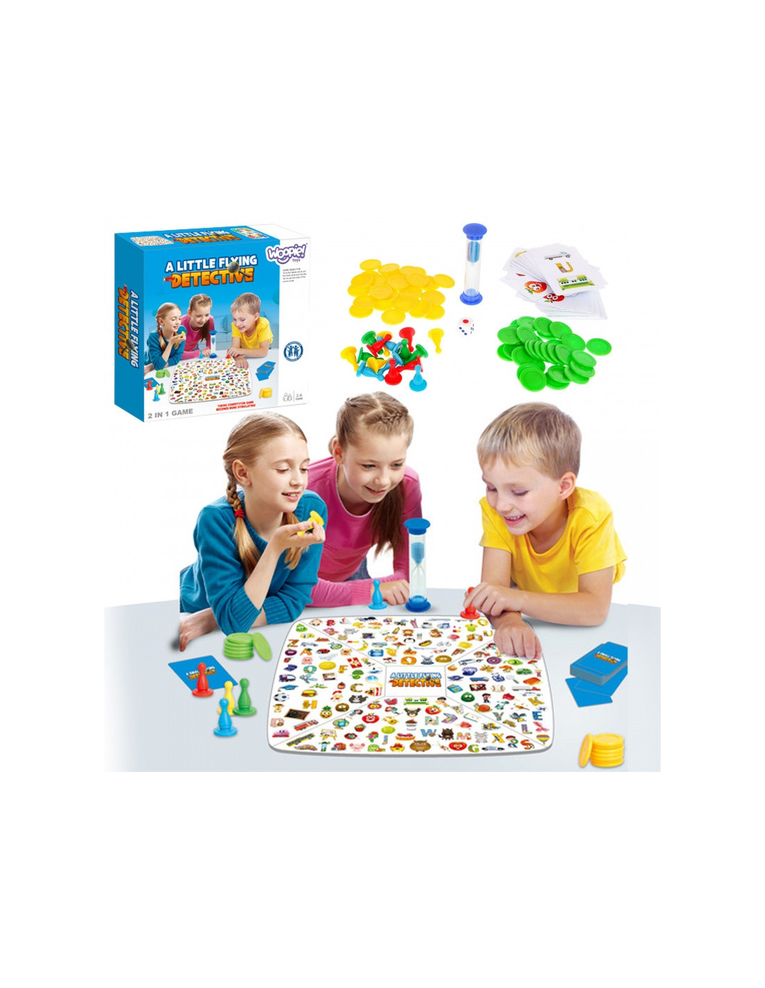 Gra Planszowa 2w1 Mały Detektyw + Chińczyk od marki WOOPIE to zestaw dwóch gier planszowych w jednym pudełku. Z jednej strony dynamiczna gra Mały Detektyw, a z drugiej klasyczny, uwielbiany przez pokolenia Chińczyk! To doskonały wybór na rodzinne popołudnia, spotkania z przyjaciółmi lub prezent dla małego fana zagadek i planszówek. Gra przeznaczona jest dla dzieci od 4. roku życia i może być rozgrywana w gronie od 2 do 4 osób. Zestaw pełen kolorowych elementów i ciekawych zadań zapewnia godziny kreatywnej zabawy oraz wspiera rozwój spostrzegawczości, pamięci, refleksu i myślenia logicznego.Dzięki dołączonej klepsydrze dzieci uczą się działania pod presją czasu, a karty ze wskazówkami pobudzają wyobraźnię i rozwijają zdolności językowe. Całość została wykonana z bezpiecznych i trwałych materiałów, co gwarantuje długą i bezpieczną zabawę.