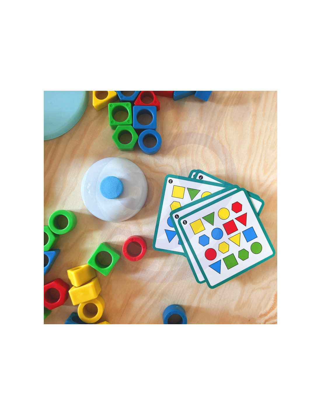 - Vaikas išdėlioja formas pagal raštą ir, baigęs, traukia kitas korteles.
