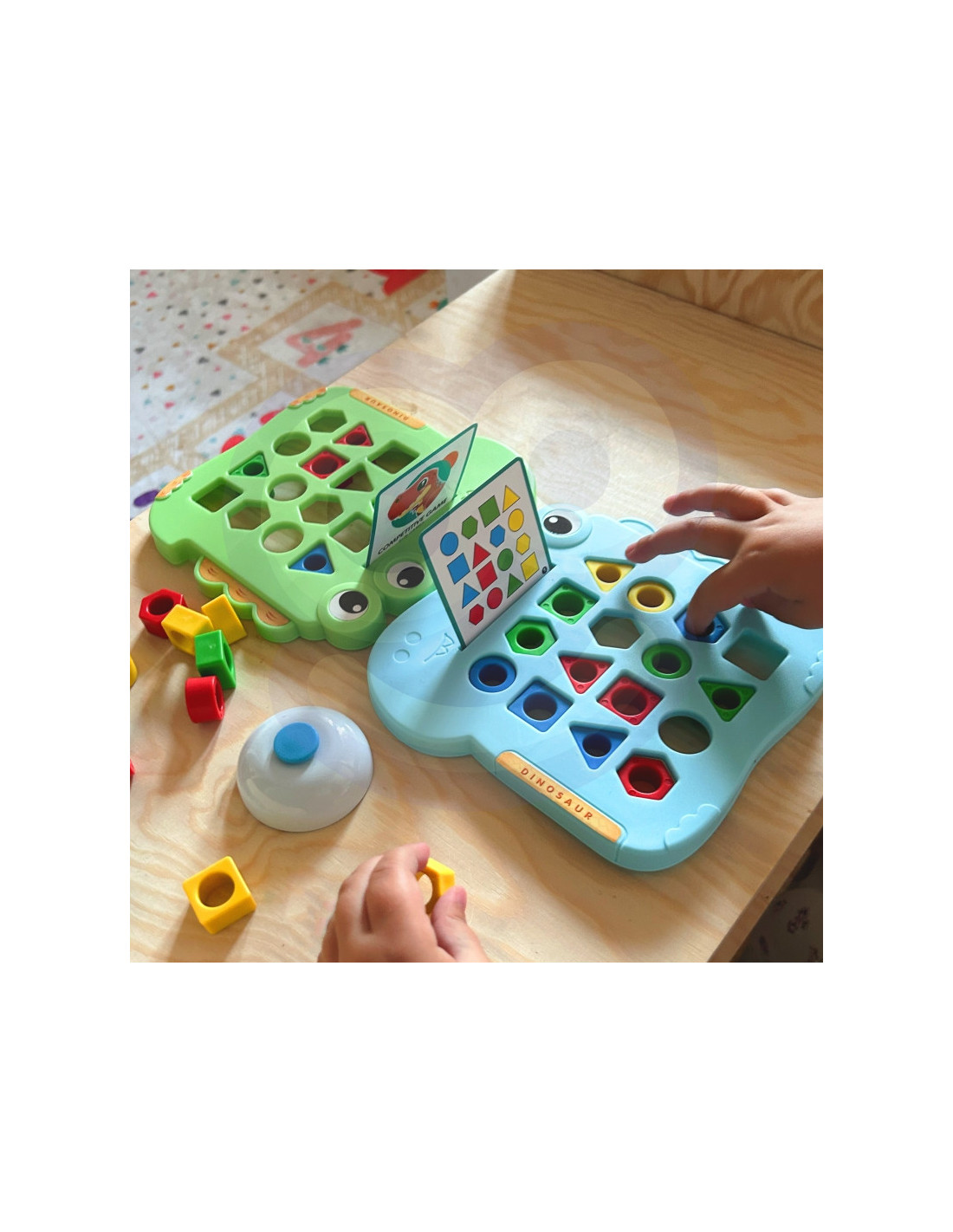 - Vaikas pasideda priešais save dinozaurų lentą, o šalia jos – kortelių krūvelę su figūrų konfigūracija.
