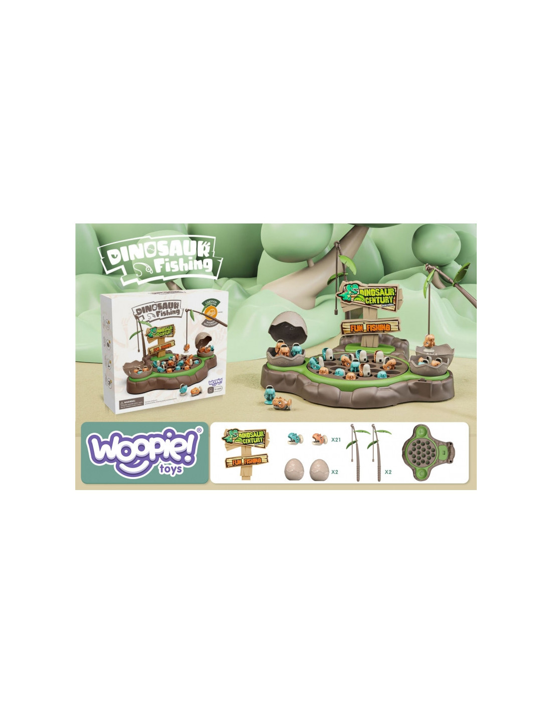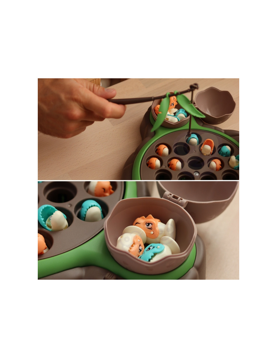 Łowienie dinozaurów rybek od marki WOOPIE zachęci do poznawania świata Na podstawie znajduje się ruchoma tarcza, z której można łowić małe dinozaury. Włącznik znajduje się na przodzie po prawej stronie. Jak guziczek ustawimy na środku, tarcza zacznie się obracać, gdy przesuniemy go do końca w prawo to usłyszymy przyjemną melodie, która będzie nam towarzyszyć podczas zabawy. Po bokach tarczy umieszczamy dwa zamykane jaja, gdzie możemy ukryć złowione dinozaury. Ta zabawka doskonale pobudza wyobraźnię, zachęca do kreatywnego i nieszablonowego myślenia, a także wspaniale rozwija zdolności manualne u najmłodszych, dodatkowo zapewnia wiele frajdy podczas nauki.