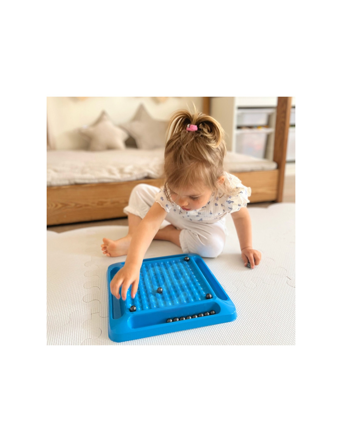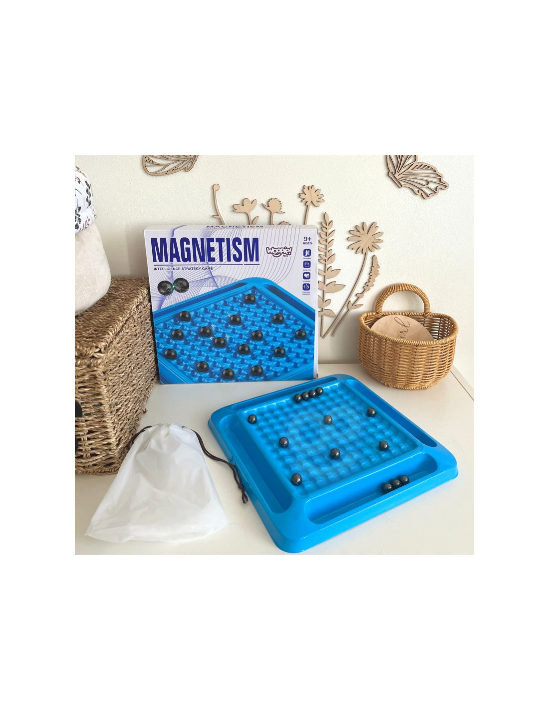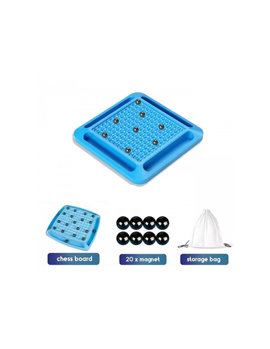 - Zestaw zawiera: 20 magnetycznych kulek, planszę do gry, z 4 półeczkami na magnesy, woreczek na kulki.