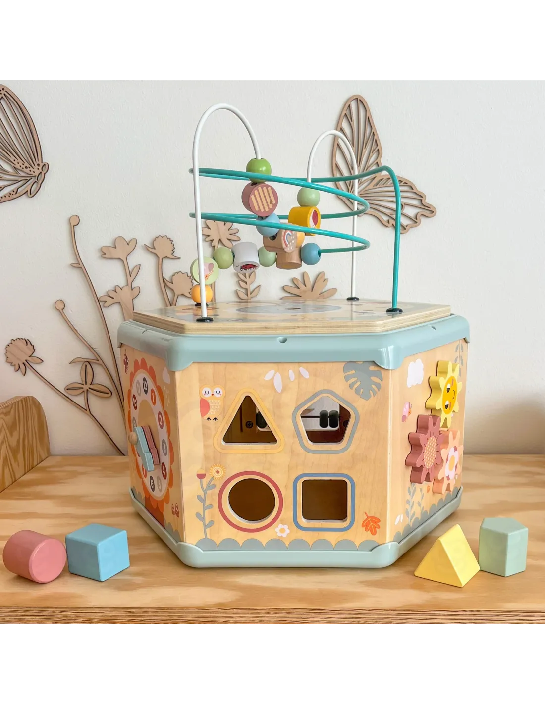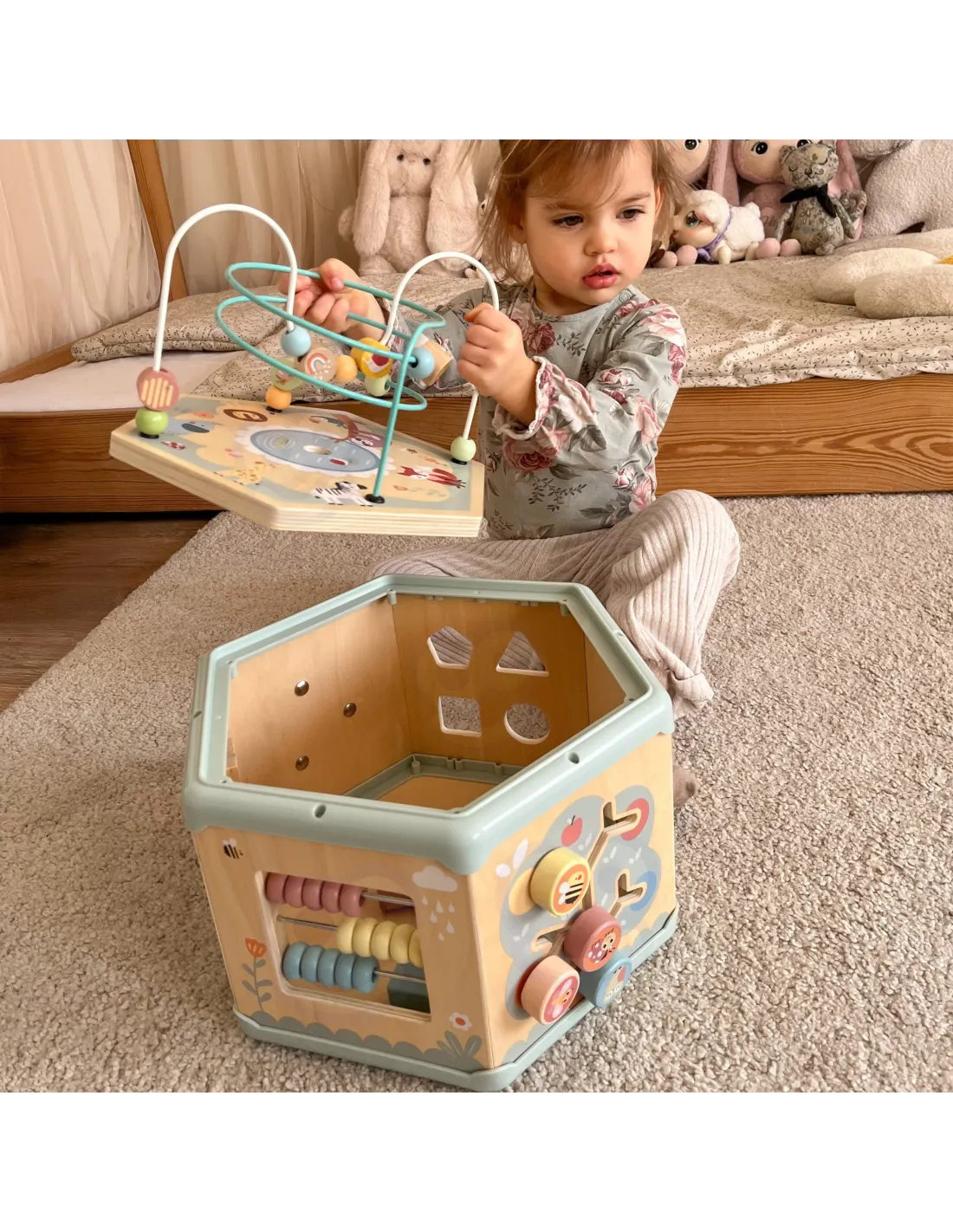 This wooden multifunctional hexagon with 7 activities from TOOKY TOY is an interactive educational toy that offers a wide variety of play options on each of its seven sides. Children can move beads through mazes, turn gears, match shapes, or learn about clockwork. The toy's meticulous craftsmanship encourages children to play. Additionally, the top opens to store their little one's toys.