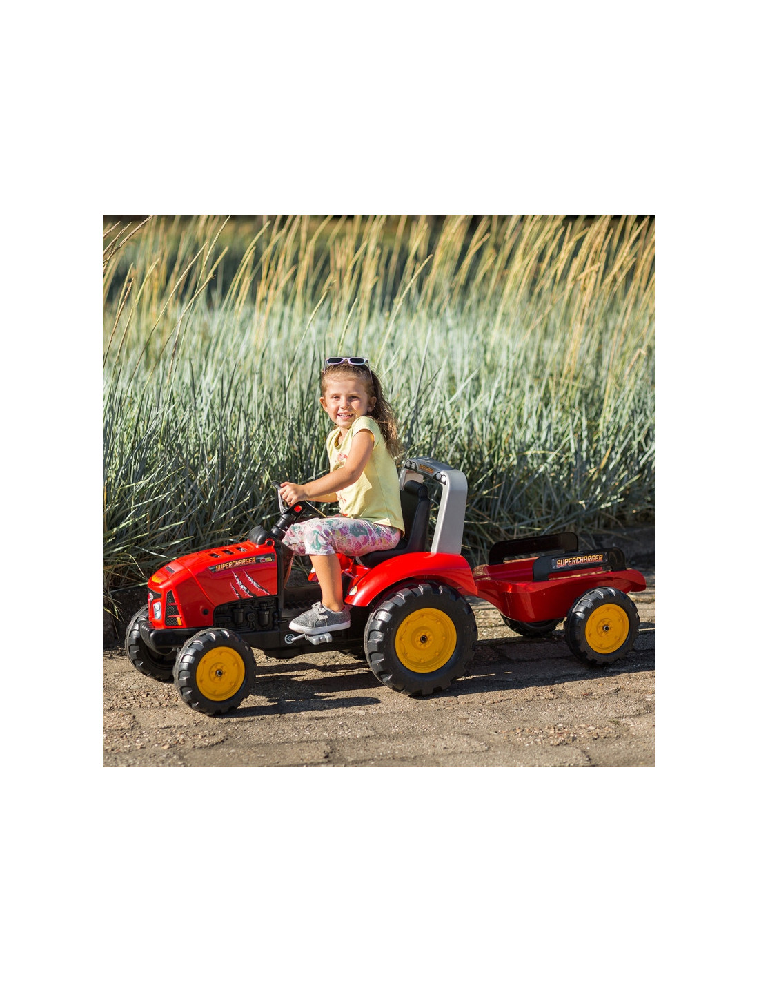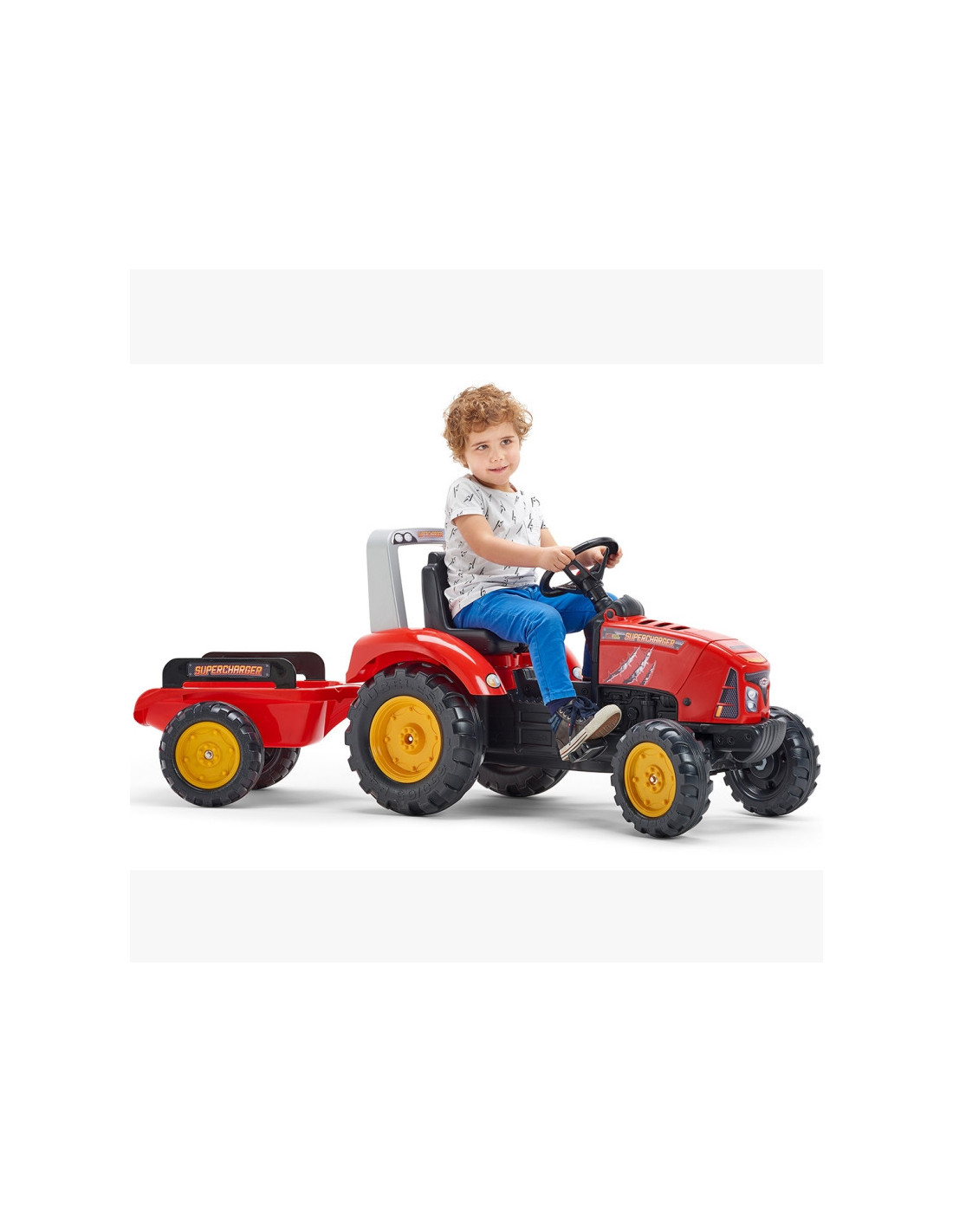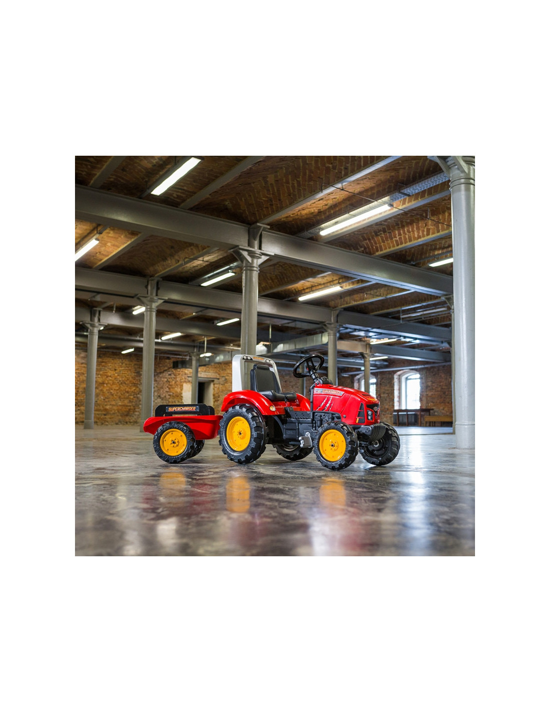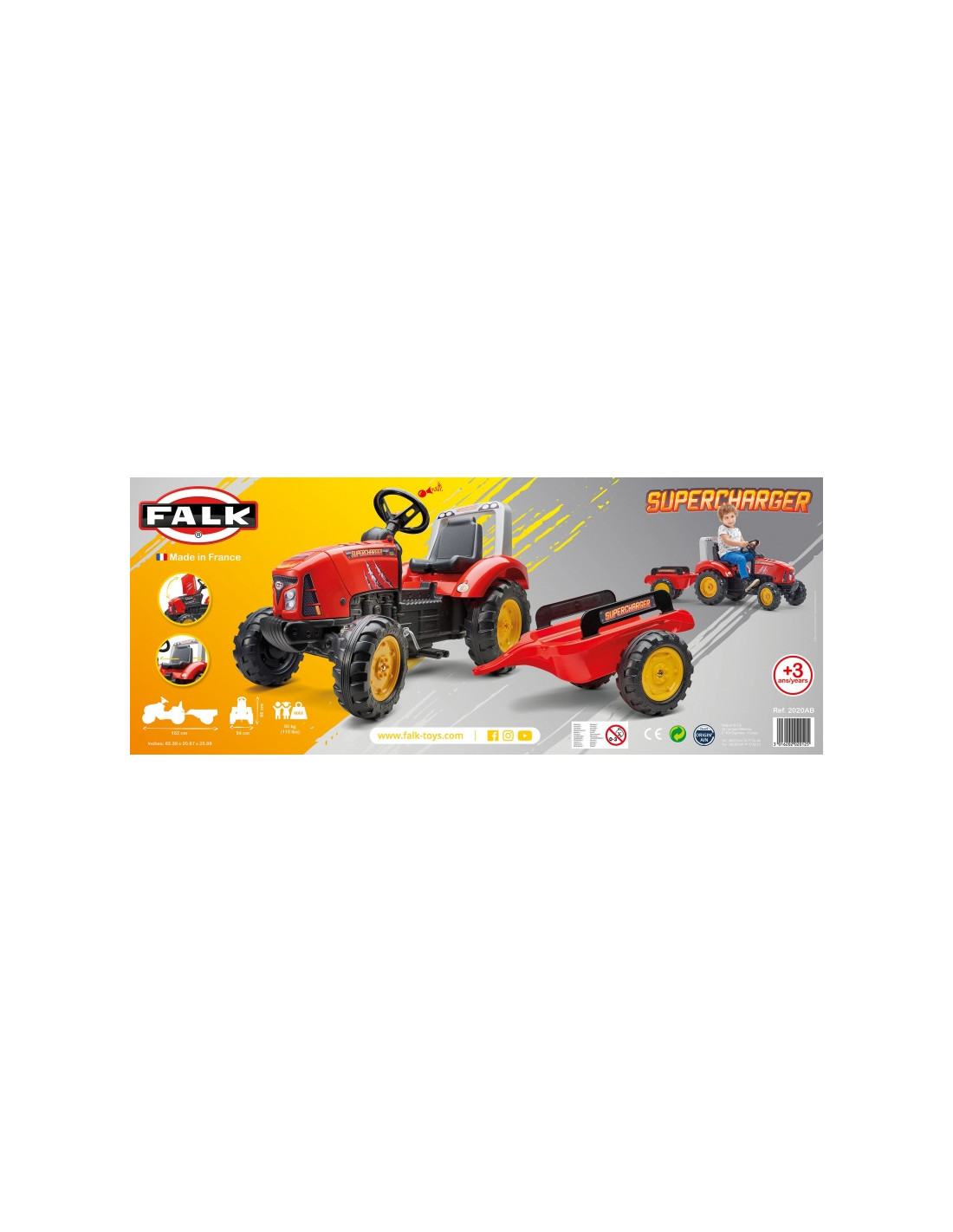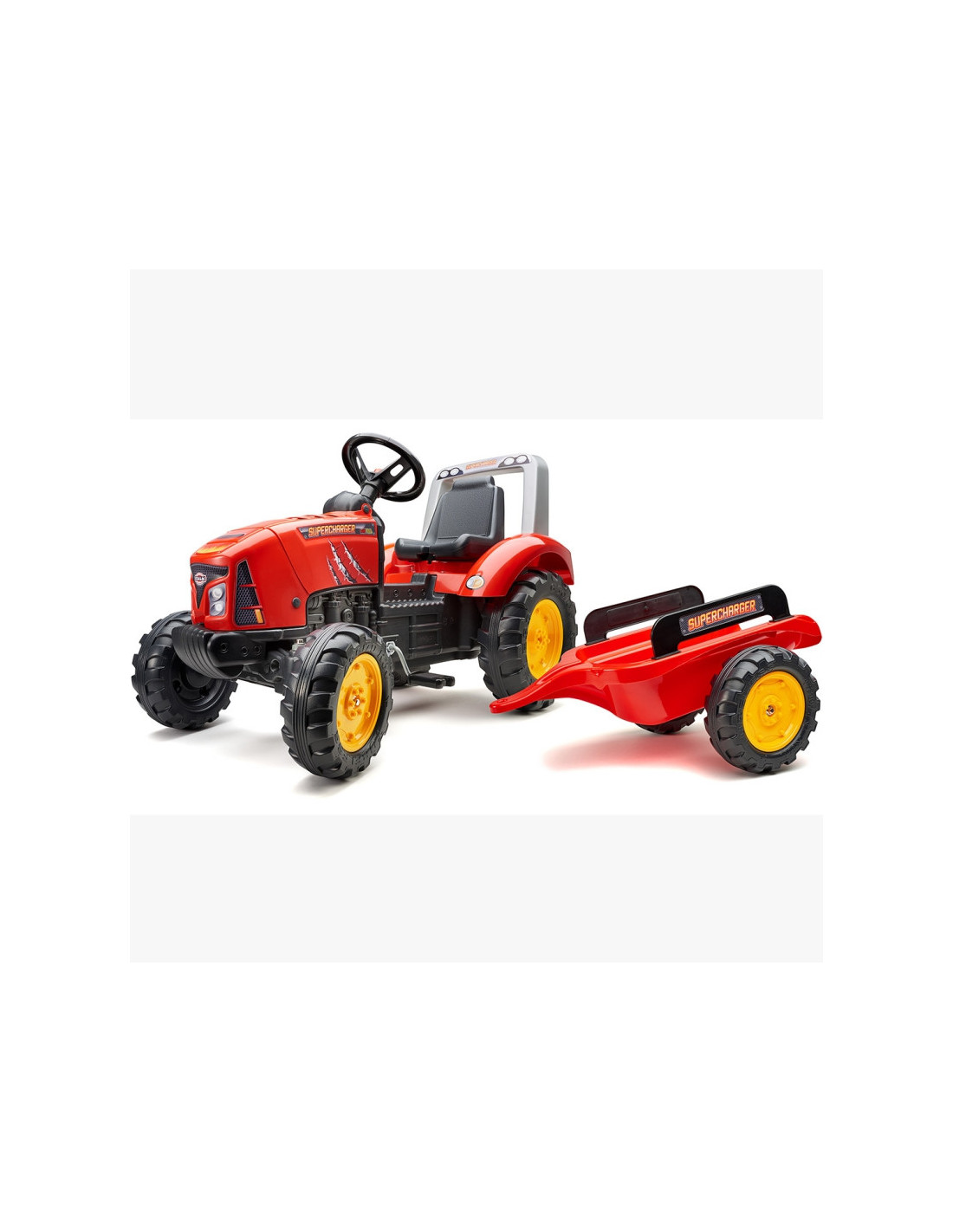 FALK pedalinis traktorius su raudona Supercharger priekaba yra daugelio mažų traktorių vairuotojų svajonės išsipildymas. Kruopščiai pagaminta, atkreipiant dėmesį į smulkiausias detales! Joks ūkininkas tokios transporto priemonės neniekintų. Transporto priemonė pagaminta iš aukščiausios kokybės plastiko, skirta vaikams nuo 3 metų. Transporto priemonėje yra nuimama priekaba su skydeliais ir vairas su garso signalu. Traktoriaus ratai pagaminti iš aukštos kokybės plastiko. Traktorius taip pat turi atidaromą gaubtą su tikro variklio imitacija.