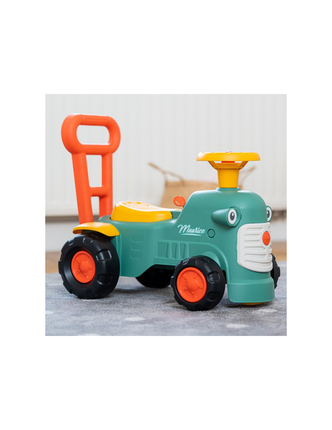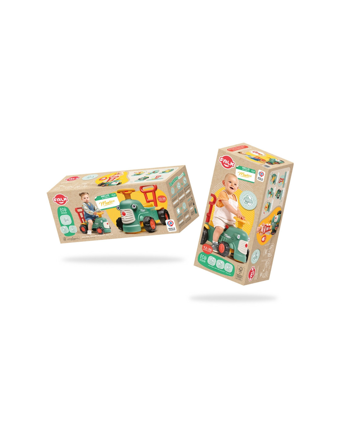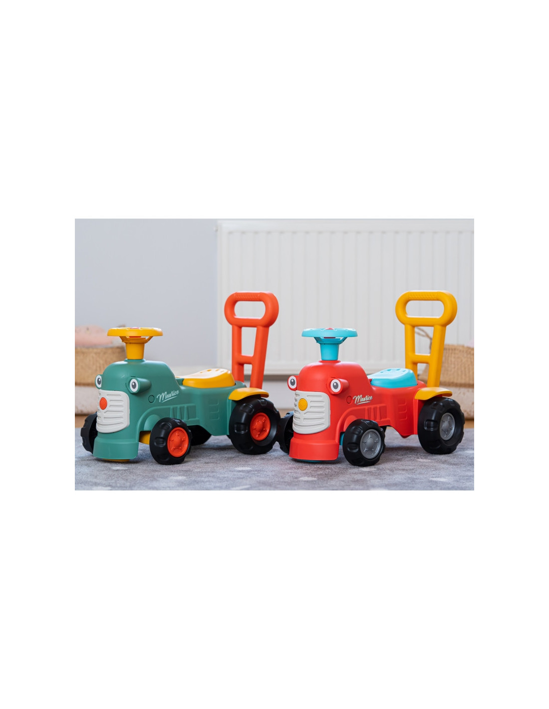 Maurice'as yra mielas prancūzų prekės ženklo "Falk" traktorius, kuris lydės pirmuosius jūsų vaiko žingsnius. Ryškios spalvos ir suapvalintos formos pradžiugins kiekvieną mažylį. Traktoriaus užvedimas maža garso rankenėle ir garso signalu ant vairo yra puiki pirmoji pamoka, kuri paskatins jūsų vaiko motorinius įgūdžius ir klausą . Važiuodamas jojimu, žaisdamas su vairu su ragu ir pasukamais ratais, vaikas lavins koordinaciją ir pusiausvyrą. Stovėdamas gale, jis gali naudoti ergonomišką atlošą, kad išmoktų vaikščioti žaidžiant, be baimės ir visiškai saugiai. Po sėdyne yra nedidelis daiktadėžė lobiams laikyti.