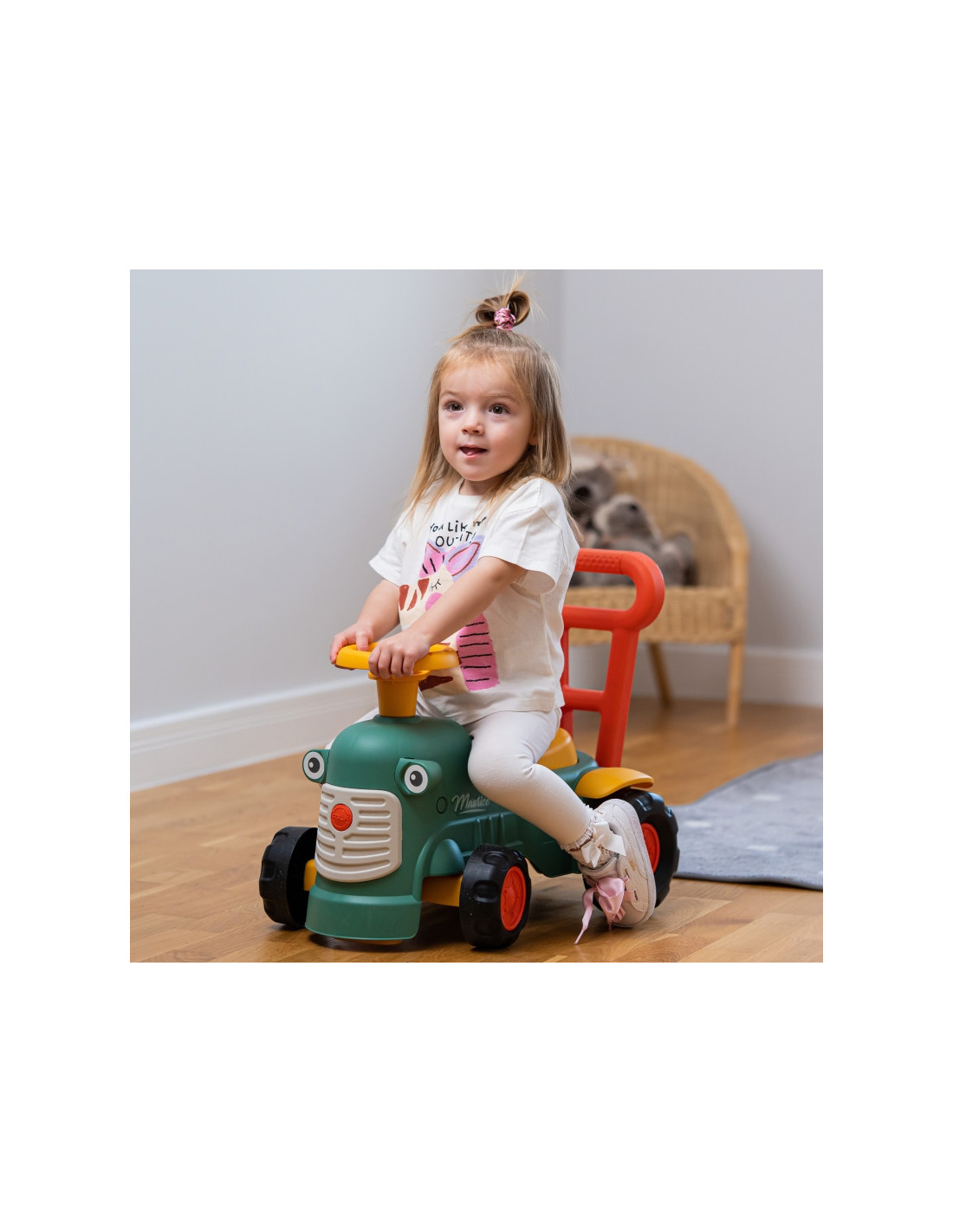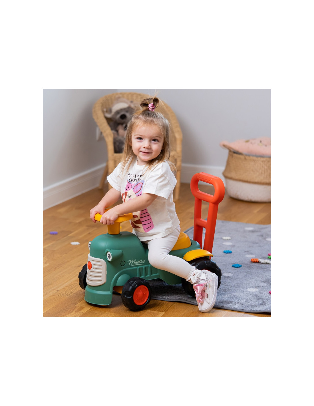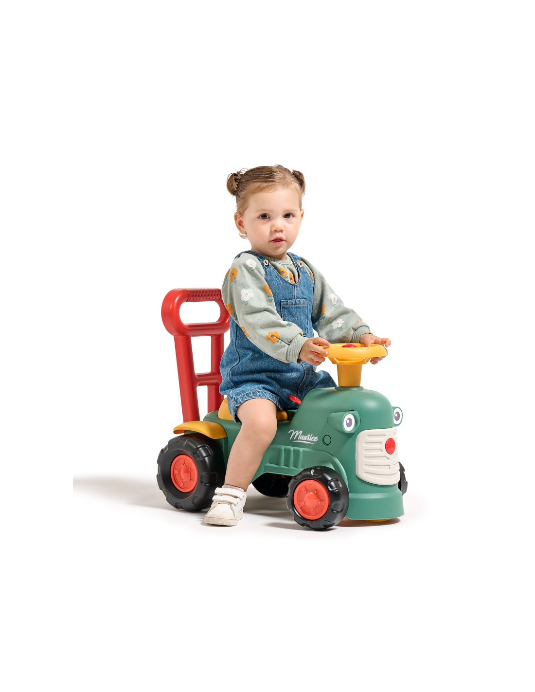 Maurice'as yra mielas prancūzų prekės ženklo "Falk" traktorius, kuris lydės pirmuosius jūsų vaiko žingsnius. Ryškios spalvos ir suapvalintos formos pradžiugins kiekvieną mažylį. Traktoriaus užvedimas maža garso rankenėle ir garso signalu ant vairo yra puiki pirmoji pamoka, kuri paskatins jūsų vaiko motorinius įgūdžius ir klausą . Važiuodamas jojimu, žaisdamas su vairu su ragu ir pasukamais ratais, vaikas lavins koordinaciją ir pusiausvyrą. Stovėdamas gale, jis gali naudoti ergonomišką atlošą, kad išmoktų vaikščioti žaidžiant, be baimės ir visiškai saugiai. Po sėdyne yra nedidelis daiktadėžė lobiams laikyti.