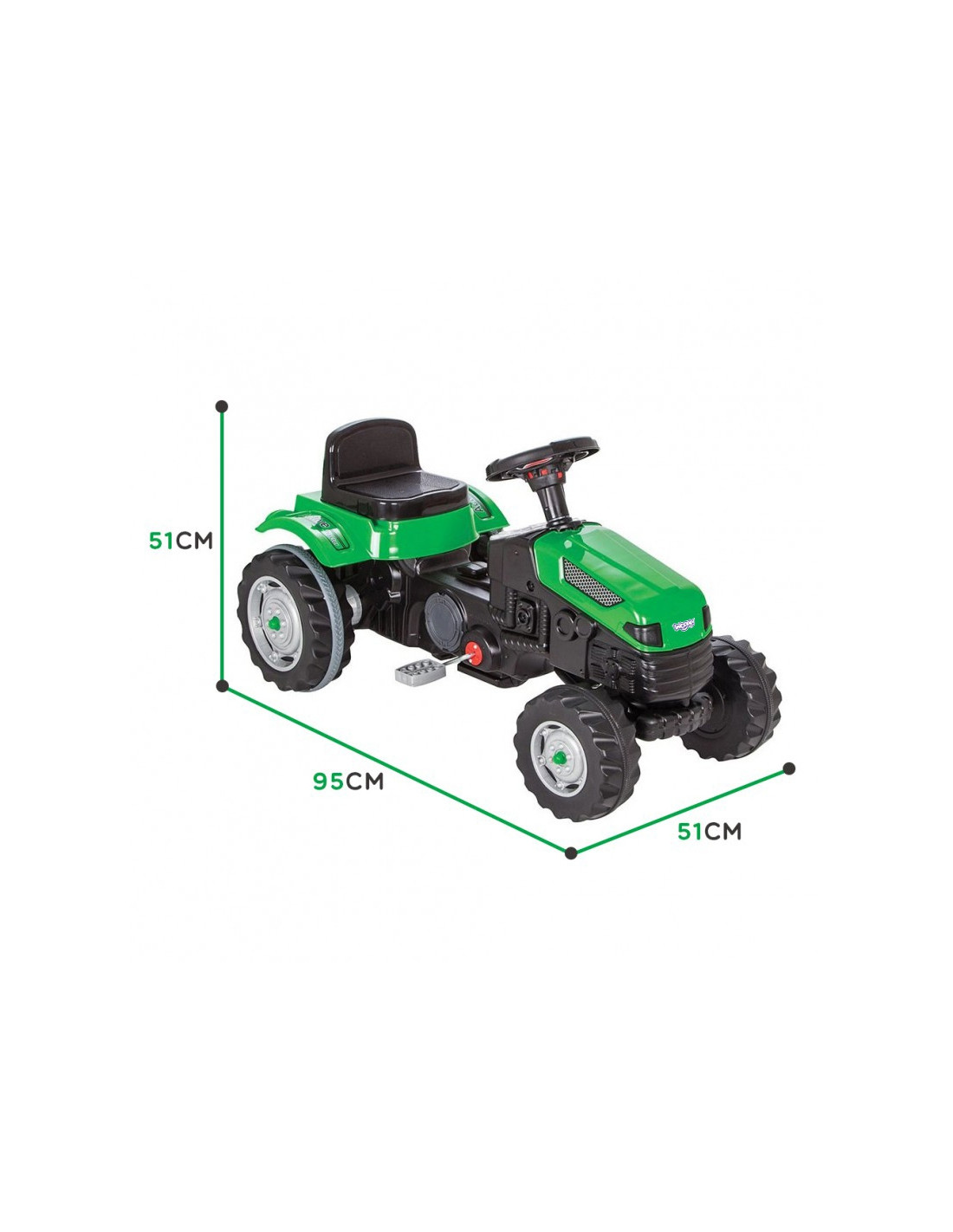 Šis žalias traktorius su pedalais – puikus žaislas pradėti savo nuotykius su transporto priemone. Pagamintas iš aukščiausios kokybės, aplinkai nekenksmingų medžiagų, jis yra visiškai saugus vaikams. Šis traktorius yra puiki dovana bet kuriam vaikui. Jis pasižymi patentuota vairavimo sistema, todėl juo lengva važiuoti net ir mažiausiems naudotojams.