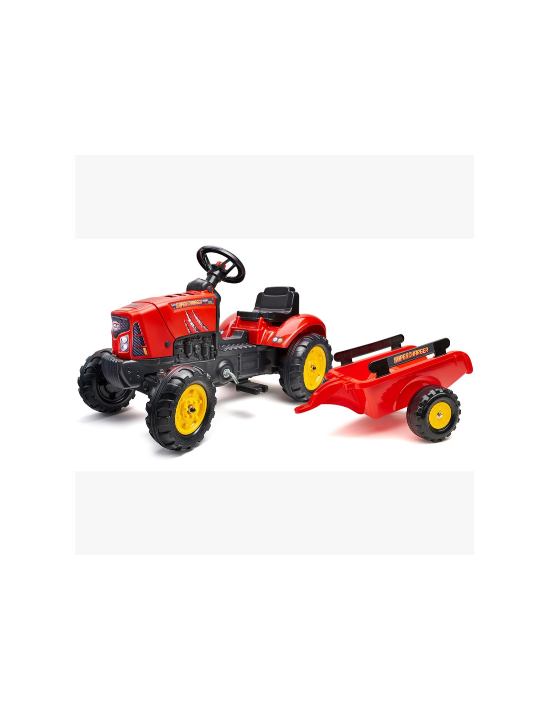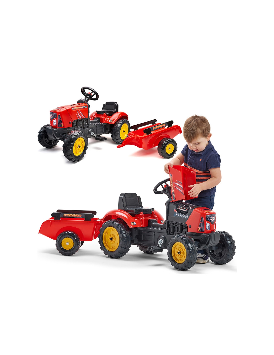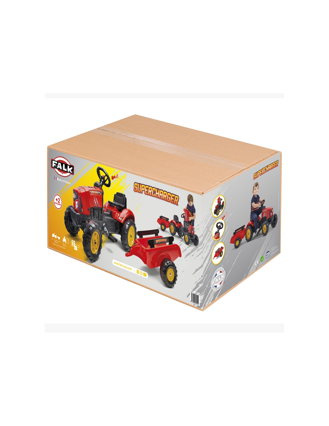 Raudonas „FALK“ traktorius su priekaba ir „Supercharger“ varikliu – daugelio jaunų traktorių vairuotojų svajonės išsipildymas. Kruopščiai pagamintas, atsižvelgiant į smulkiausias detales, šis traktorius yra būtinas kiekvienam ūkininkui. Pagaminta iš aukščiausios kokybės plastiko, ši transporto priemonė tinka vaikams nuo 2 metų amžiaus . Ji turi nuimamą priekabą su panelėmis ir vairą su garso signalu . Traktoriaus ratai pagaminti iš aukštos kokybės plastiko . Traktorius taip pat turi atidaromą variklio dangtį su imituojamu tikru varikliu.