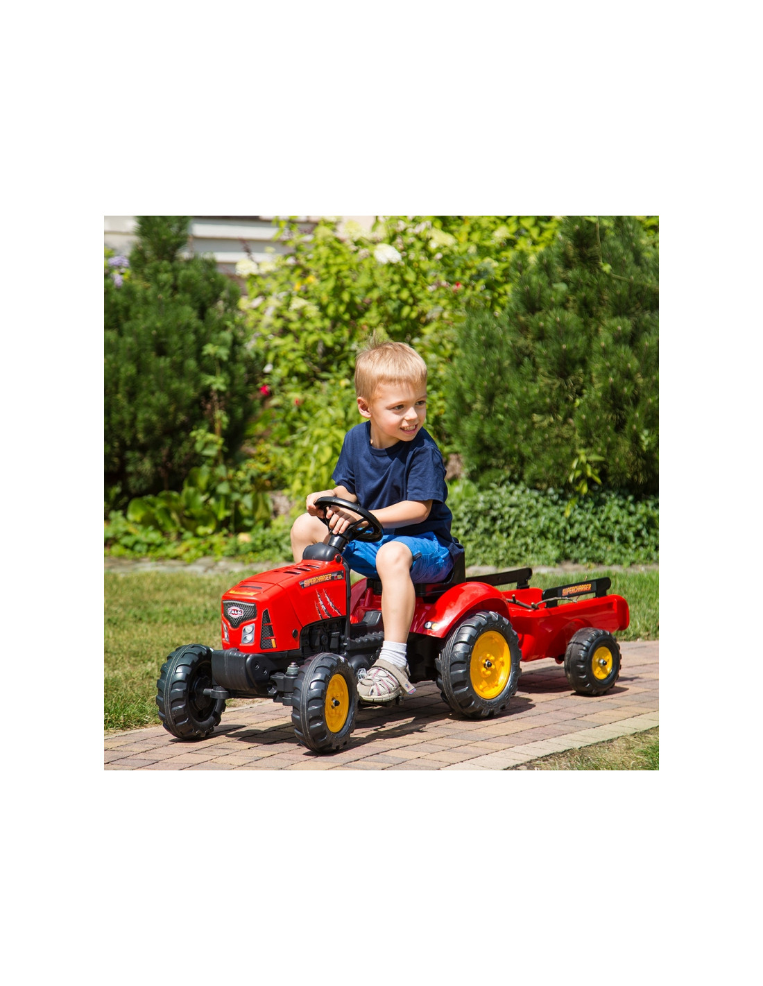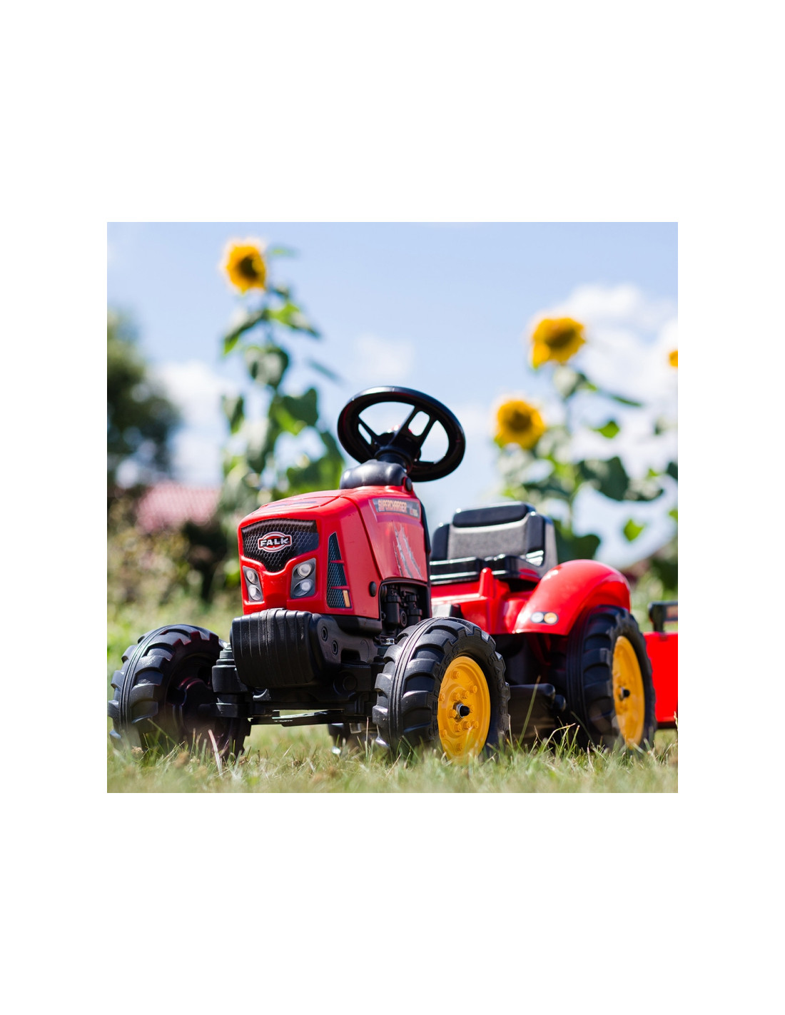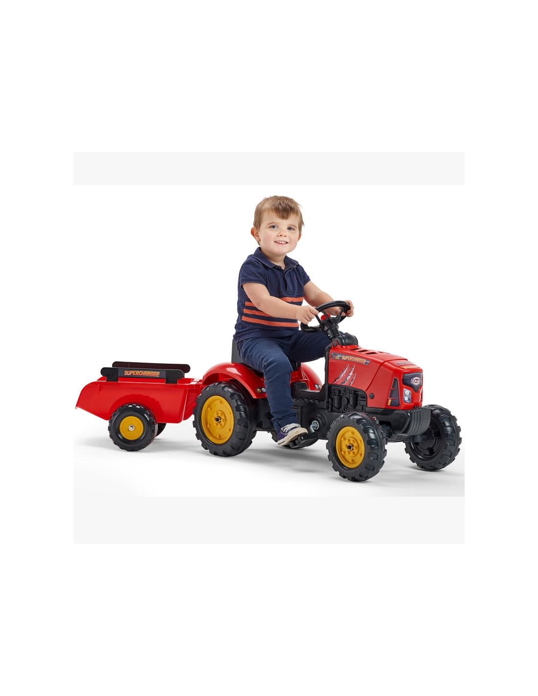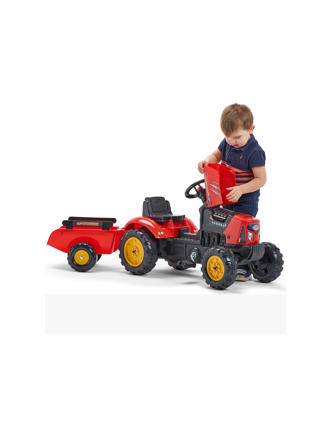 Raudonas „FALK“ traktorius su priekaba ir „Supercharger“ varikliu – daugelio jaunų traktorių vairuotojų svajonės išsipildymas. Kruopščiai pagamintas, atsižvelgiant į smulkiausias detales, šis traktorius yra būtinas kiekvienam ūkininkui. Pagaminta iš aukščiausios kokybės plastiko, ši transporto priemonė tinka vaikams nuo 2 metų amžiaus . Ji turi nuimamą priekabą su panelėmis ir vairą su garso signalu . Traktoriaus ratai pagaminti iš aukštos kokybės plastiko . Traktorius taip pat turi atidaromą variklio dangtį su imituojamu tikru varikliu.