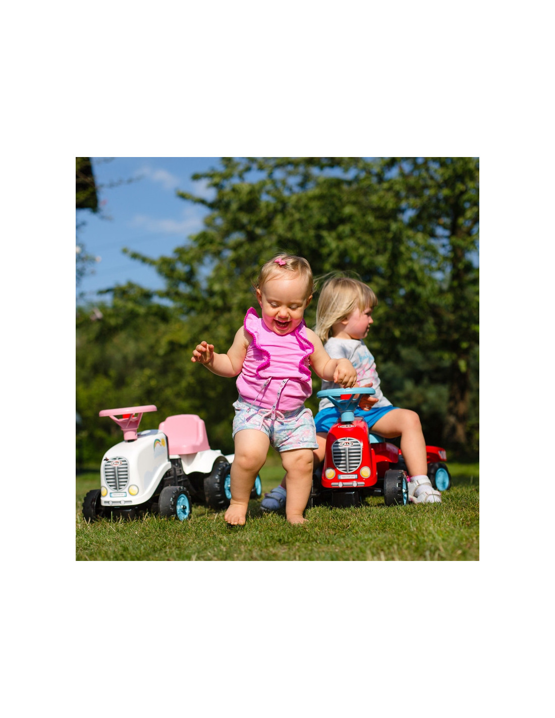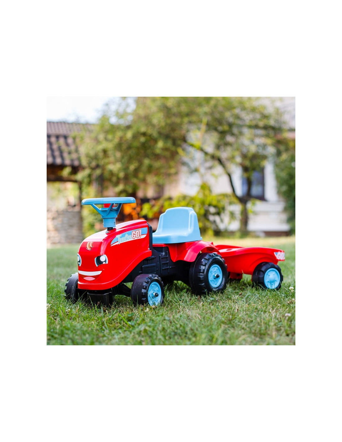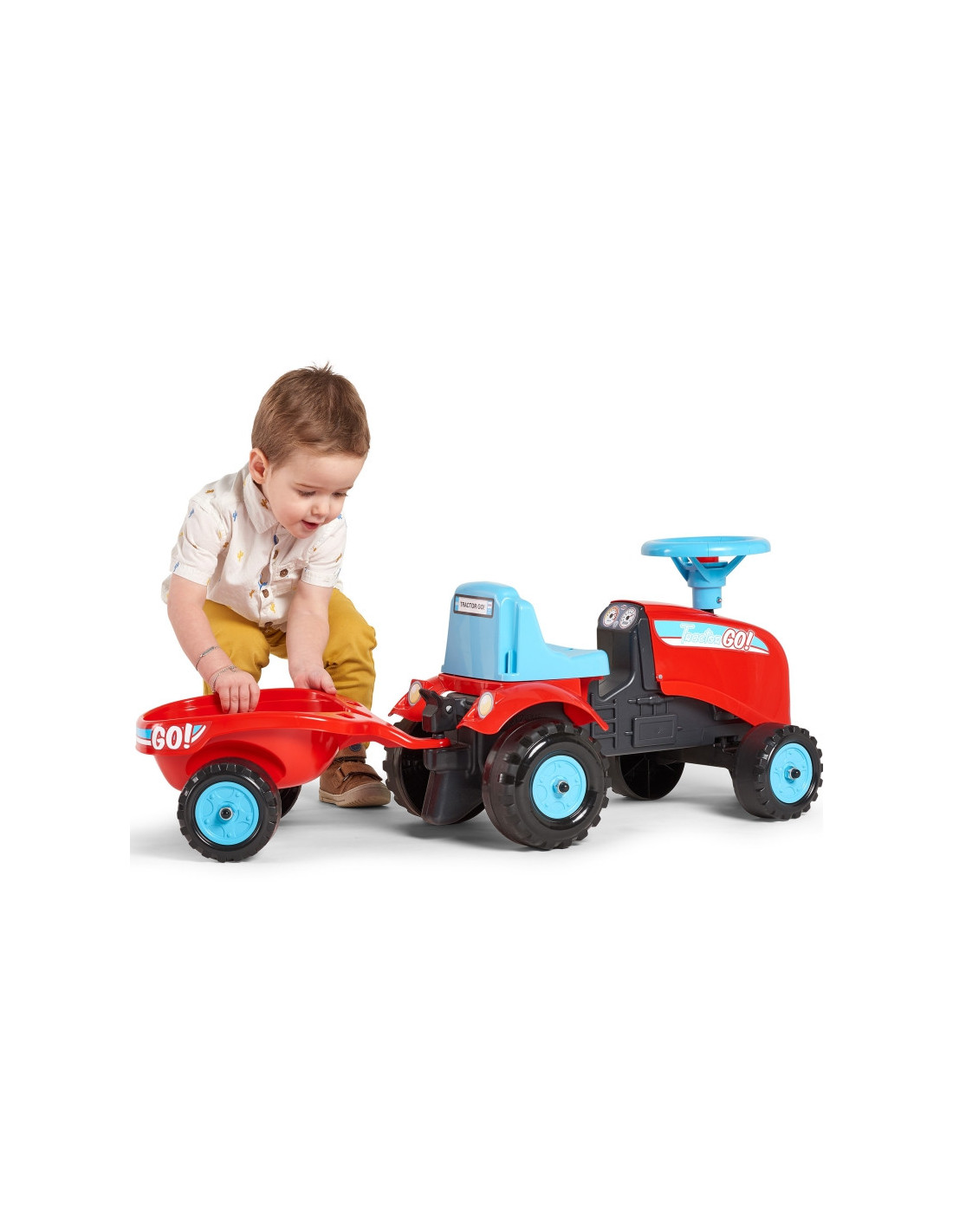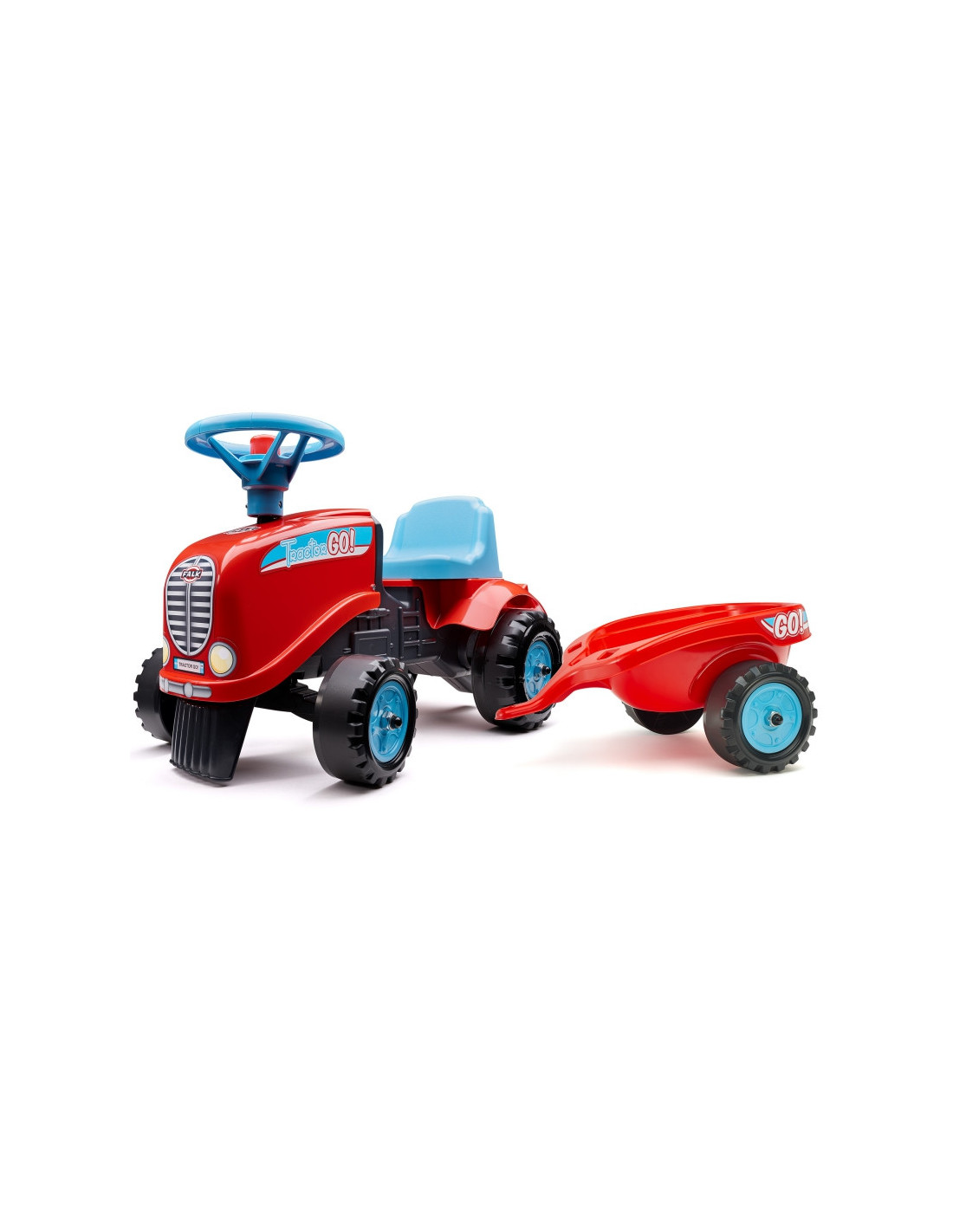 "Tractor Go" traktorius su "Falk" priekaba yra daugelio mažų traktorių vairuotojų svajonės išsipildymas. Kruopščiai pagamintas, atkreipiant dėmesį į smulkiausias detales! Joks tikras ūkininkas neniekintų tokio dalyko. Transporto priemonė pagaminta iš aukščiausios kokybės plastiko ir skirta vaikams nuo 12 mėnesių amžiaus. Transporto priemonėje yra nuimama priekaba su skydeliais ir vairas su garso signalu. Traktoriaus ratai  pagaminti iš aukštos kokybės plastiko. Prie traktoriaus pritvirtinti lipdukai leis jūsų vaikui pasirinkti unikalų stilių. Šypsenėlė ar standartinis lipdukas? Nustebinkite visus ir priklijuokite jį ant transporto priemonės priekio.