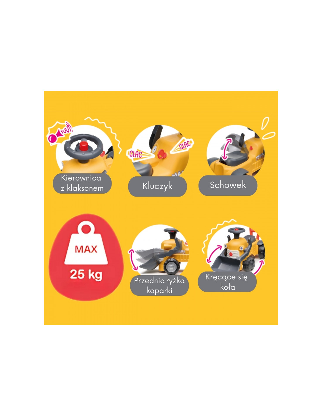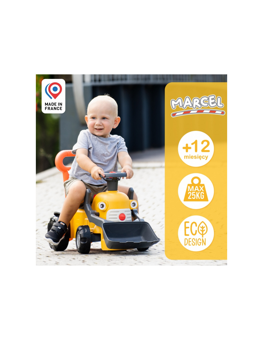 FALK ekskavatorius "Marcel Excavator Ride-on" yra pirmoji kompaktiška transporto priemonė su veikiančiu priekiniu kaušu, vairu su garso signalu ir patogia stūmimo rankena, kuri jau 12 mėnesių kviečia smagiai praleisti laiką namuose ir lauke. Stabili konstrukcija ir gerai apgalvotos detalės, tokios kaip spustelėjęs klavišas, pasukamas vairas ir daiktadėžė po sėdyne, kiekvieną važiavimą sujungia judesius su vaidmenų žaidimu.