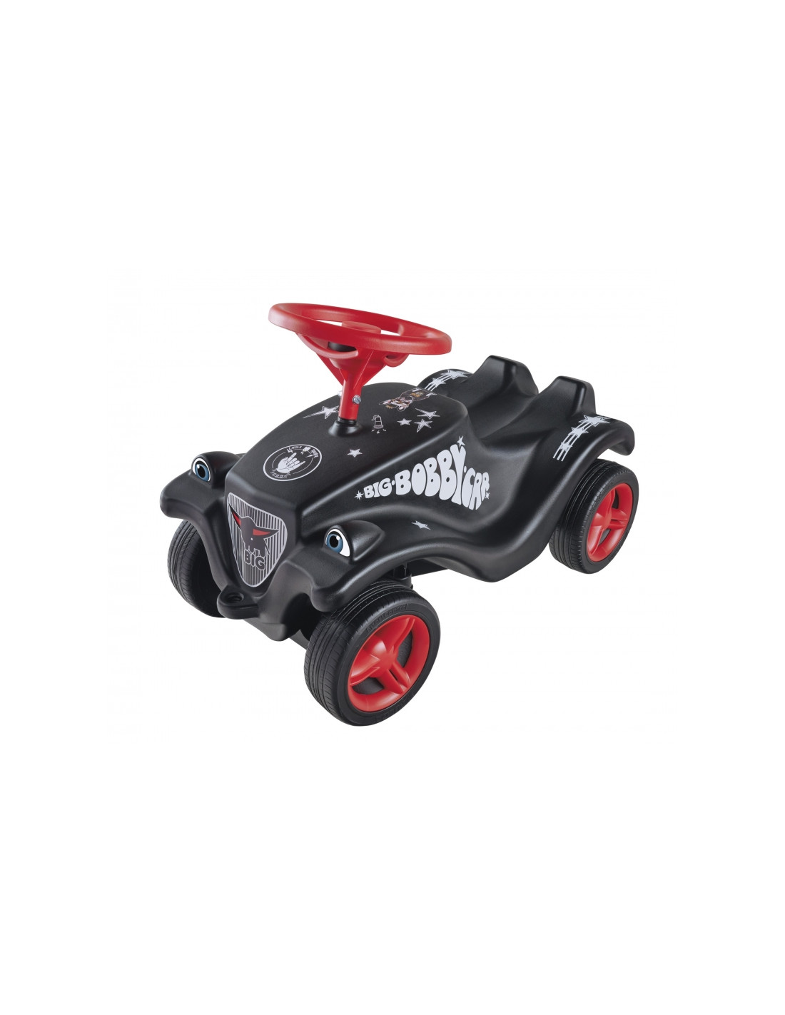 BIG Rok'n'Rolo automobiliai - paspirtukas Bobby Car Classic. Ši tvirta vaikiška transporto priemonė yra tikras mažylių hitas! Juoda ir raudona spalvų gama su spalvingais lipdukais – gitaros stygomis, žvaigždėmis, žaibais ir rokenrolo šuniuku – paverčia ją džiaugsmu tiek mergaitėms, tiek berniukams.