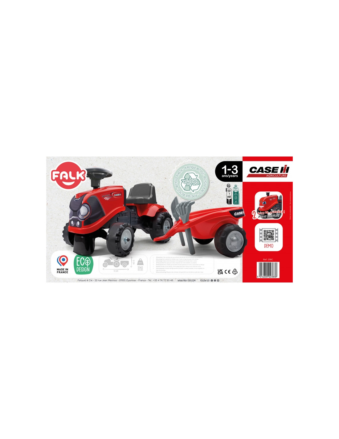 FALK mažylis „Case IH“ traktoriukas su priekaba – daugelio mažųjų traktorių vairuotojų svajonės išsipildymas. Kruopščiai pagamintas , atsižvelgiant į mažiausias detales ! Joks tikras ūkininkas neatsisakytų tokio traktoriuko. Pagamintas iš aukščiausios kokybės plastiko , jis tinka vaikams nuo 12 mėnesių amžiaus. Jame yra nuimama priekaba su panelėmis ir vairas su garso signalu . Traktoriaus ratai pagaminti iš aukštos kokybės plastiko . Be to, prie traktoriaus pridedamas grėblys ir kastuvas, kad jūsų vaikas galėtų žaisti. Pridedami lipdukai leidžia jūsų vaikui pasirinkti savo unikalų stilių. Šypsenėlė ar standartinis lipdukas? Nustebinkite visus, priklijuodami jį ant transporto priemonės priekio.