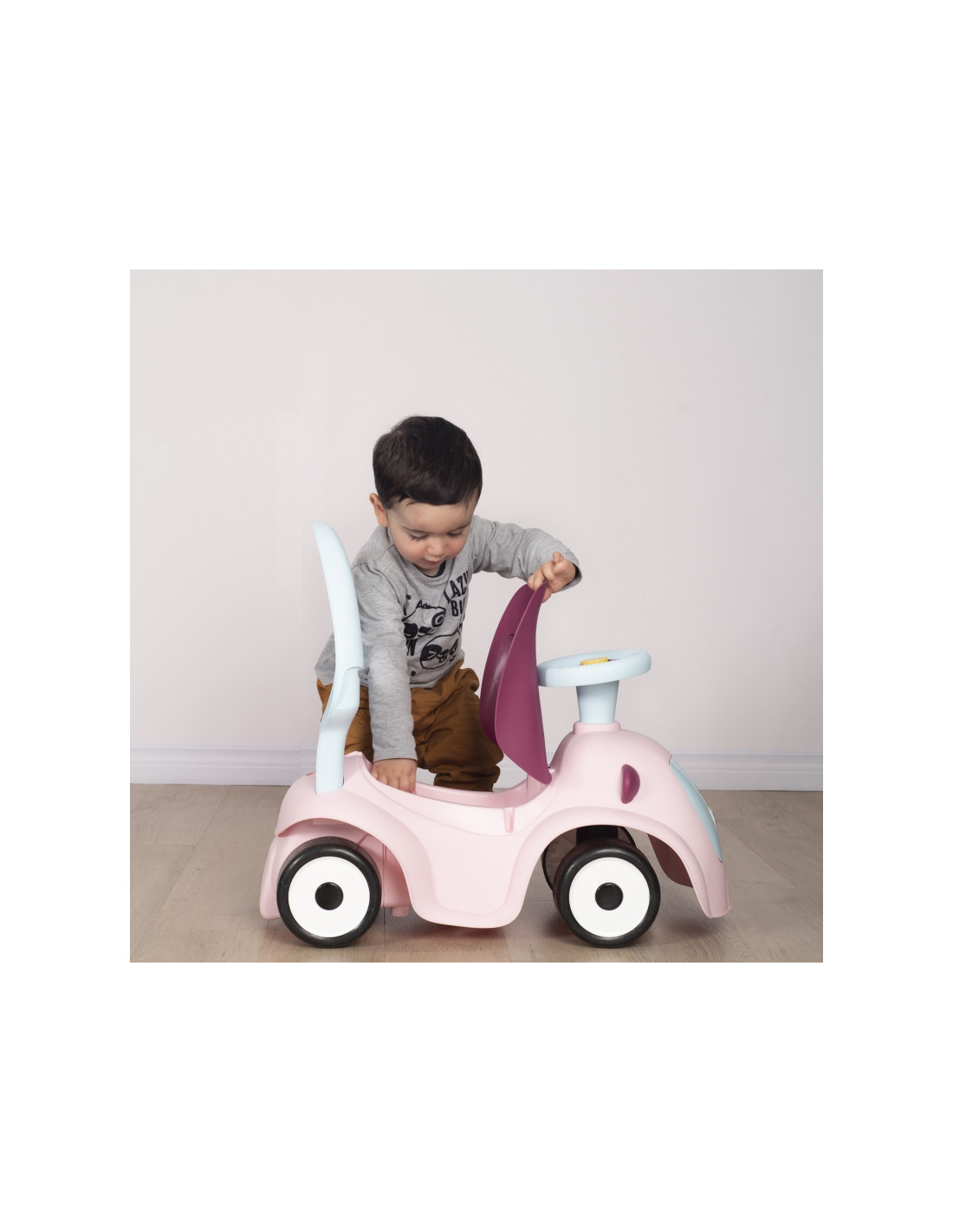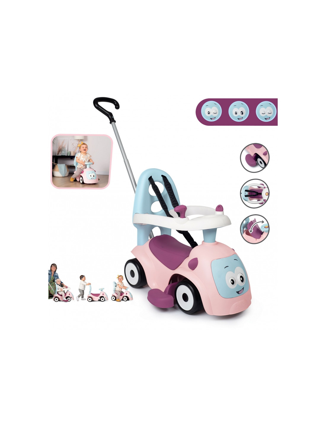 - - važiuojamoji transporto priemonė turi 4 skirtingas funkcijas: nuo 6 mėnesio ją galima naudoti kaip tėvų stumiamą vežimėlį, nuo 10 mėnesio – kaip vaikštynę/stūmiklį, nuo 12 mėnesių vaikas gali naudoti ją kaip savarankišką vežimėlį,