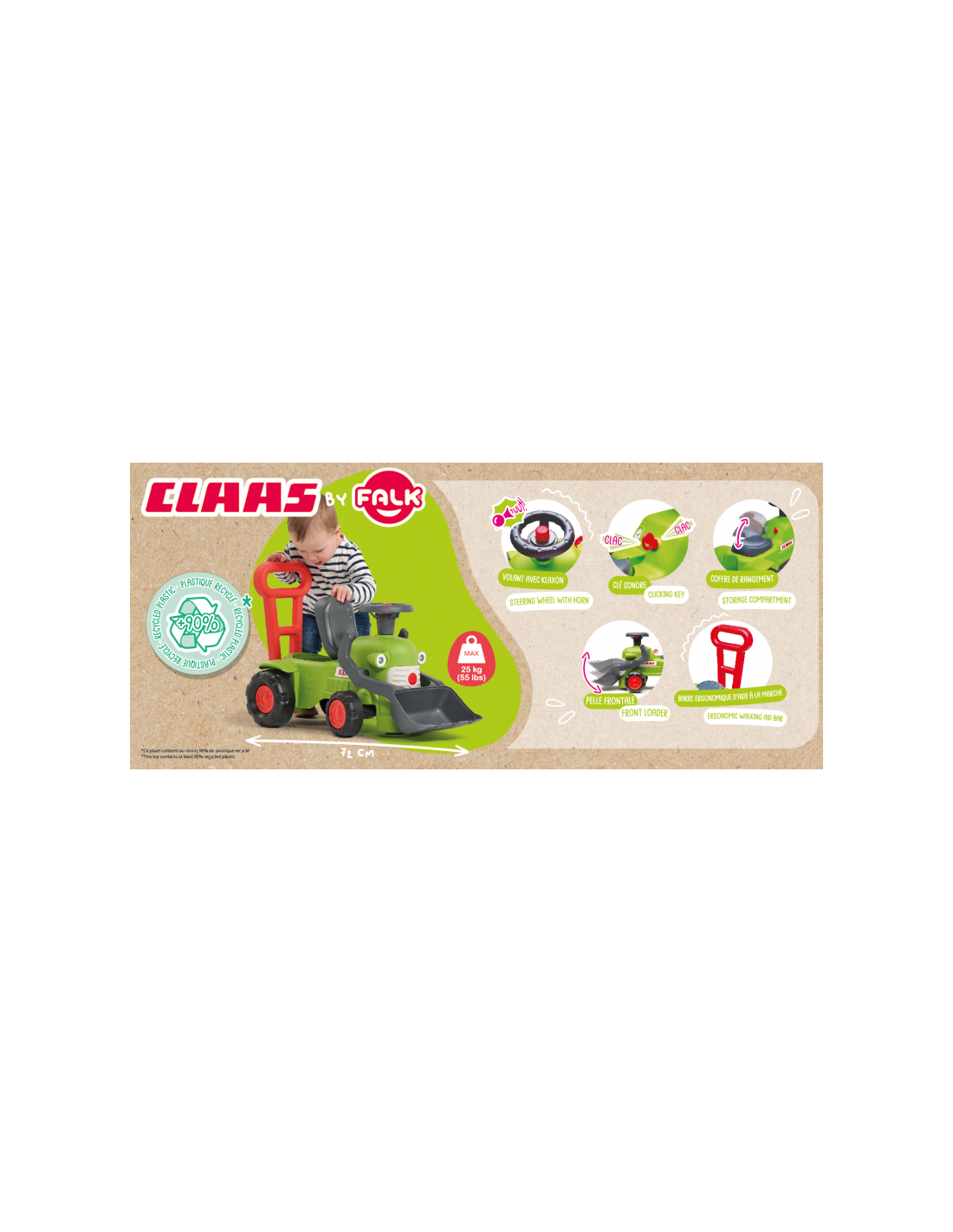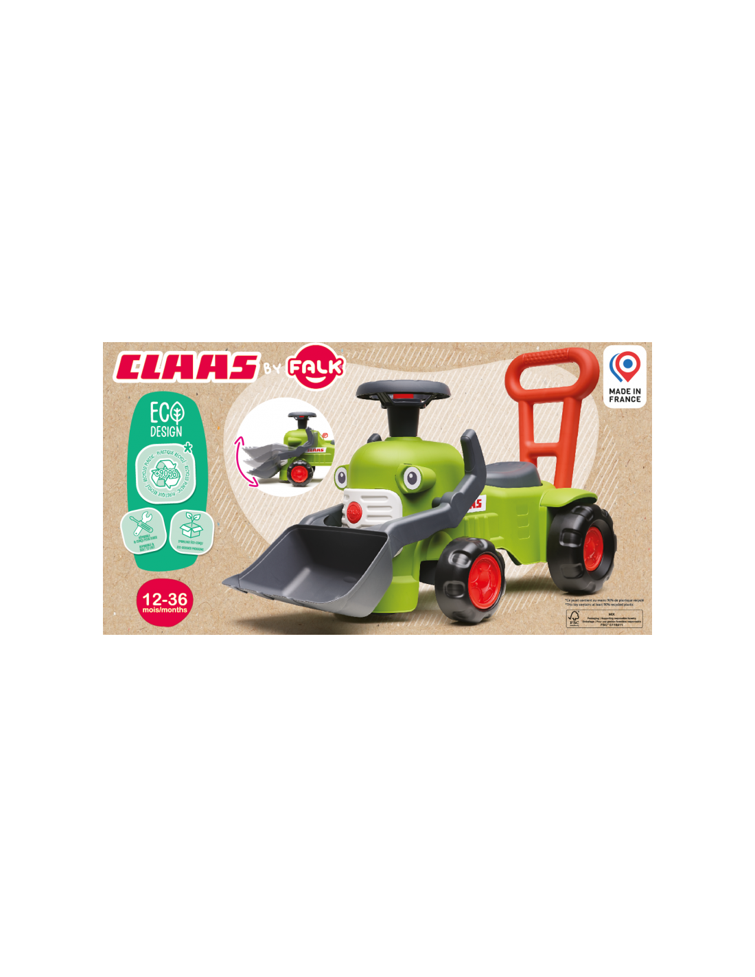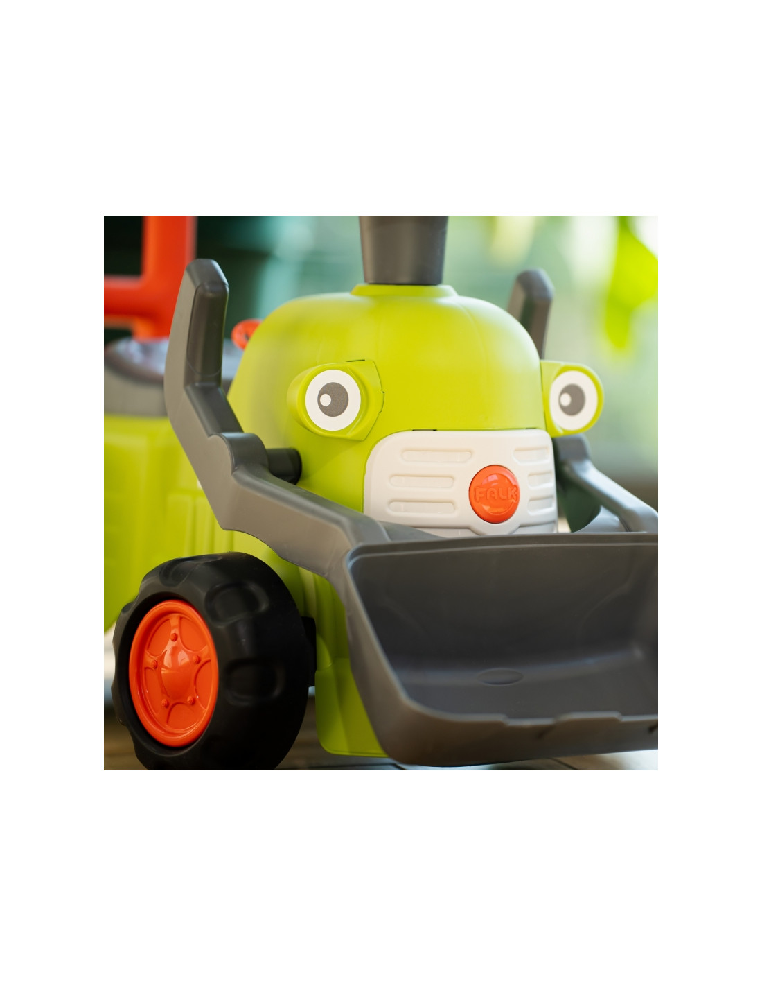 "Ride-on" klasės traktorius su "Falk" priekaba yra daugelio mažų traktorių vairuotojų svajonės išsipildymas. Kruopščiai pagaminta, atkreipiant dėmesį į smulkiausias detales. Joks tikras ūkininkas neniekintų tokio dalyko. CLAAS traktorius su kaušu ir priekaba pagamintas iš aukščiausios kokybės medžiagų. Transporto priemonė skirta vaikams nuo 12 mėnesių amžiaus. Transporto priemonėje yra nuimama priekaba su skydeliais ir vairas su garso signalu.
