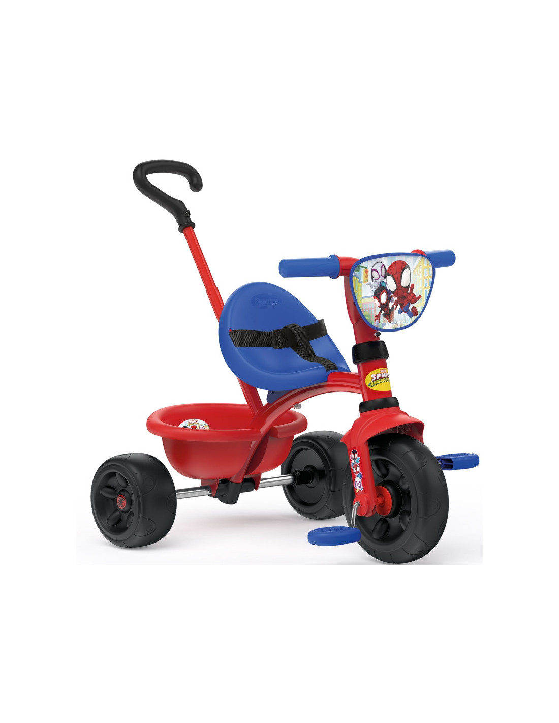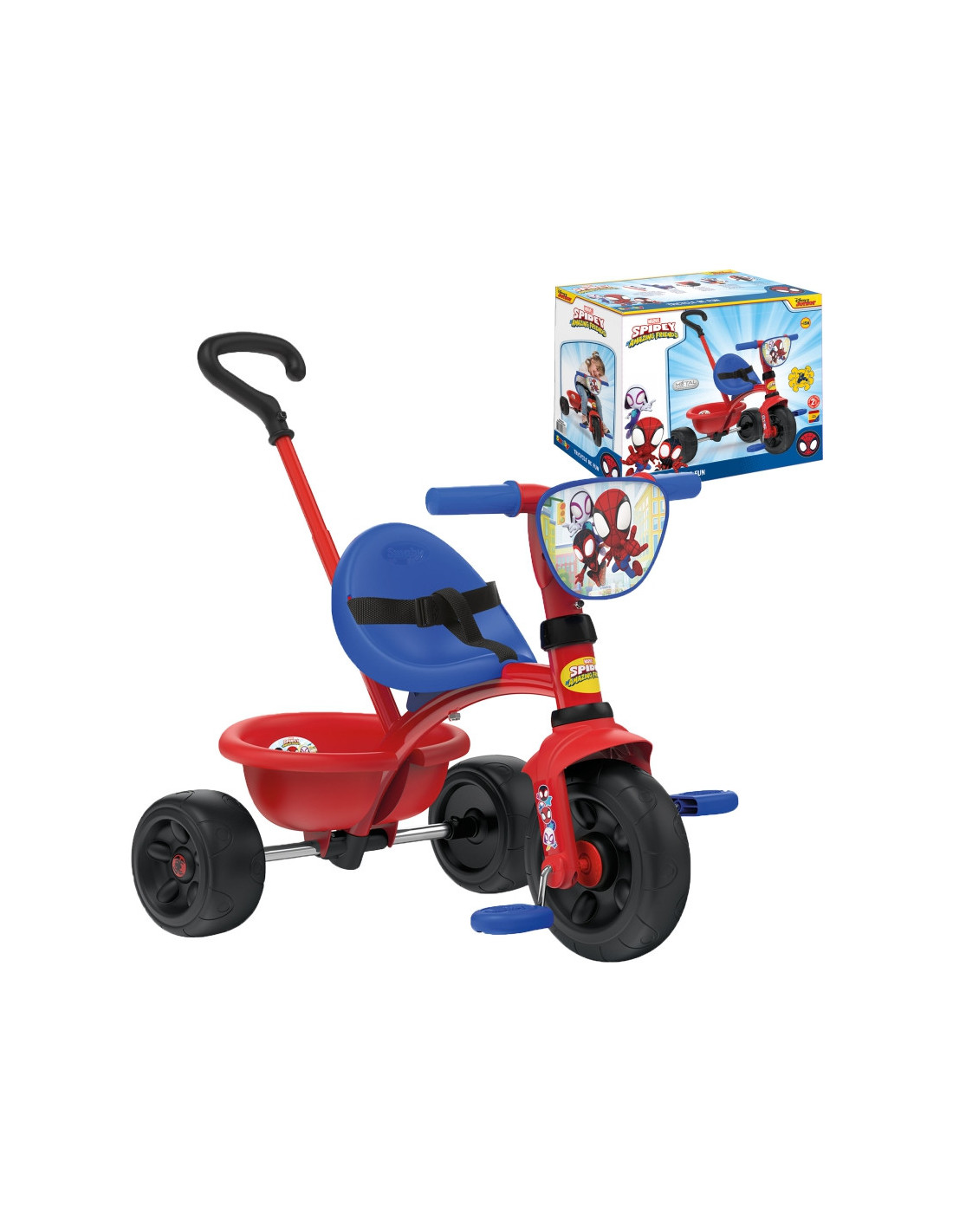 Super kietas triratukas, kietas stilius, sukurtas Spidey ir jo super draugai. Šiuolaikinis "Spidey Be Fun" triratukas iš Smoby yra saugi transporto priemonė vaikams nuo 15 mėnesių amžiaus. Ergonomiška sėdynė yra ypač patogi ir palaiko nugarą. Dirželis suteikia papildomo saugumo. Įranga su perjungiama laisvąja eiga pedaluose, kietomis plastikinėmis padangomis, vairo užraktu ir reguliuojamu aukščiu, triratuką padaro patikimu kompanionu pirmaisiais gyvenimo metais. Kai tik vaikas išmoksta važiuoti savarankiškai, saugos įtaisus galima nuimti.
