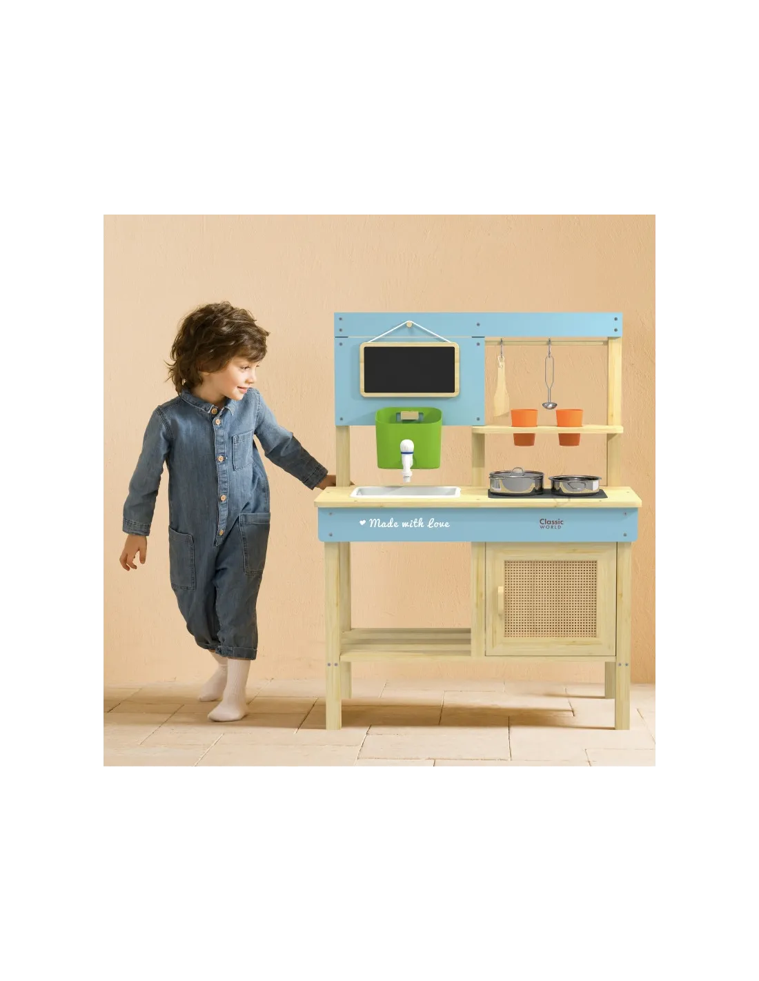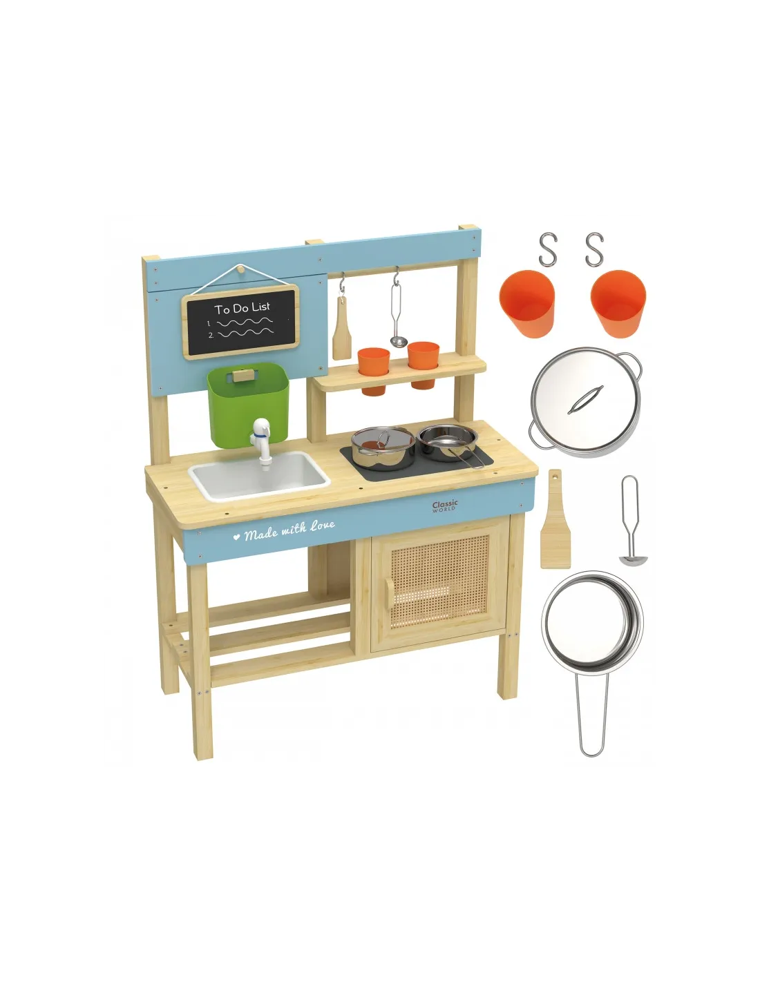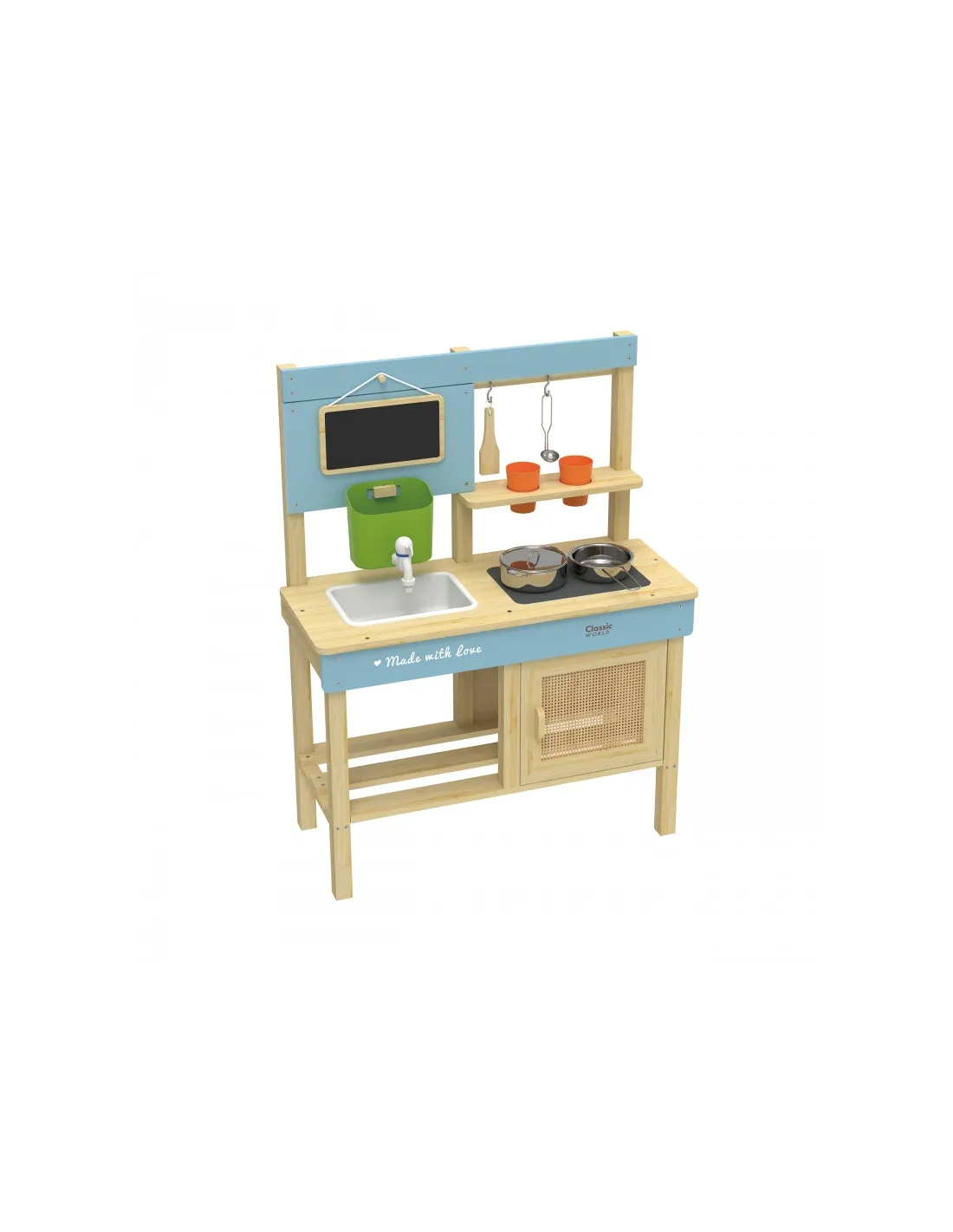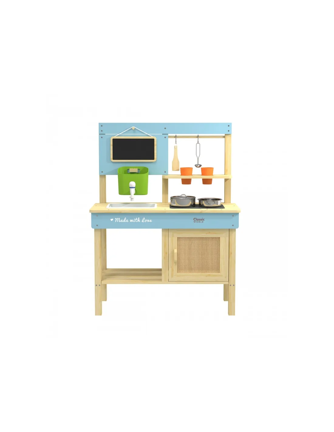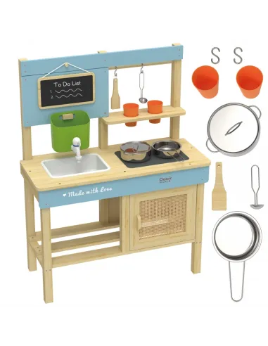 Vaikai gali smagiai leisti laiką mėgdžiodami suaugusiuosius! „Classic World“ medinė lauko žaidimų virtuvėlė – puikus žaislas mažiesiems maisto gaminimo lauke entuziastams! Pagaminta iš impregnuotos ir dažytos medienos, todėl yra atspari lauko sąlygoms. Turi integruotą kriauklę su kranu, kaitlentę ir kreidinę lentą receptams užrašyti.Komplekte yra puodai, indai bei kiti maisto gaminimo įrankiai. Skirta lavinti vaikų vaizduotę ir kūrybiškumą per vaidmenų žaidimus, pavyzdžiui, gaminant „smėlio bandeles“ ar „pienių sriubą“.
