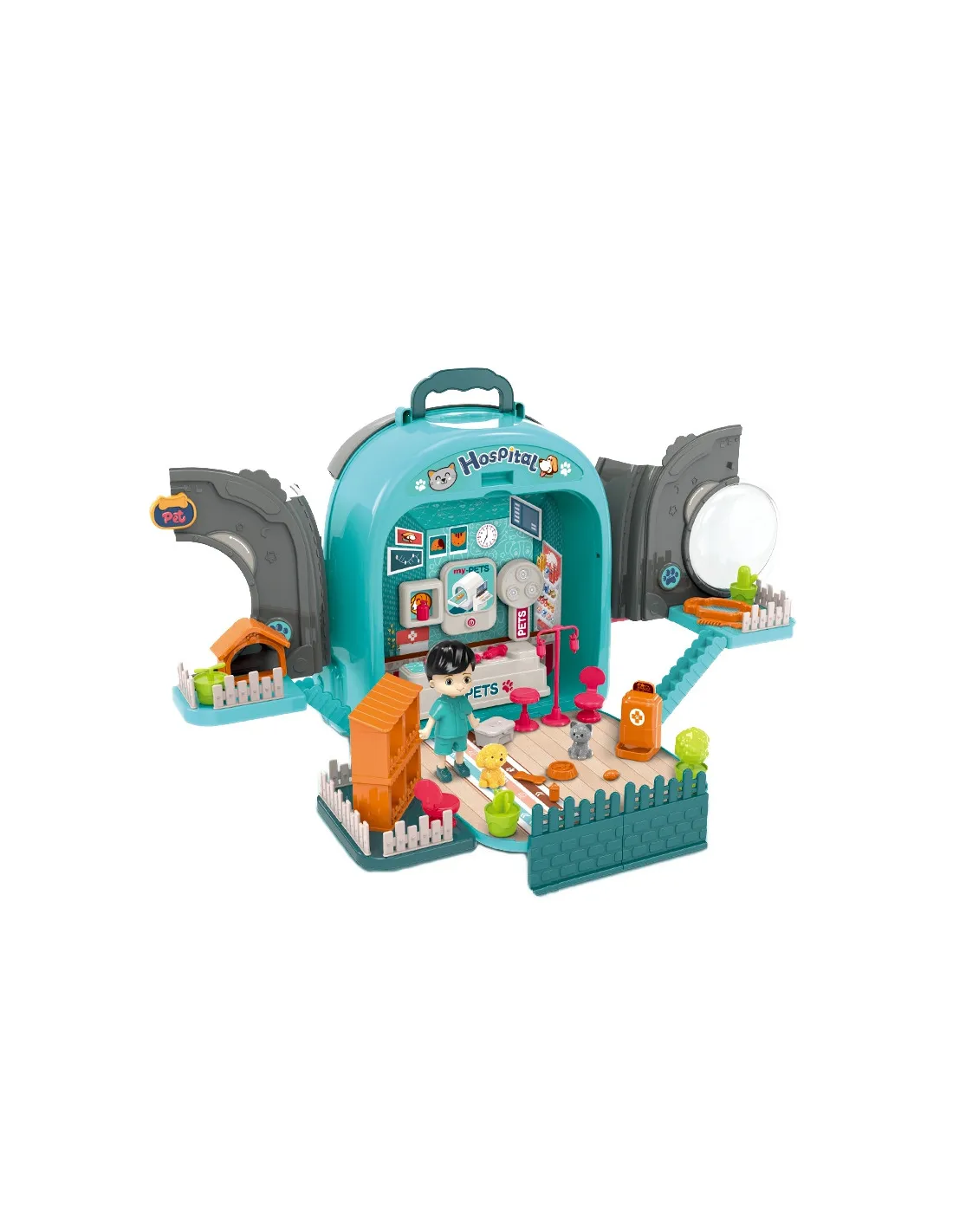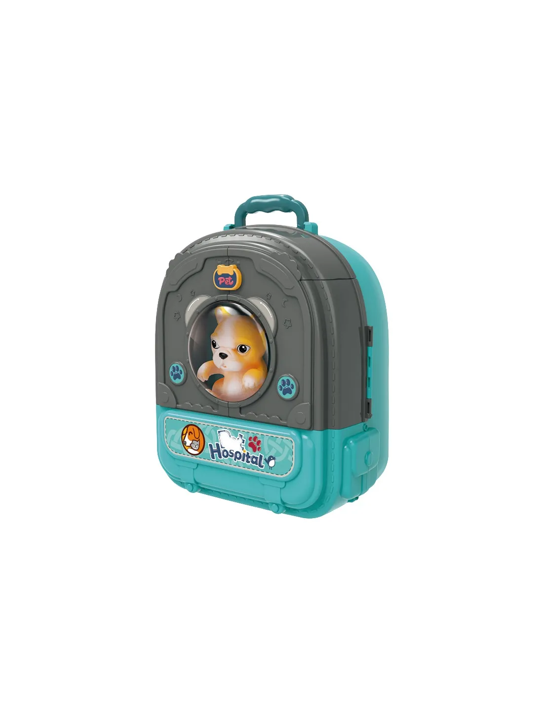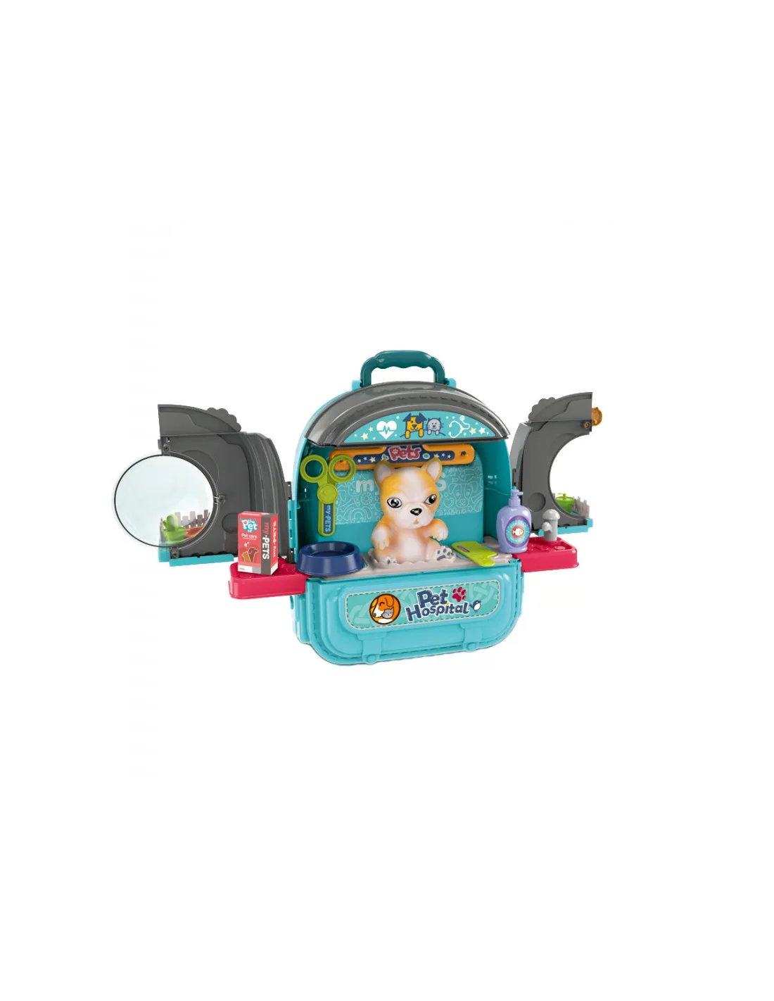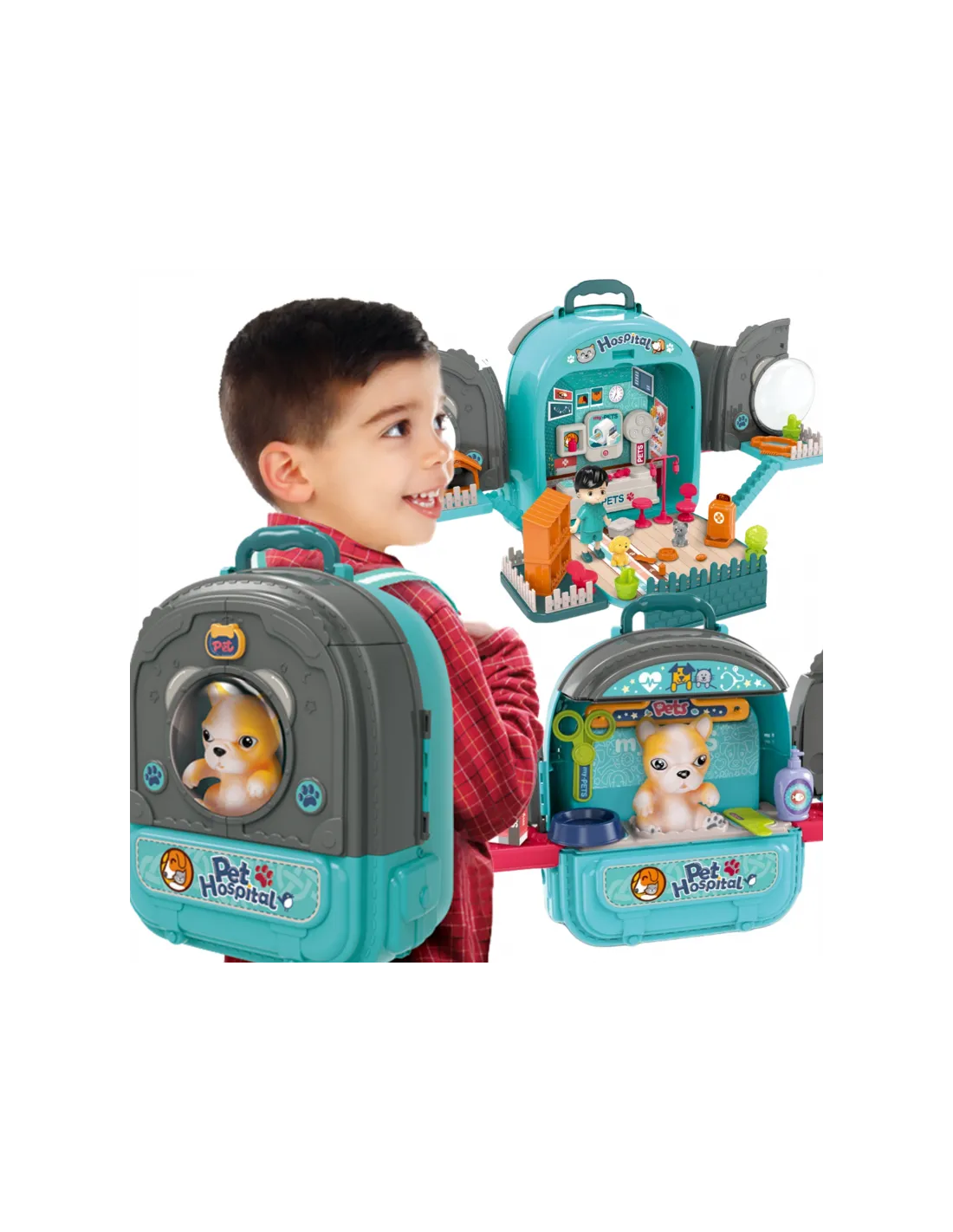 - - žaislas "3 viename" - kuprinė, gyvūnų ligoninė su sodu, vieta, kurioje galima prižiūrėti šunį