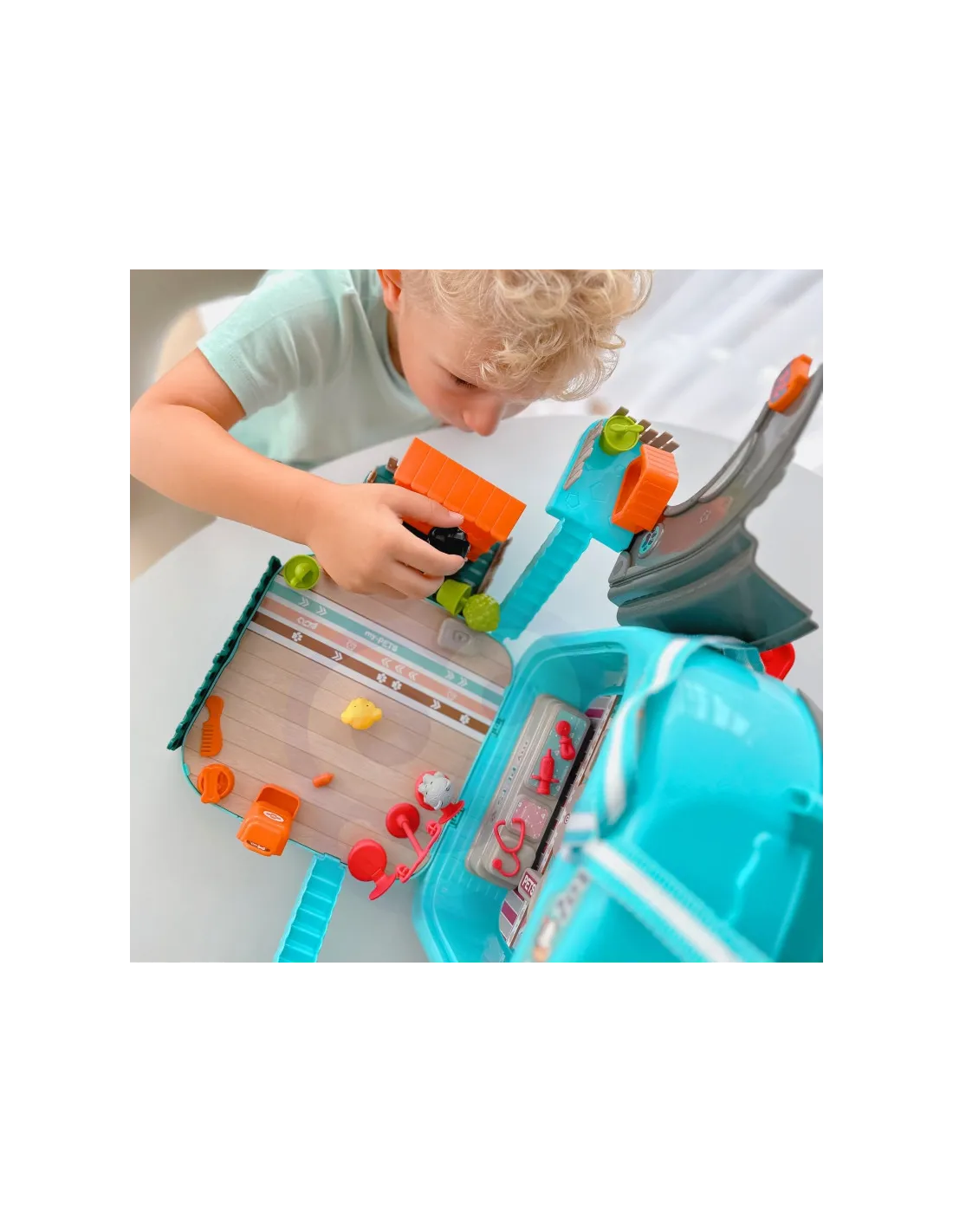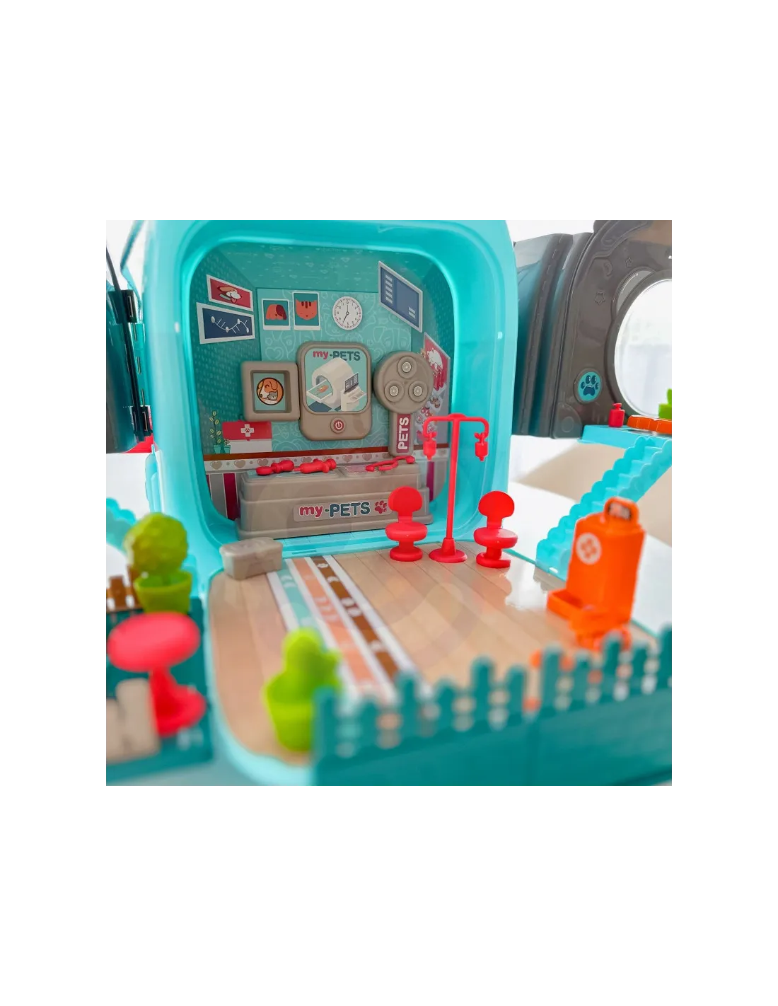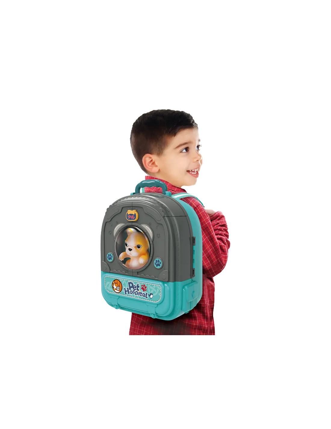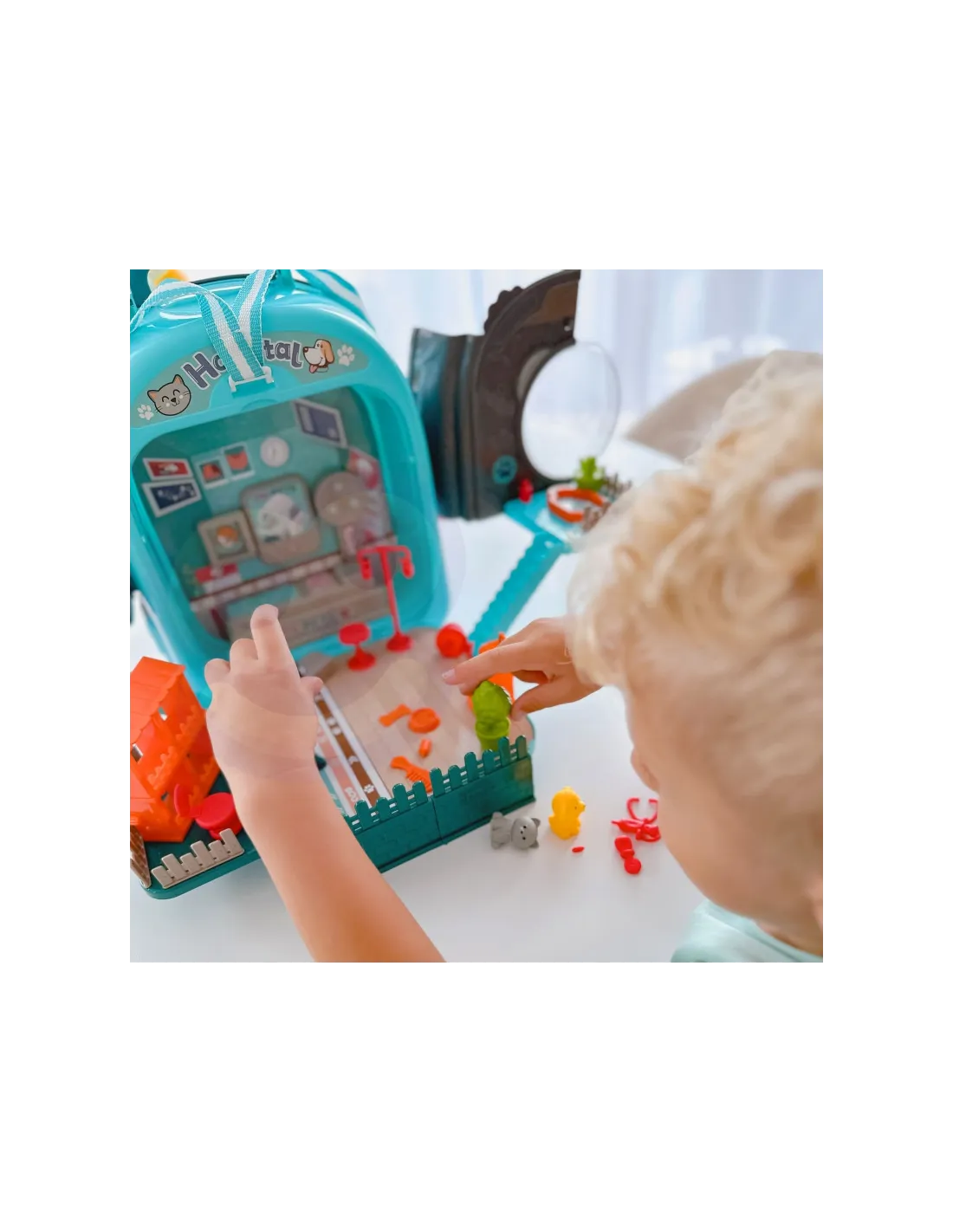 - - žaislas "3 viename" - kuprinė, gyvūnų ligoninė su sodu, vieta, kurioje galima prižiūrėti šunį