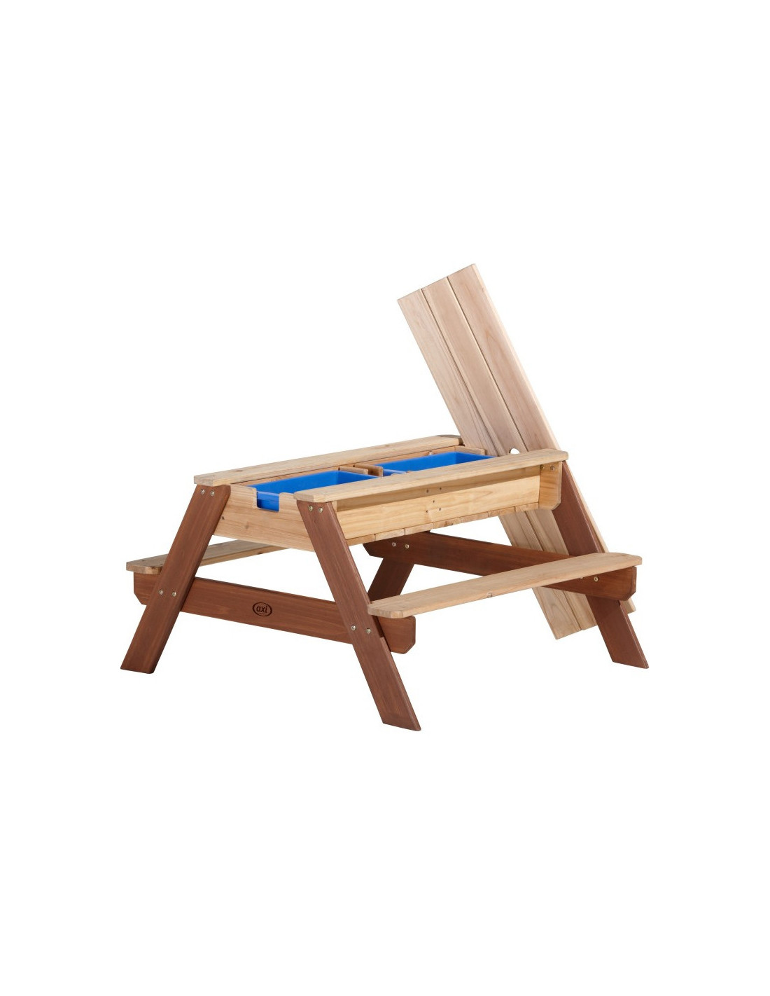 Stół piknikowy Nick od renomowanej marki AXI to wielofunkcyjny stół, który ma tajne pomieszczenie z dwoma niebieskimi pojemnikami pod zdejmowanym blatem. Te niebieskie pojemniki można wypełnić piaskiem i/lub wodą, ale oczywiście można w nich przechowywać również zabawki. Dodatkowo pojemniki są wyjmowane, dzięki czemu można je łatwo wyczyścić. Klasyczne połączenie piasku i wody zawsze sprawdza się u dzieci! W mgnieniu oka zamienisz stół z piaskiem i wodą w stół piknikowy, na którym dzieci będą mogły tworzyć, rysować lub cieszyć się smakołykami.