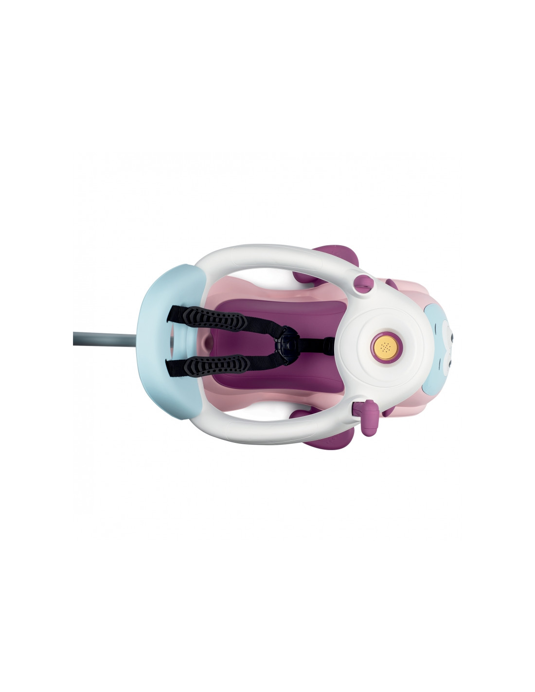 - - važiuojamoji dalis turi patogią sėdynę, nuimamą žiedą ir saugos diržus bei rankeną stūmimui,