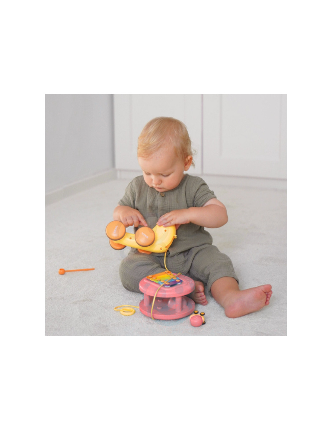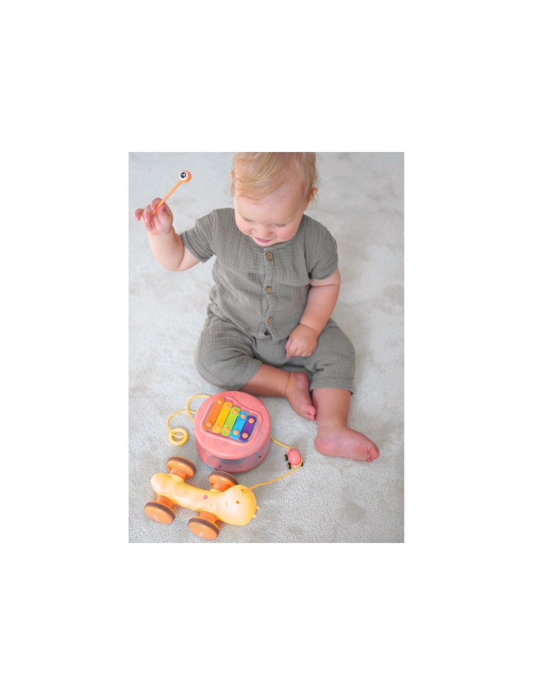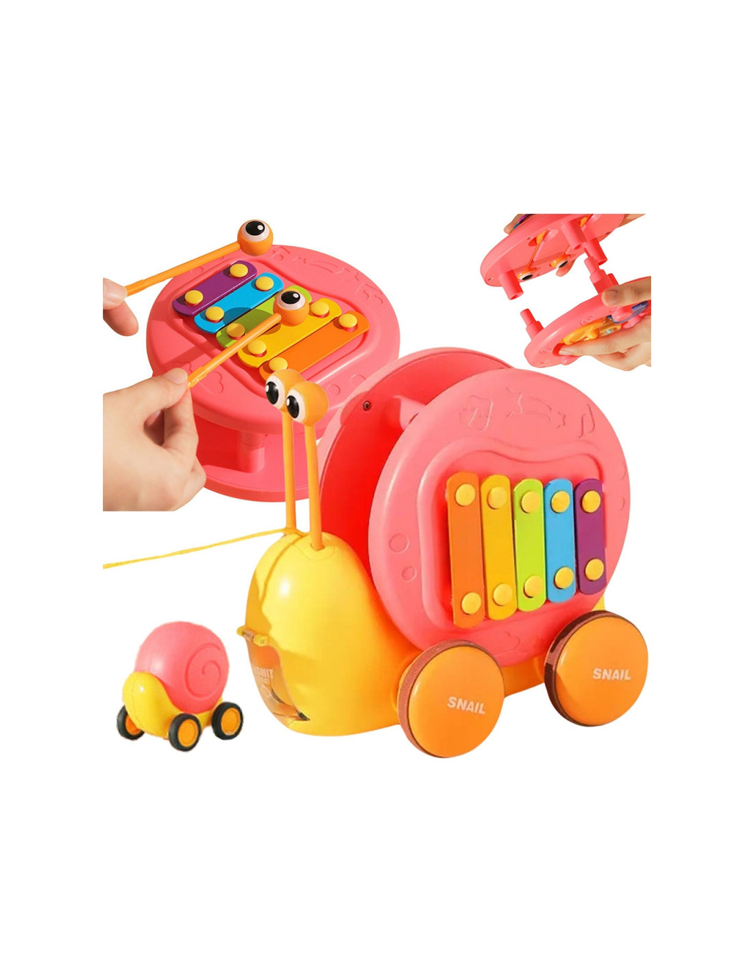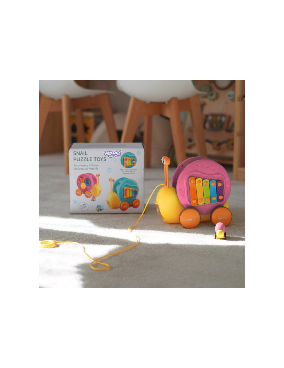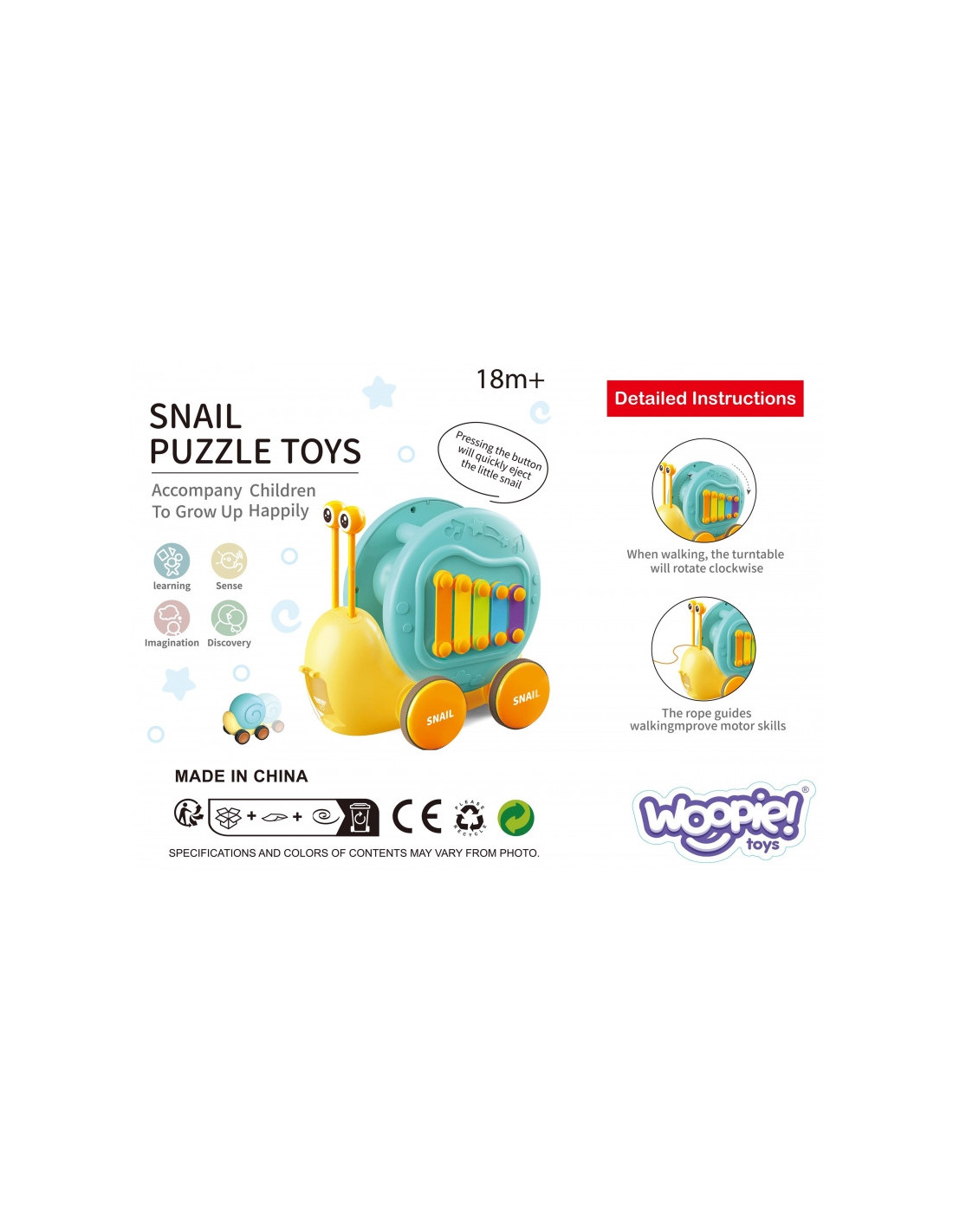 Daugiafunkcinis WOOPIE prekės ženklo žaislas sraigė, kuris patraukia vaikų dėmesį ir skatina jų vaizduotę. Ryškios spalvos taip pat lavina jų regos suvokimą ir estetinį pojūtį. Sraigės traukimo žaislas suteikia įvairių būdų žaisti ir mokytis. Galima spaudyti klavišus ir taip lavinti vaikų klausą bei akies ir rankos koordinaciją. Sraigę taip pat galima traukti už pavadėlio arba stumti ir leisti jai slysti grindimis, o tai didina žaidimo smagumą ir wyzwanie.Podczas vaikai mokosi apie gyvūnus, muziką bei priežasties ir pasekmės ryšius. Skatinkite stebėjimą, loginio mąstymo įgūdžius ir fizinę koordinaciją, o jūsų vaikas galės valandų valandas mėgautis kūrybišku žaidimu. Sraigės traukimo žaislas yra puikus būdas dalytis laimingais momentais su vaikais. Mamos gali žaisti su savo mažyliais ir stebėti, kaip jie kikena, kai sraigė juda. Šis žaislas tinka bendravimui šeimoje ir gali sustiprinti abipusį prieraišumą. Žaislą sudaro dvi dalys: sraigės kiautas, kuriame yra cimbolai, ir akių formos cimbolų lazdelės ( jos dedamos į kiauto vidų). Antroji dalis yra mažo automobilio paleidimo įtaisas iš sraigės kūno - žaislo gale yra mygtukas, kuriuo atidaromas automobilio paleidimo įtaisas.