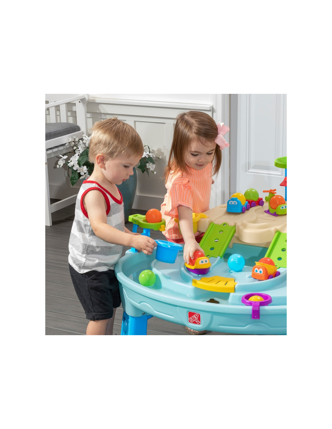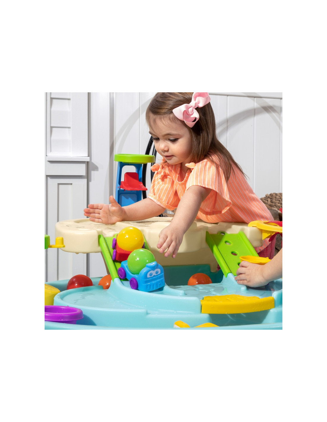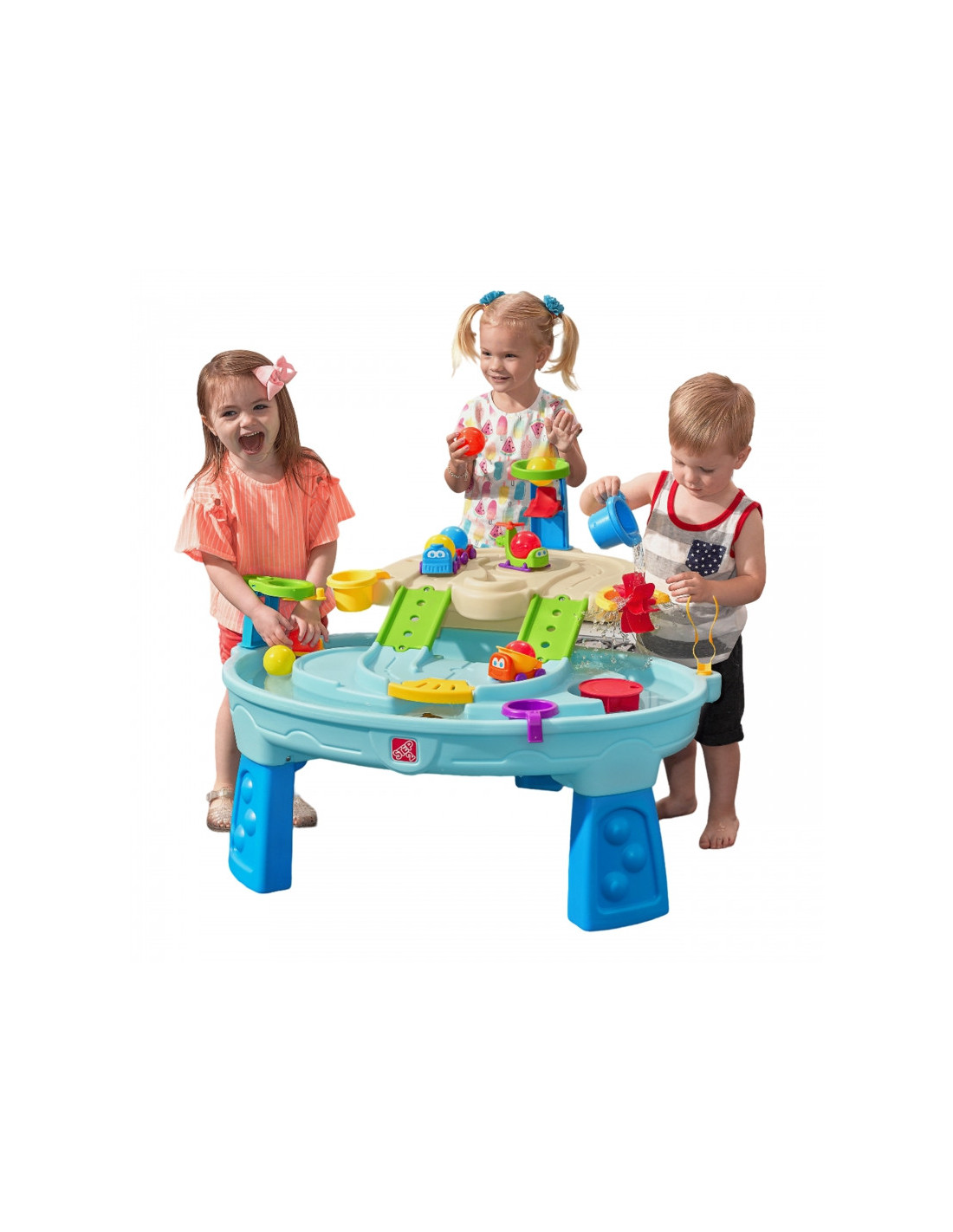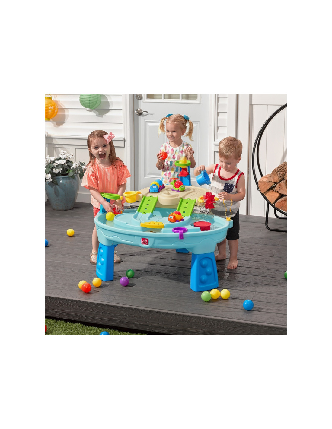 Step2 Ball Buddies Nuotykių centro vaikų dvipakopis stalas! Be klasikinio "Ball Buddies" savivarčio, šiame lauko žaidimų stale vaikams yra "Ball Buddies" sraigtasparnis, valtis ir traukinys, kuriame vienu metu galima vežti du žaidimo kamuoliukus! Ball Buddies laukia nuotykių aplink upę arba kruizas aplink išlietų kelių ir tiltų vingius. Šis vaikiškas vandens stalas su dideliu plotu, daugybe priedų ir daugybe žaidimo būdų yra puiki galimybė daugeliui vaikų žaisti socialiniuose žaidimuose. Be to, atskiros stotys aplink baseiną siūlo papildomų galimybių mažiesiems, norintiems žaisti vieniems. Mažieji nuotykių ieškotojai gali naudoti lanką mėtyti kamuoliukus į vandenį ir mėgautis įdomiomis vandens pramogomis naudodamiesi vandens ratu ir pridedamais matavimo puodeliais. Apačioje yra net interaktyvus ratas, todėl mažieji gali pajudinti vandenį ir sukurti tekančią upę.