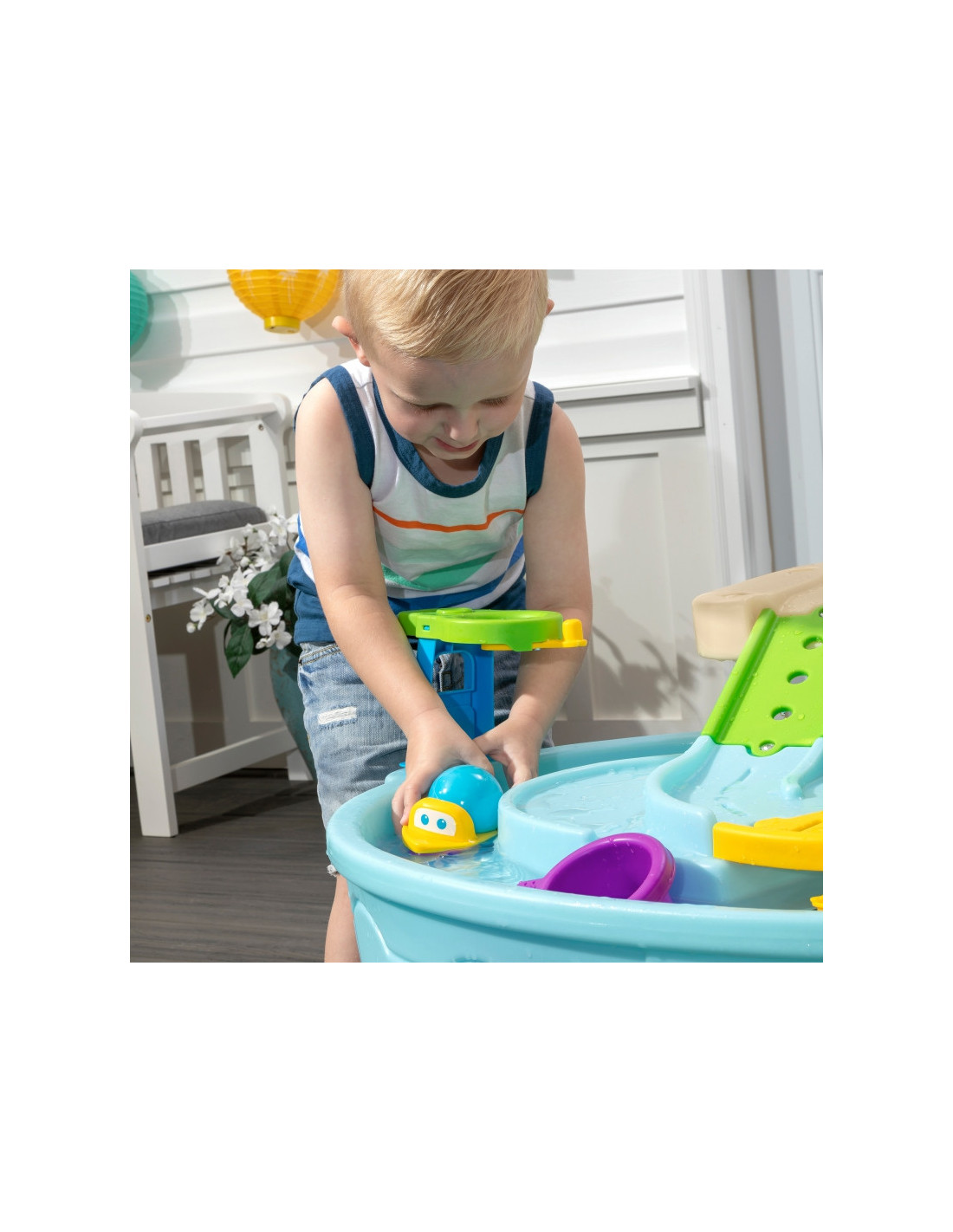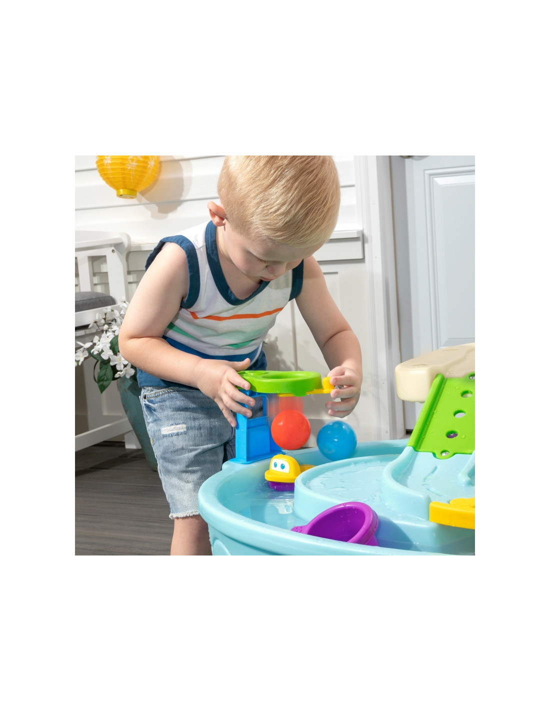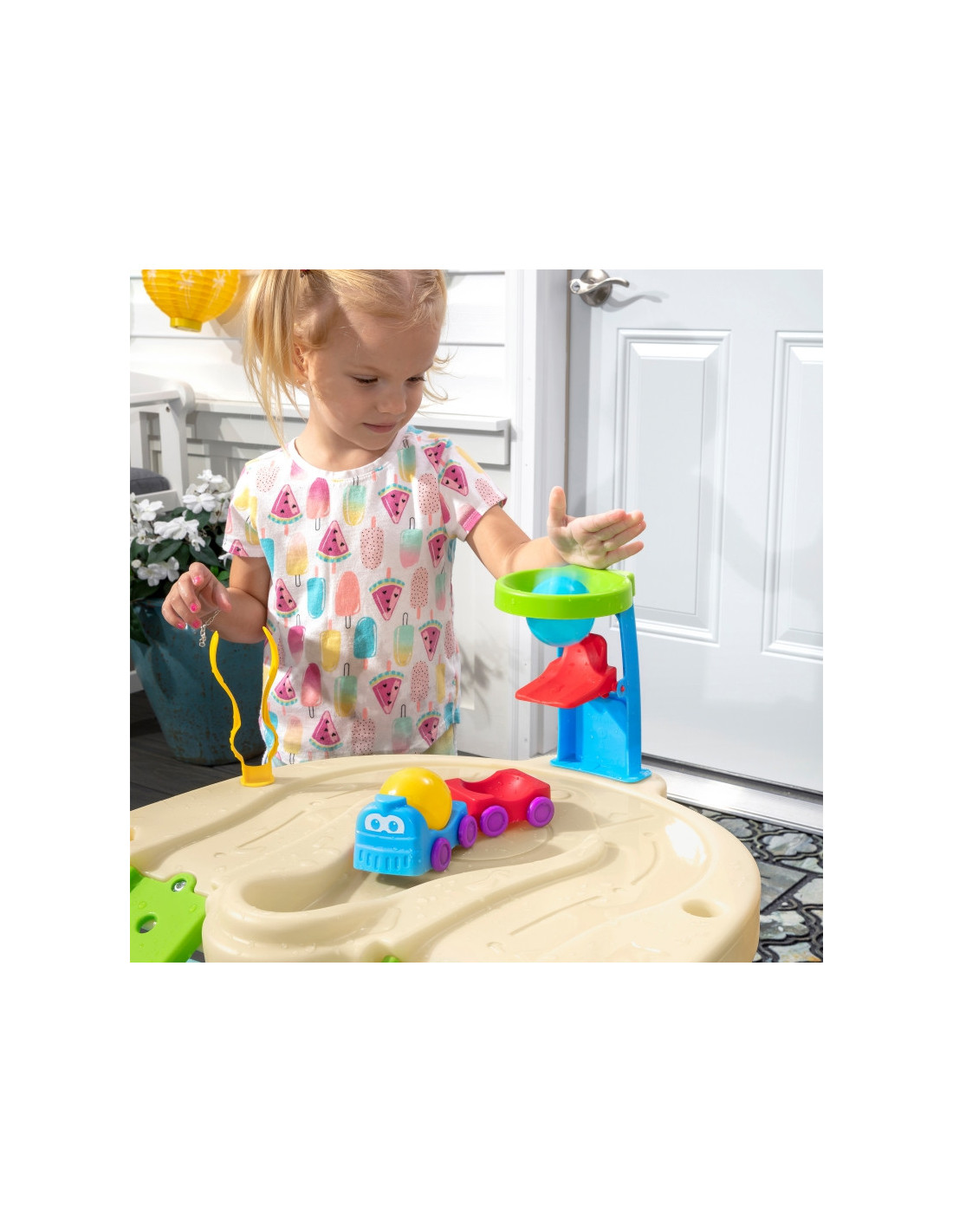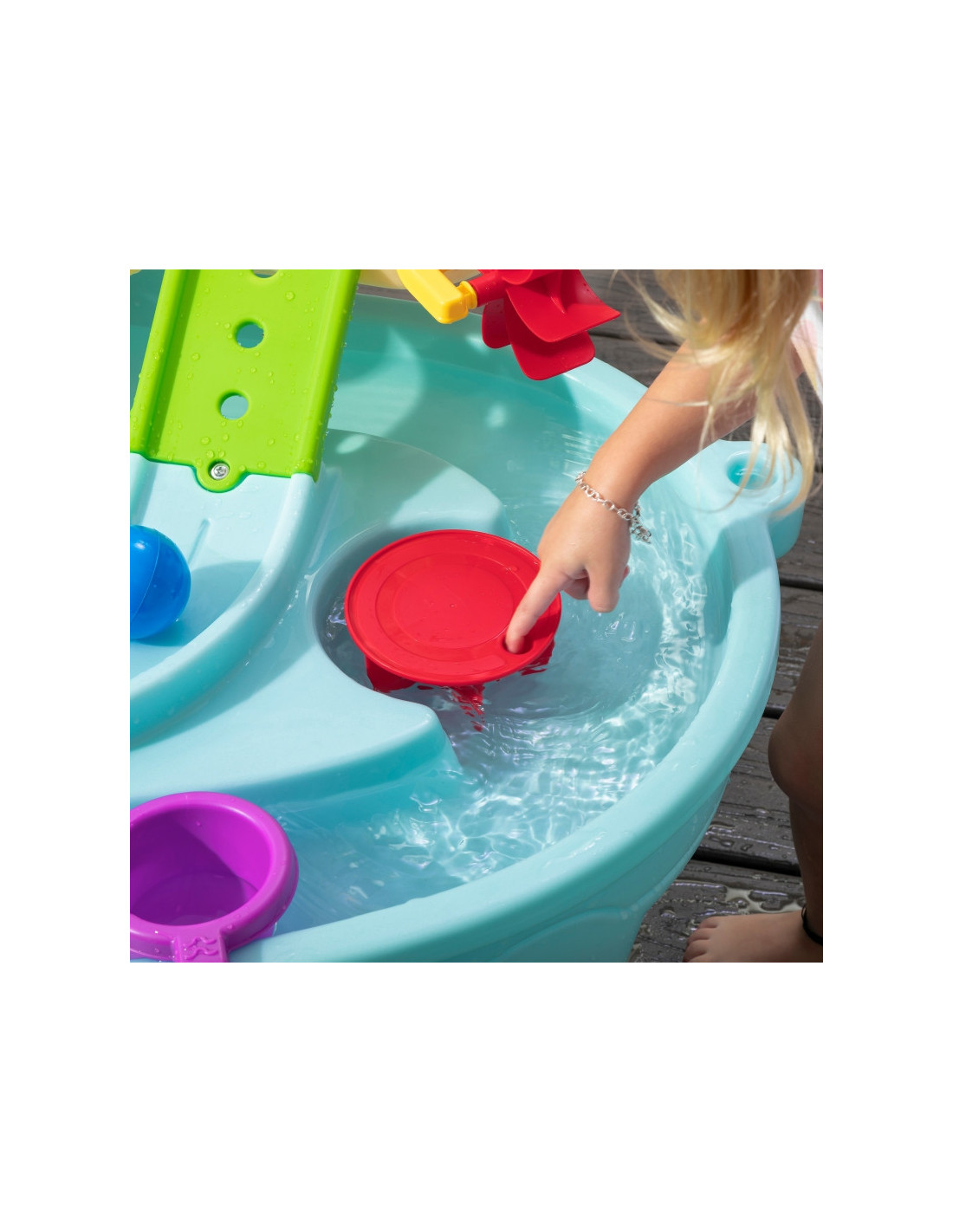 Step2 Ball Buddies Nuotykių centro vaikų dvipakopis stalas! Be klasikinio "Ball Buddies" savivarčio, šiame lauko žaidimų stale vaikams yra "Ball Buddies" sraigtasparnis, valtis ir traukinys, kuriame vienu metu galima vežti du žaidimo kamuoliukus! Ball Buddies laukia nuotykių aplink upę arba kruizas aplink išlietų kelių ir tiltų vingius. Šis vaikiškas vandens stalas su dideliu plotu, daugybe priedų ir daugybe žaidimo būdų yra puiki galimybė daugeliui vaikų žaisti socialiniuose žaidimuose. Be to, atskiros stotys aplink baseiną siūlo papildomų galimybių mažiesiems, norintiems žaisti vieniems. Mažieji nuotykių ieškotojai gali naudoti lanką mėtyti kamuoliukus į vandenį ir mėgautis įdomiomis vandens pramogomis naudodamiesi vandens ratu ir pridedamais matavimo puodeliais. Apačioje yra net interaktyvus ratas, todėl mažieji gali pajudinti vandenį ir sukurti tekančią upę.