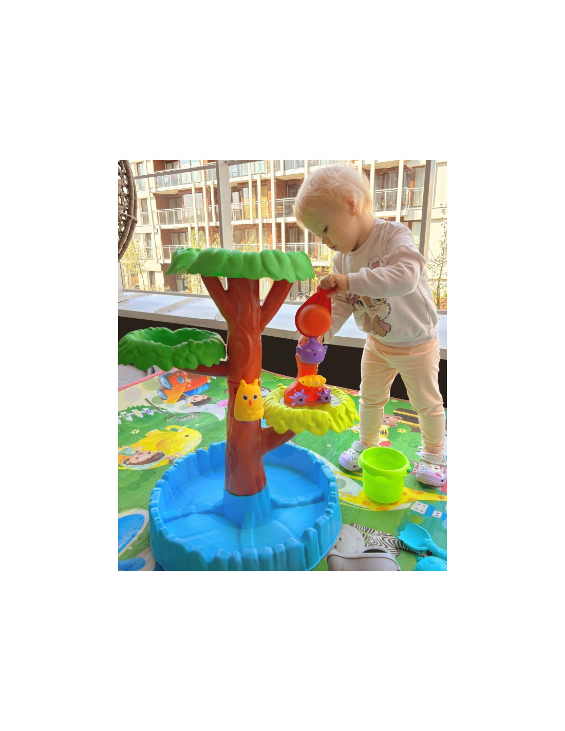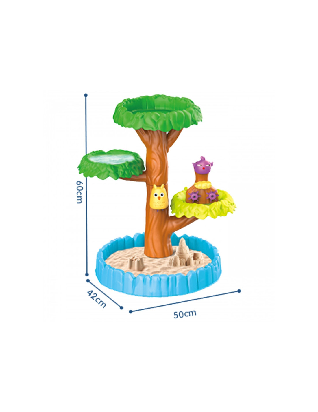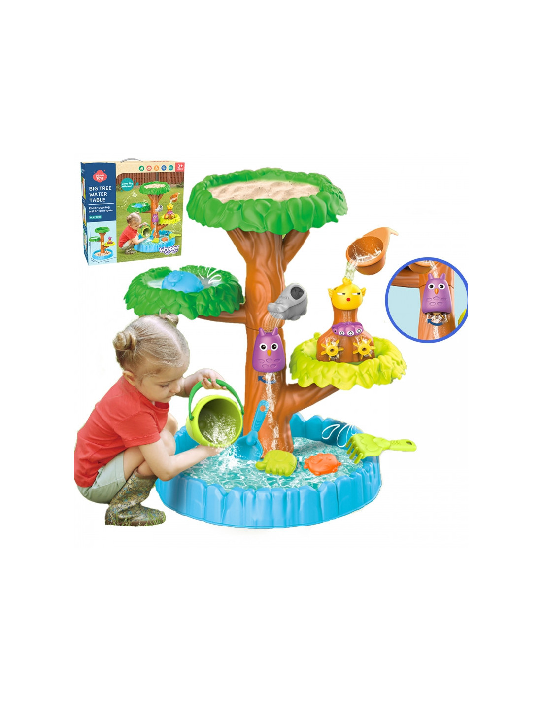 WOOPIE prekės ženklo 4 pakopų medžio formos vandens stalas puikiai tinka žaisti su vandeniu ir smėliu. Rinkinyje yra viskas, ko reikia nesibaigiančioms pramogoms - sulankstomas stalas, kibiras, piltuvas, 3 formos, 2 kastuvai, laistytuvas. Jūsų vaikas galės pilti vandenį į skirtingus gyvūnus, todėl krumpliaračiai suksis dar smagiau. Žaislas skirtas žaisti lauke: paplūdimyje ar smėlio dėžėje.