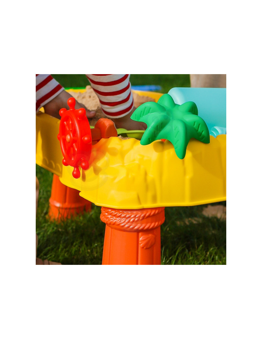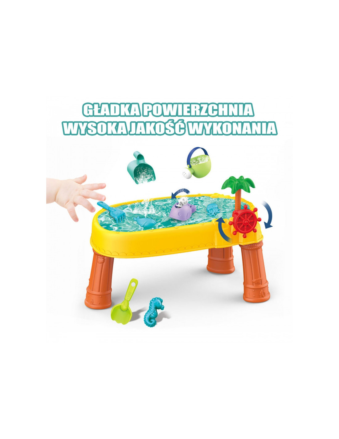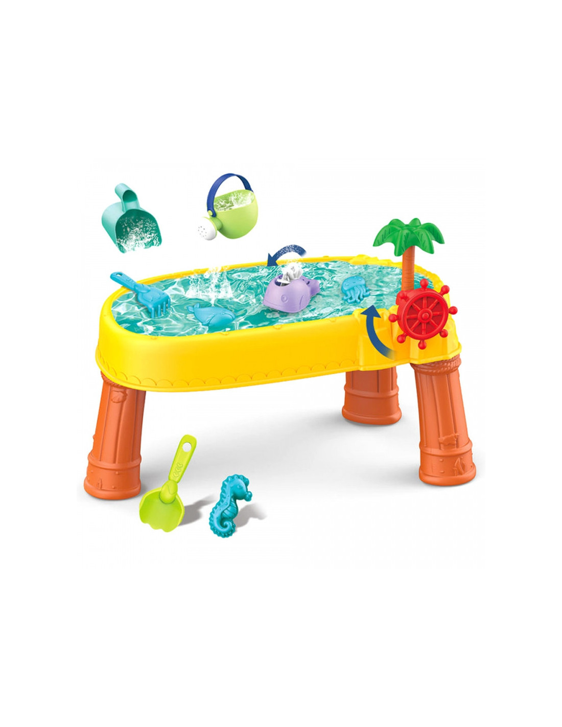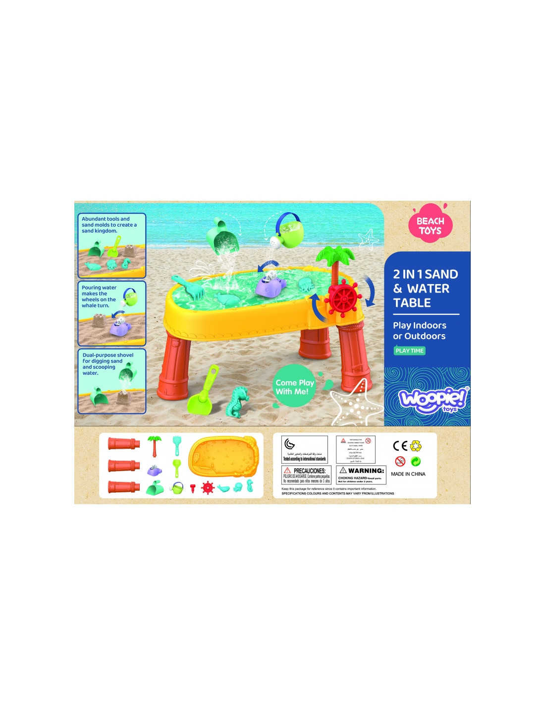 WOOPIE prekės ženklo smėlio stalas yra puikus žaislas žaisti su vandeniu ir smėliu. Rinkinyje yra 8 priedai: 3 formos, žuvis, laistytuvas, indas su rankena, grėblys ir mentele. Stalas turi vairą, kurį galite suktis ir pasijusti tikru piratu. Rinkinys skirtas žaisti tiek viduje, tiek lauke. Puikiai tinka žaisti namuose ir paplūdimyje ar smėlio dėžėje.