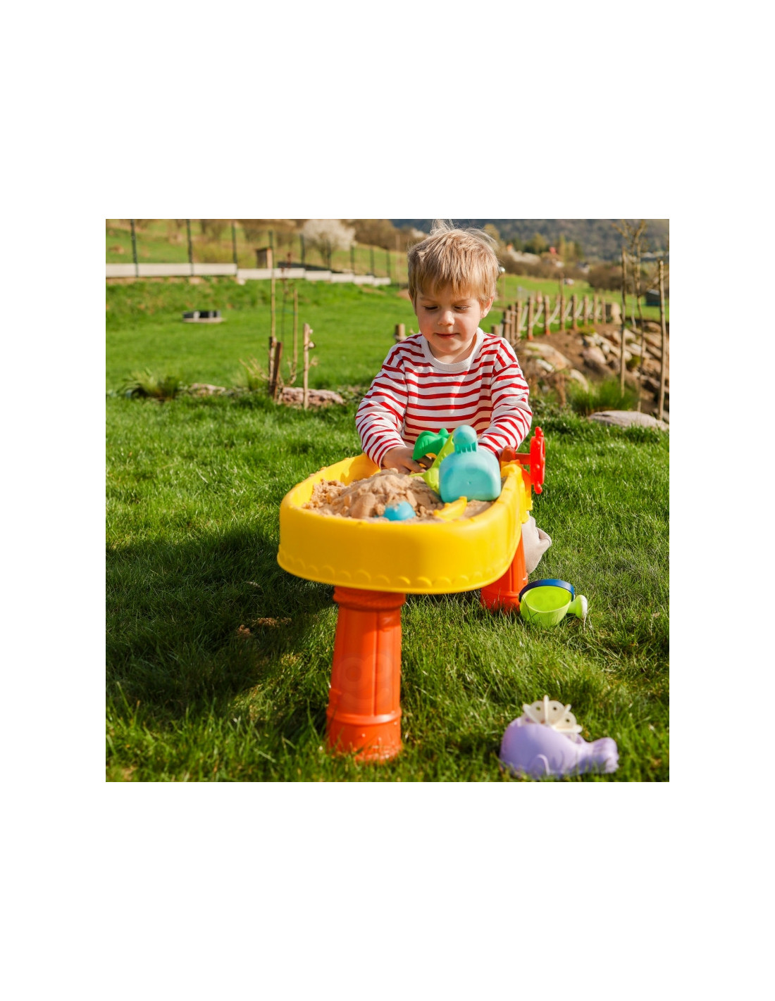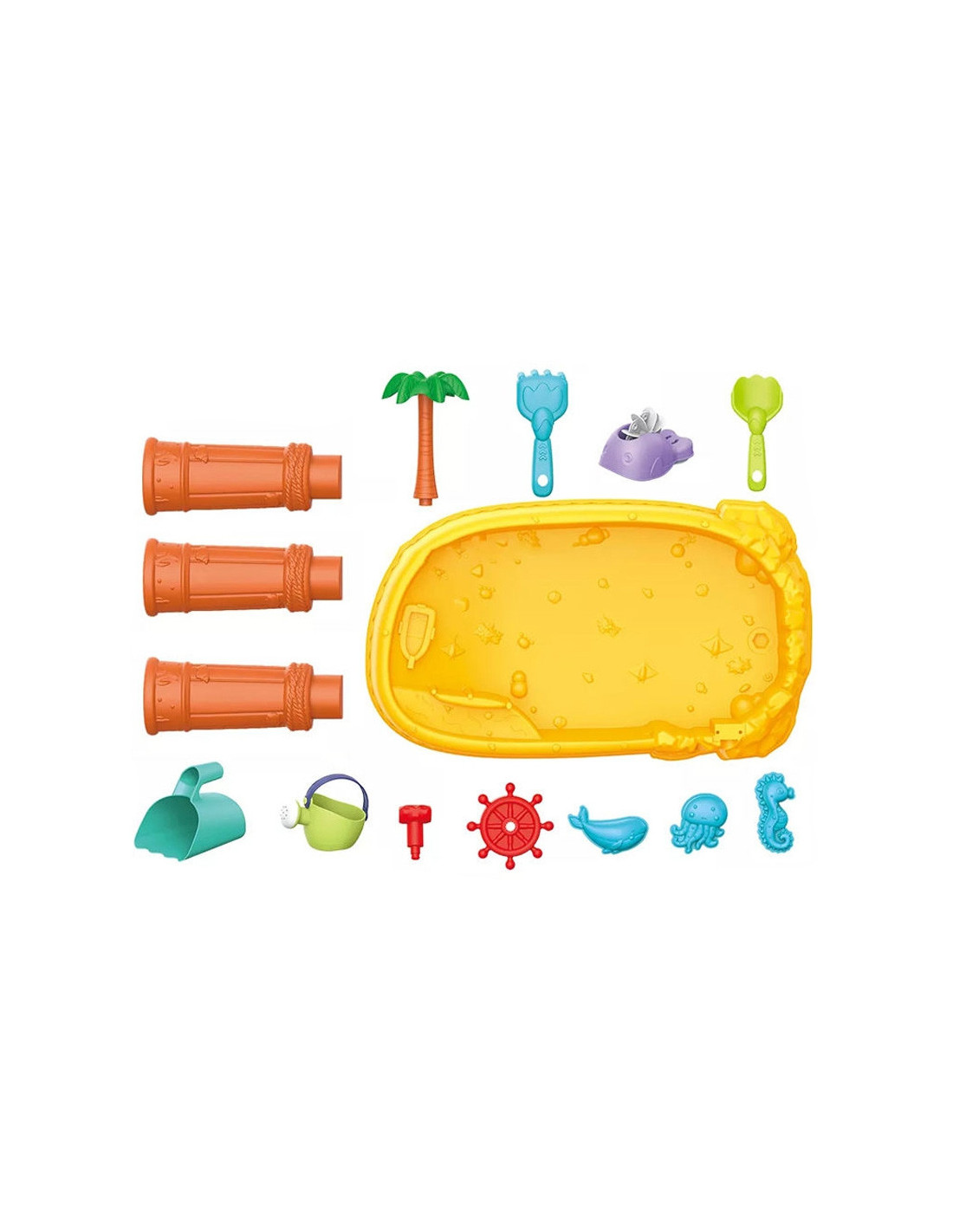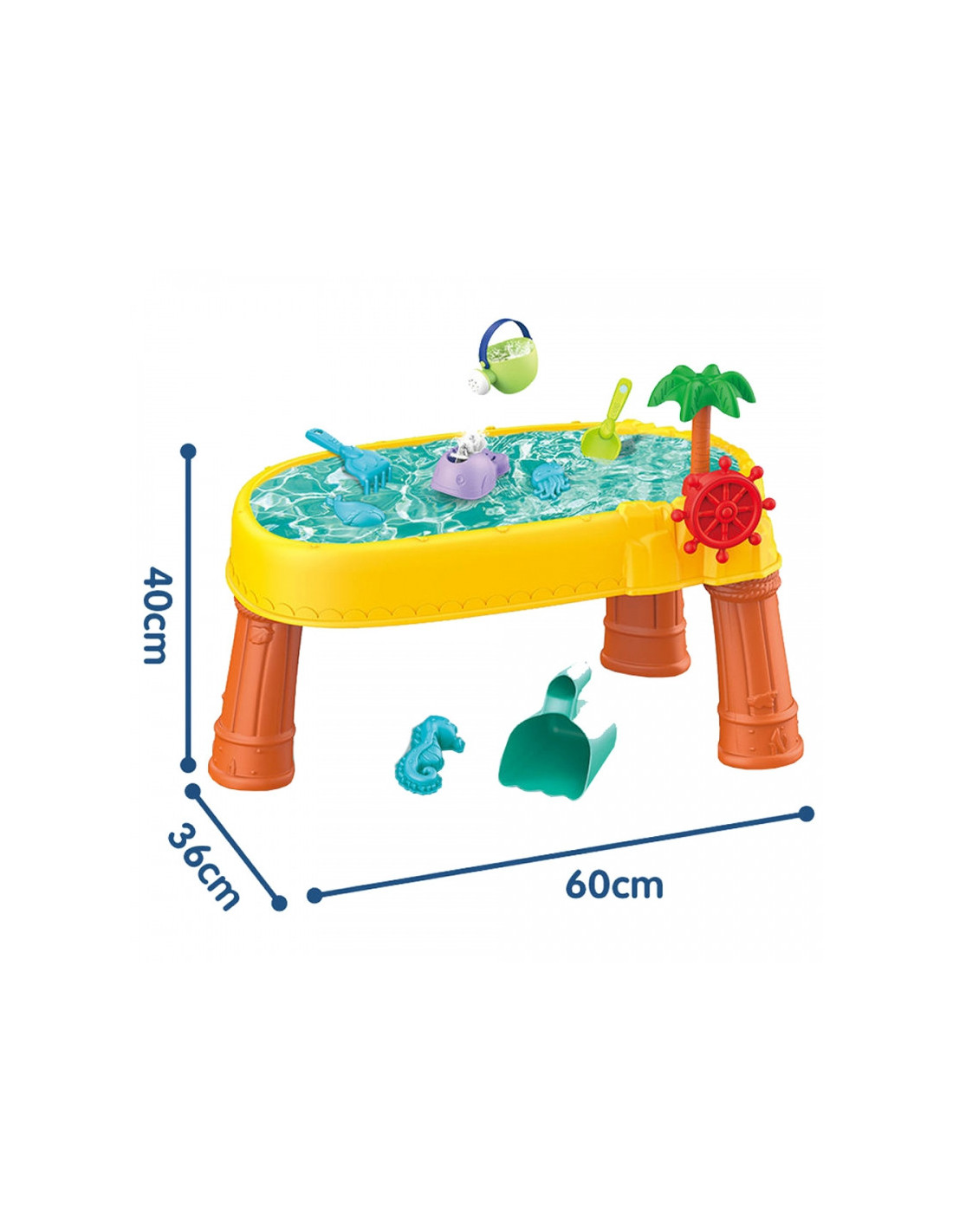 WOOPIE prekės ženklo smėlio stalas yra puikus žaislas žaisti su vandeniu ir smėliu. Rinkinyje yra 8 priedai: 3 formos, žuvis, laistytuvas, indas su rankena, grėblys ir mentele. Stalas turi vairą, kurį galite suktis ir pasijusti tikru piratu. Rinkinys skirtas žaisti tiek viduje, tiek lauke. Puikiai tinka žaisti namuose ir paplūdimyje ar smėlio dėžėje.