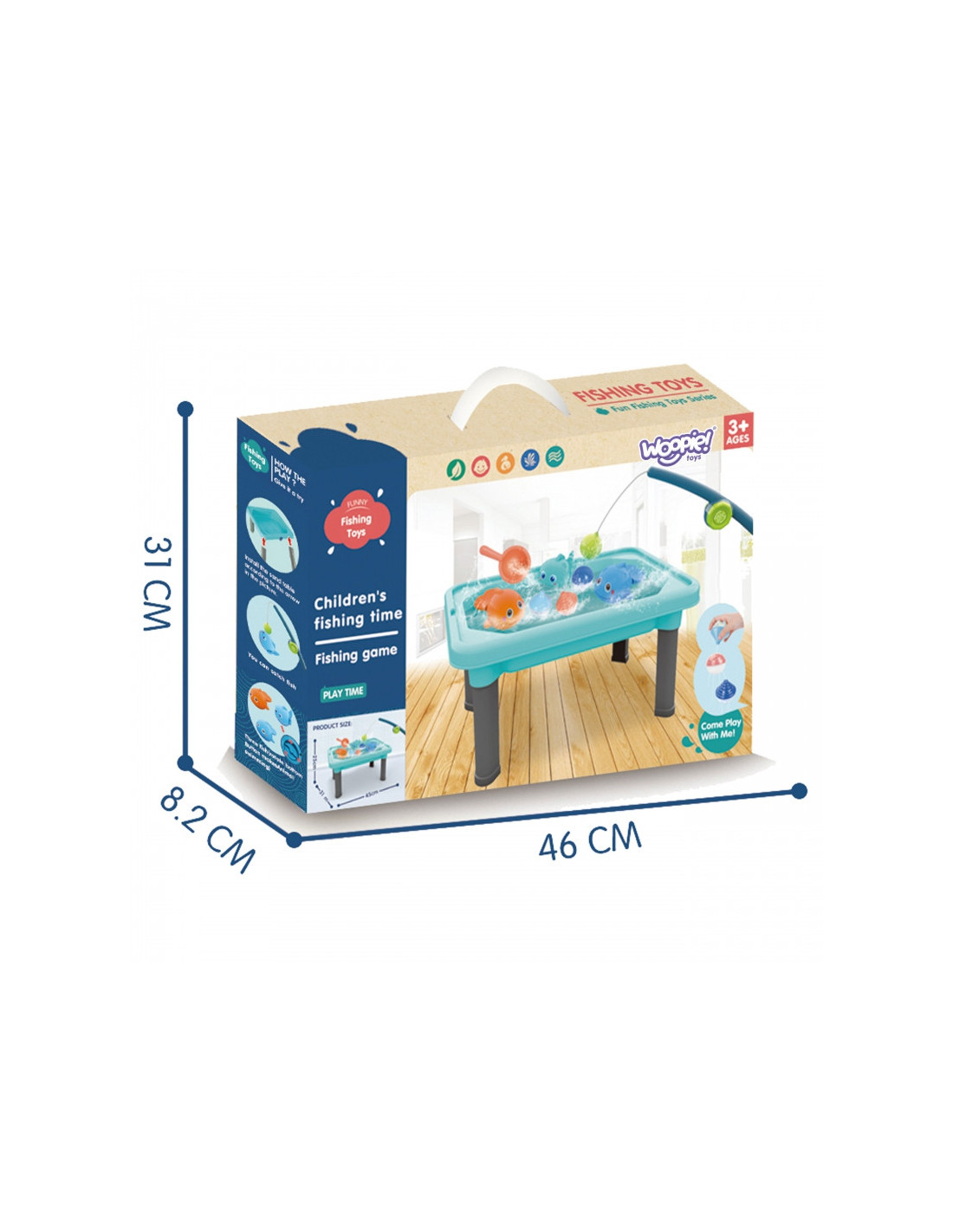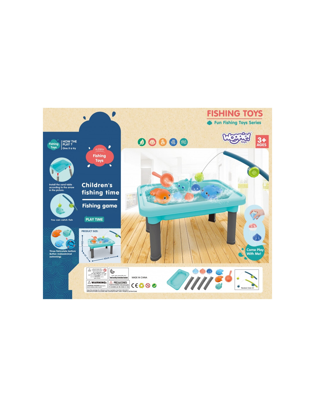 Garsaus WOOPIE prekės ženklo 3in1 žvejybos žaidimo smėlio dėžės vandens staliukas yra puikus produktas mūsų mažiausiems vaikams. Pripildykite baką vandens ir leiskite vaikams smagiai praleisti laiką vandenyje. Stalas taip pat gali būti naudojamas kaip smėlio dėžė. Rinkinyje yra 6 elementai, įskaitant vandens stalą, meškerę, vandens šaukštą, 3 lašelinius kamuoliukus ir 3 žuvis. Žuvys turi magnetus) ir gali būti papildomai suvyniotos, kad plūduriuotų ant vandens. Rinkinys yra puikus produktas žaisti namuose ir lauke. Jūsų vaikui patiks žvejybos malonumas.
