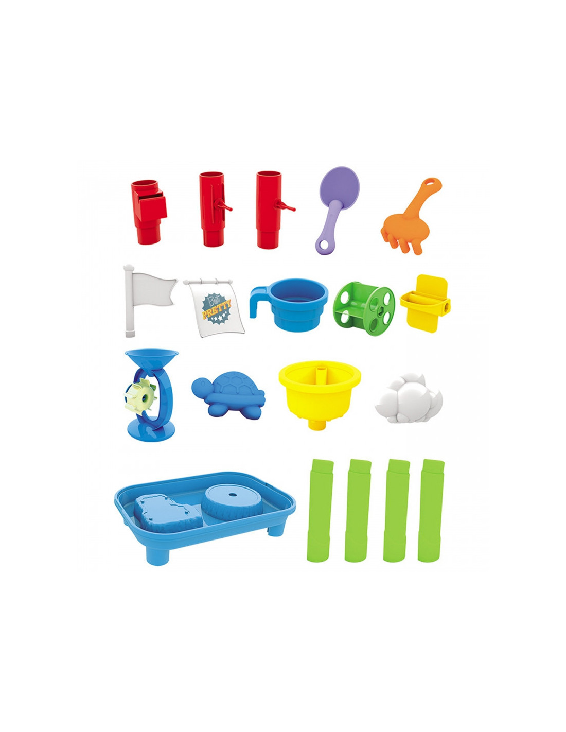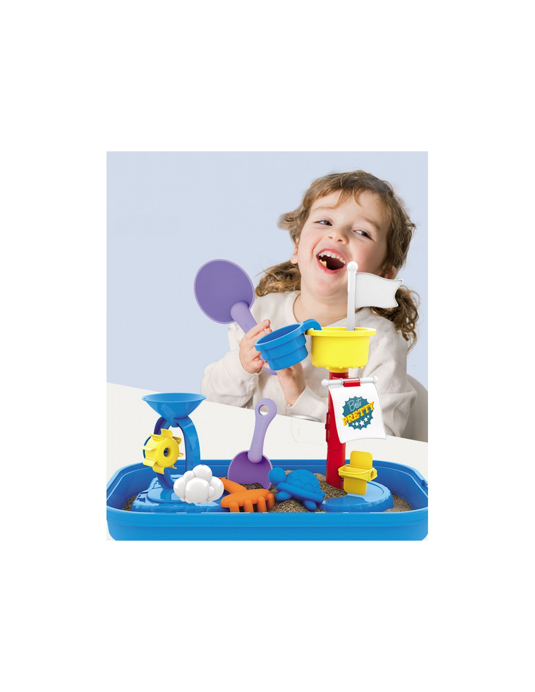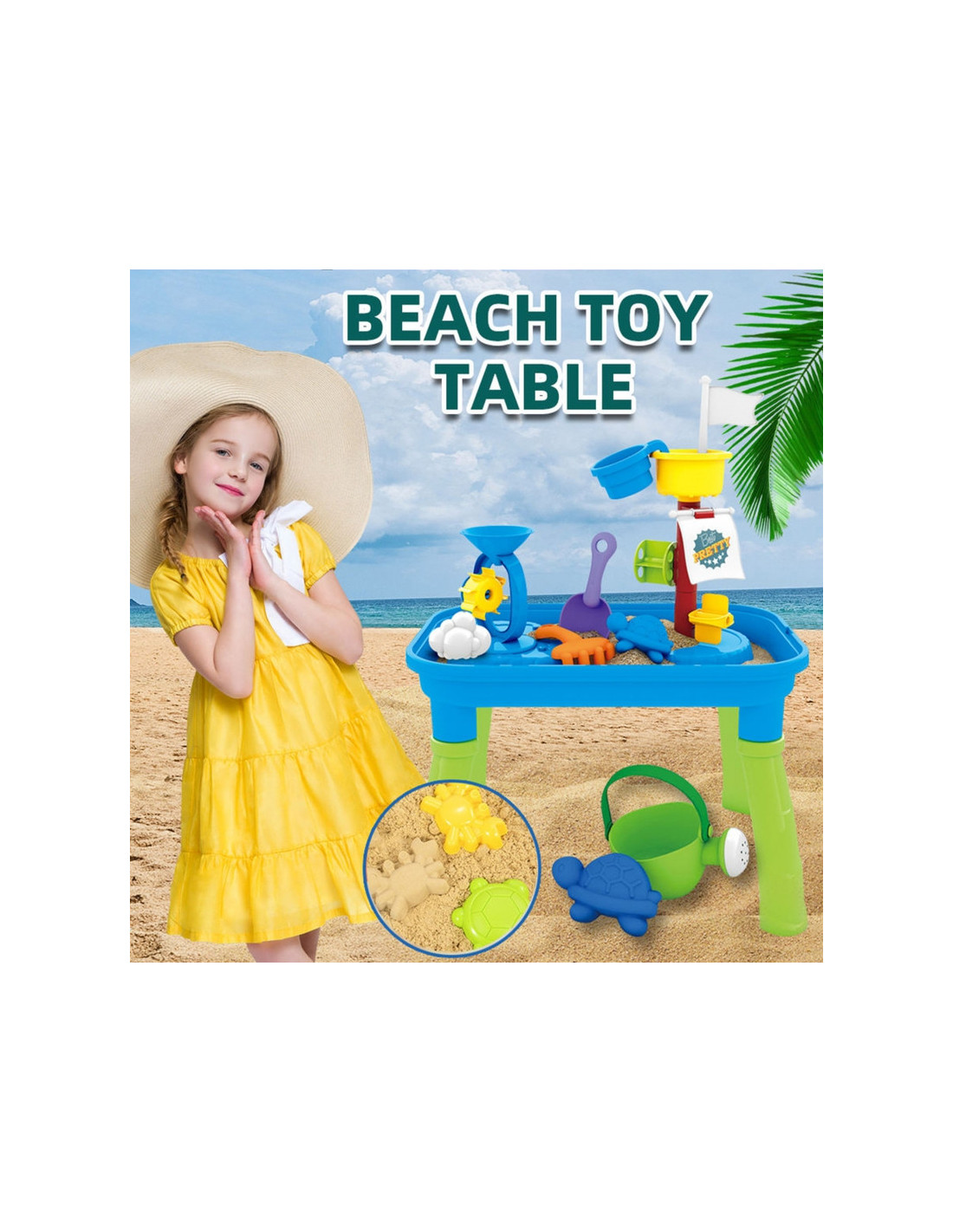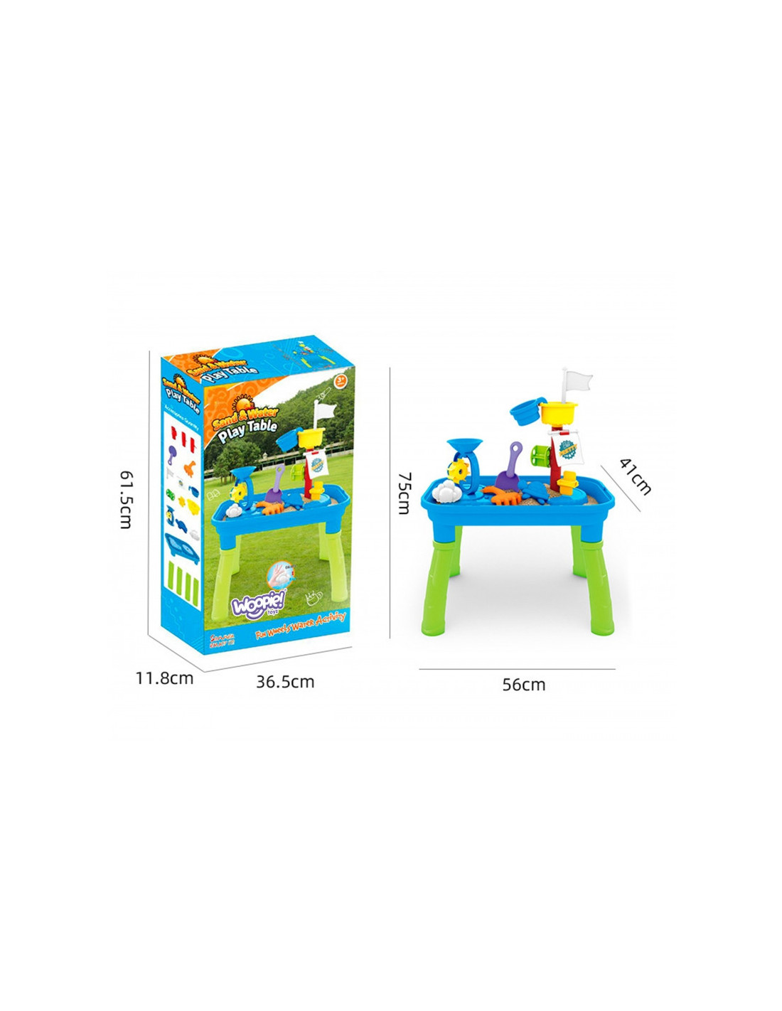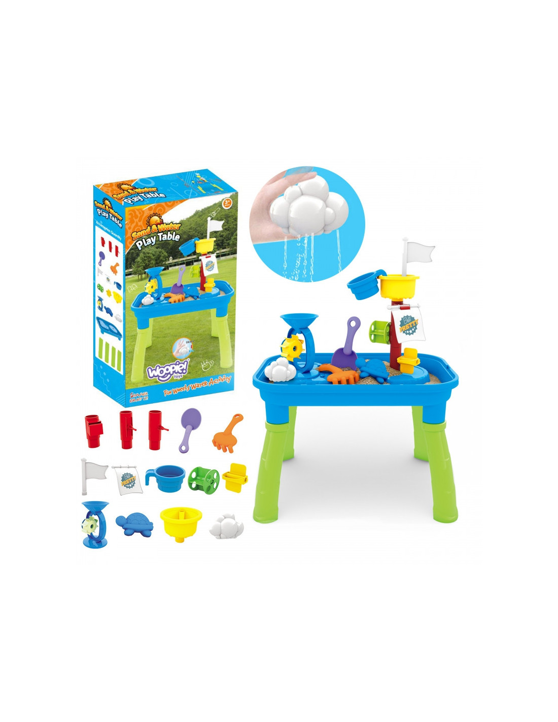 WOOPIE prekės ženklo smėlio stalas yra puikus žaislas žaisti su vandeniu ir smėliu. Rinkinyje yra daugybė žaidimo priedų, įskaitant formas, grėblius, mentelę ir kt. Puodelio pagalba vaikas gali užpilti vandenį ant stiebo ir pamatyti, kaip vanduo juda ant vandens šlifuoklių. Stalas skirtas žaisti tiek viduje, tiek lauke. Puikiai tinka žaisti namuose ir paplūdimyje ar smėlio dėžėje.