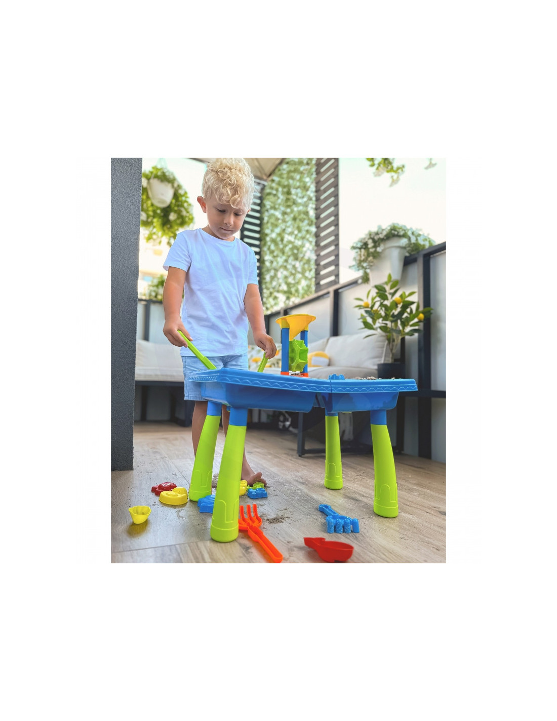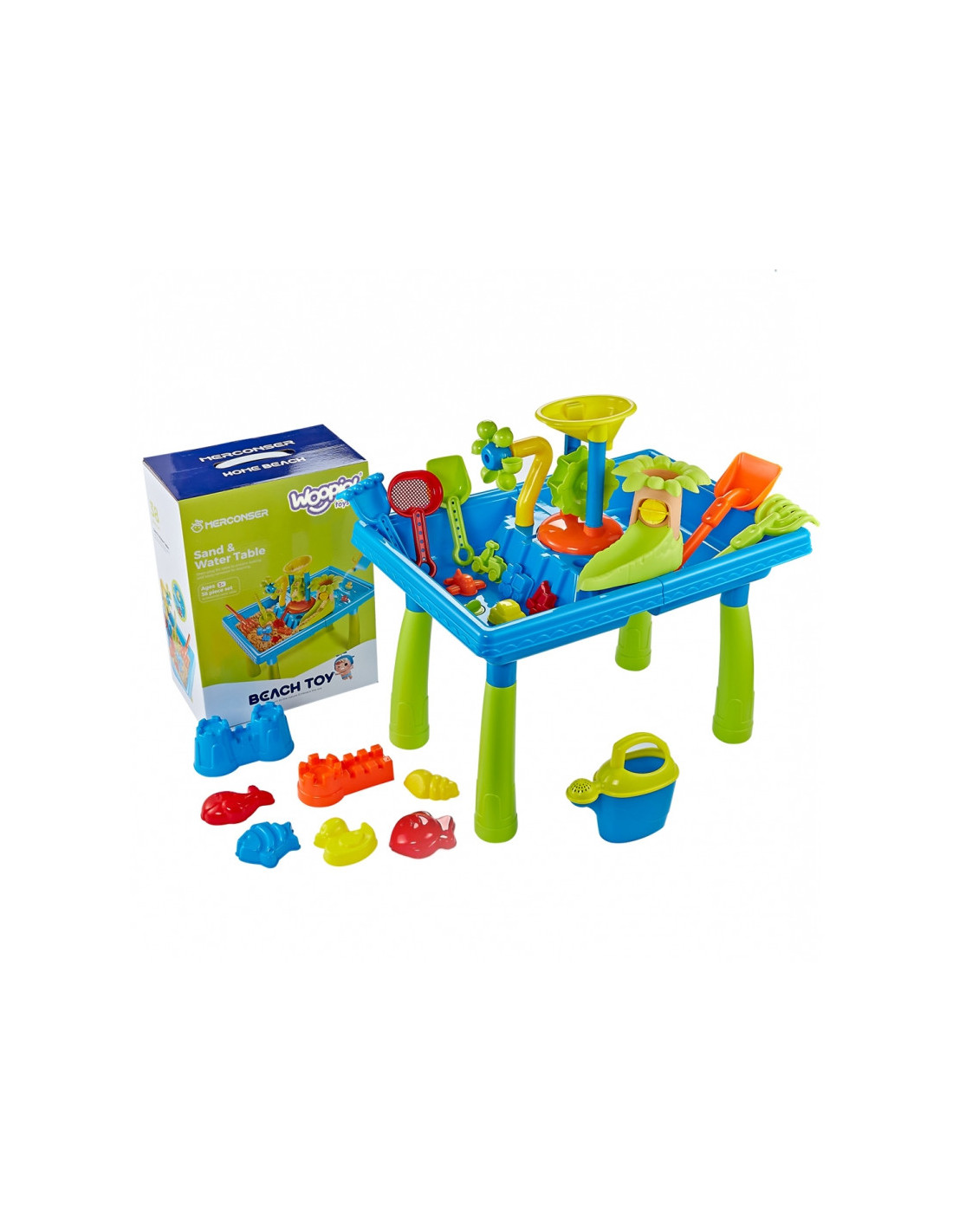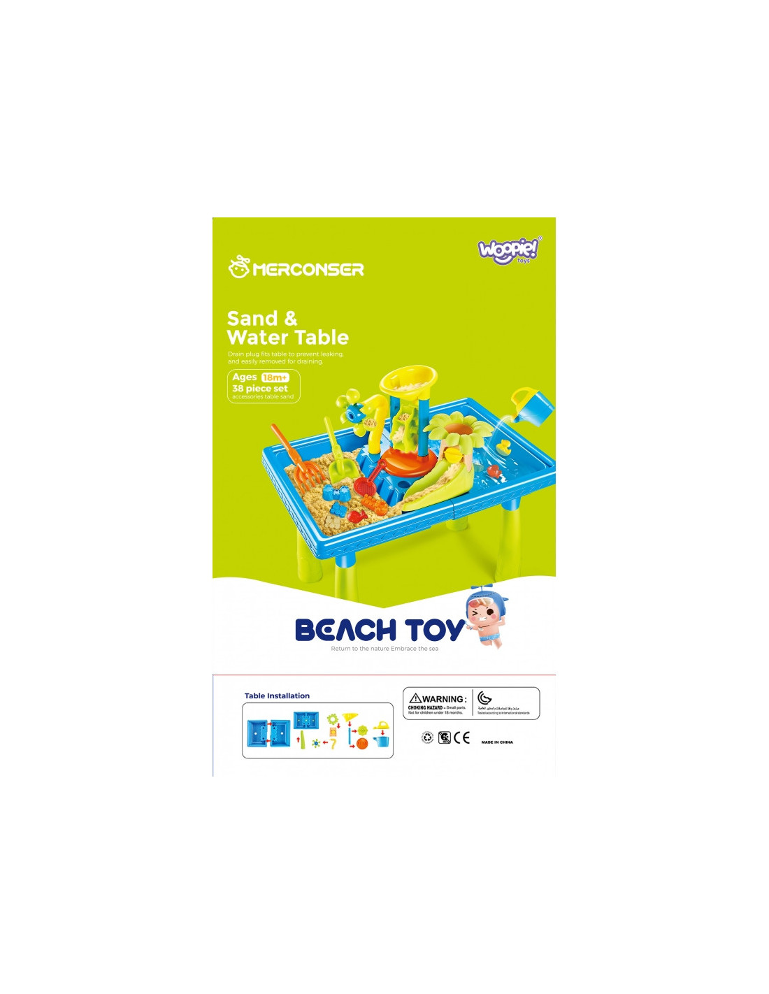 WOOPIE prekės ženklo vandens stalas 2in1 smėlio dėžė puikiai tinka žaisti su vandeniu ir smėliu. Rinkinyje yra 18 priedų: formos, laistytuvas, malūnėlis, mentelės, sietelis ir daug daugiau. Stalas turi 2 įdubas, viena užpildoma vandeniu, kita - smėliu. Vaikas gali įpilti vandens į šlifuoklį ir stebėti, kaip vanduo paleidžia rotorių. Puikiai tinka žaisti namuose ir paplūdimyje ar smėlio dėžėje.