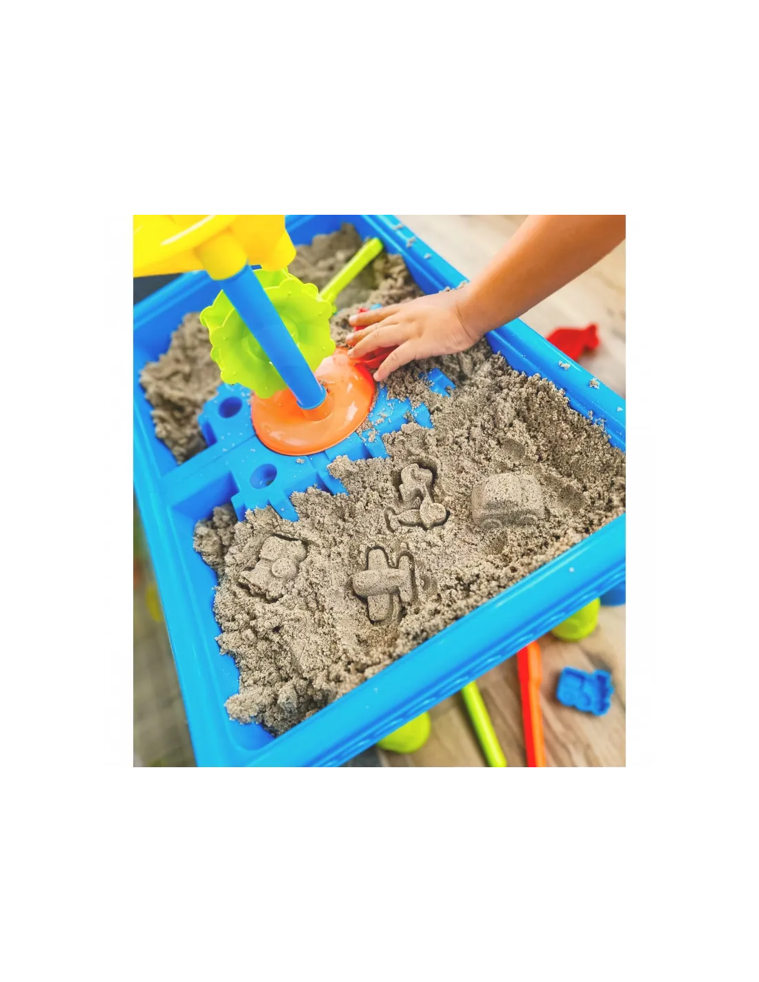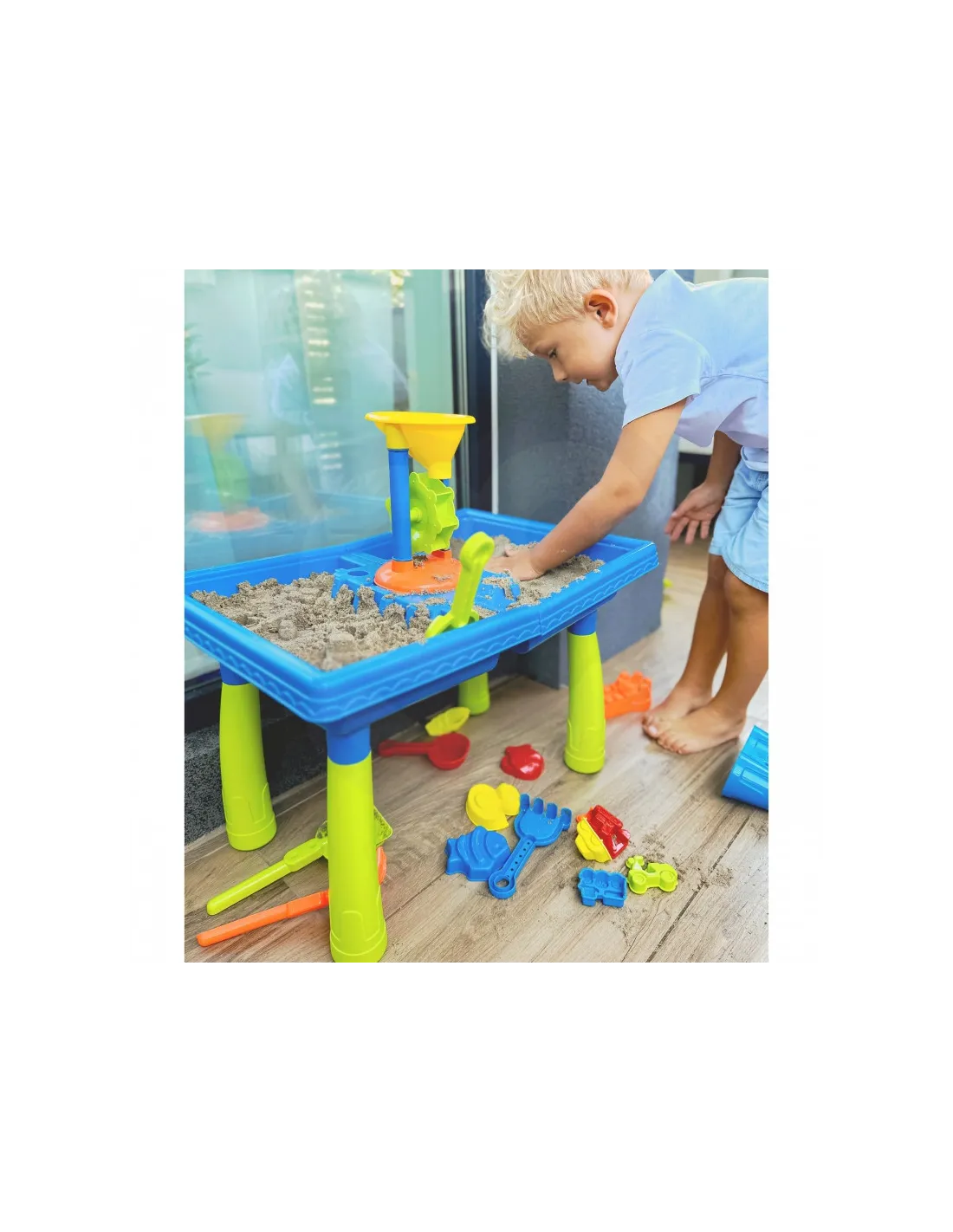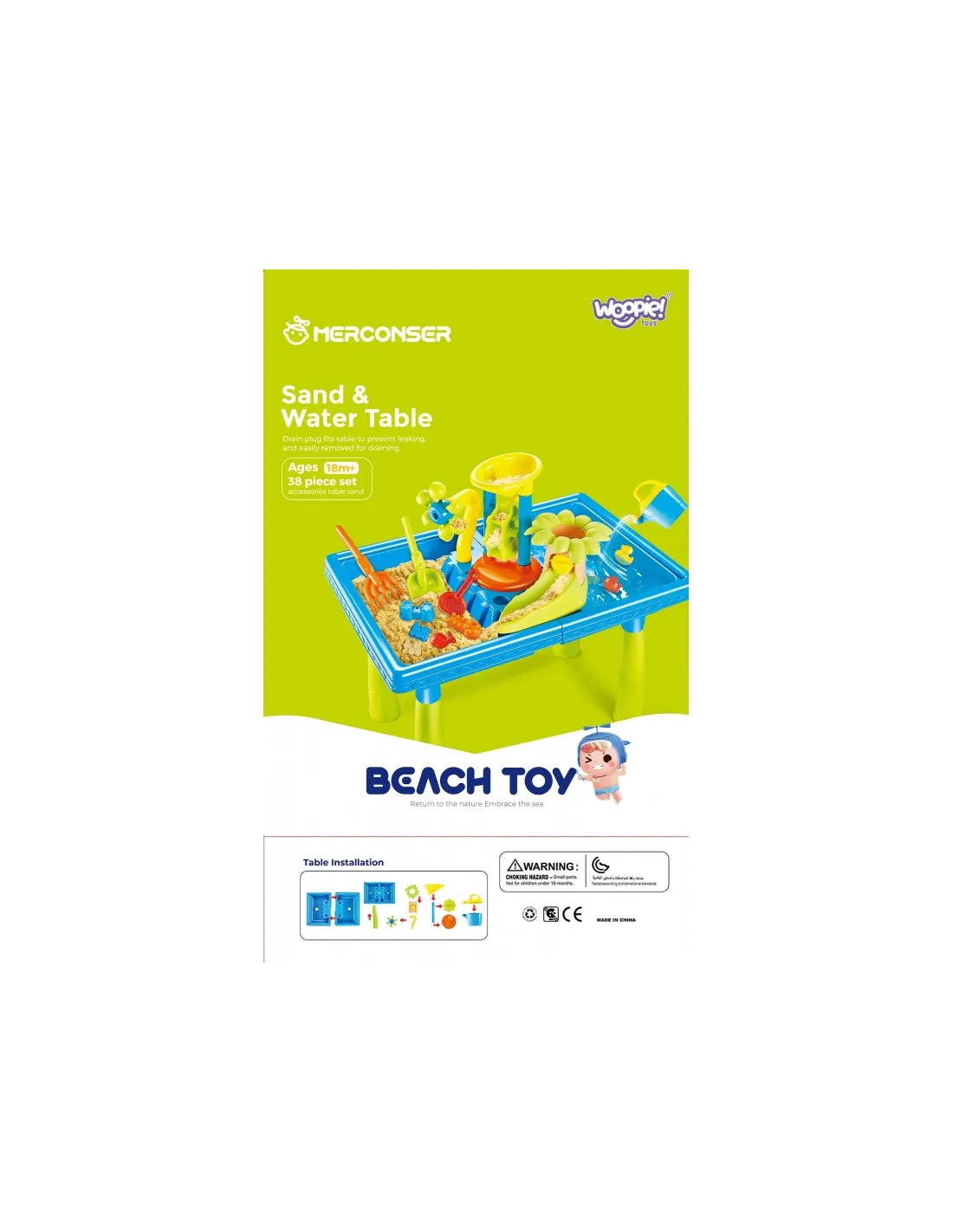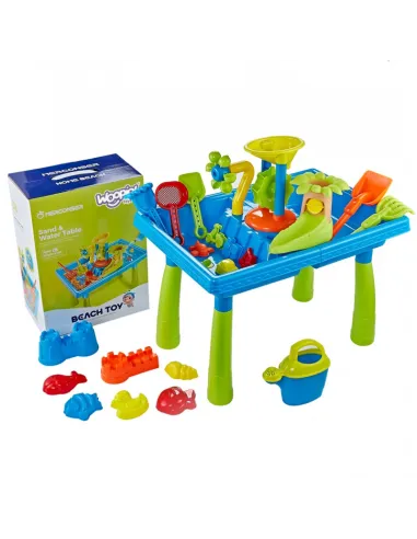 WOOPIE prekės ženklo vandens stalas 2in1 smėlio dėžė puikiai tinka žaisti su vandeniu ir smėliu. Rinkinyje yra 18 priedų: formos, laistytuvas, malūnėlis, mentelės, sietelis ir daug daugiau. Stalas turi 2 įdubas, viena užpildoma vandeniu, kita - smėliu. Vaikas gali įpilti vandens į šlifuoklį ir stebėti, kaip vanduo paleidžia rotorių. Puikiai tinka žaisti namuose ir paplūdimyje ar smėlio dėžėje.
