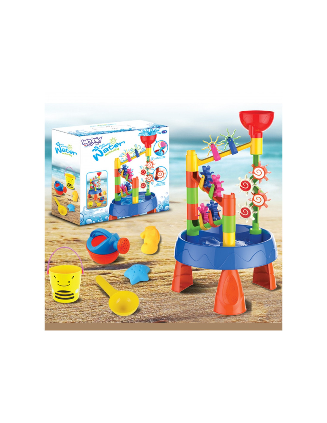 WOOPIE prekės ženklo vandens stalas 2in1 smėlio dėžė yra puikus žaislas žaisti su vandeniu ir smėliu. Komplekte yra 5 priedai: formos, laistytuvas, kibiras, vandens samtelis. Stalas turi interaktyvius šlifuoklius, kurie sukasi, kai vanduo pilamas į piltuvą. Rinkinys skirtas žaisti tiek viduje, tiek lauke. Puikiai tinka žaisti namuose ir paplūdimyje ar smėlio dėžėje.
