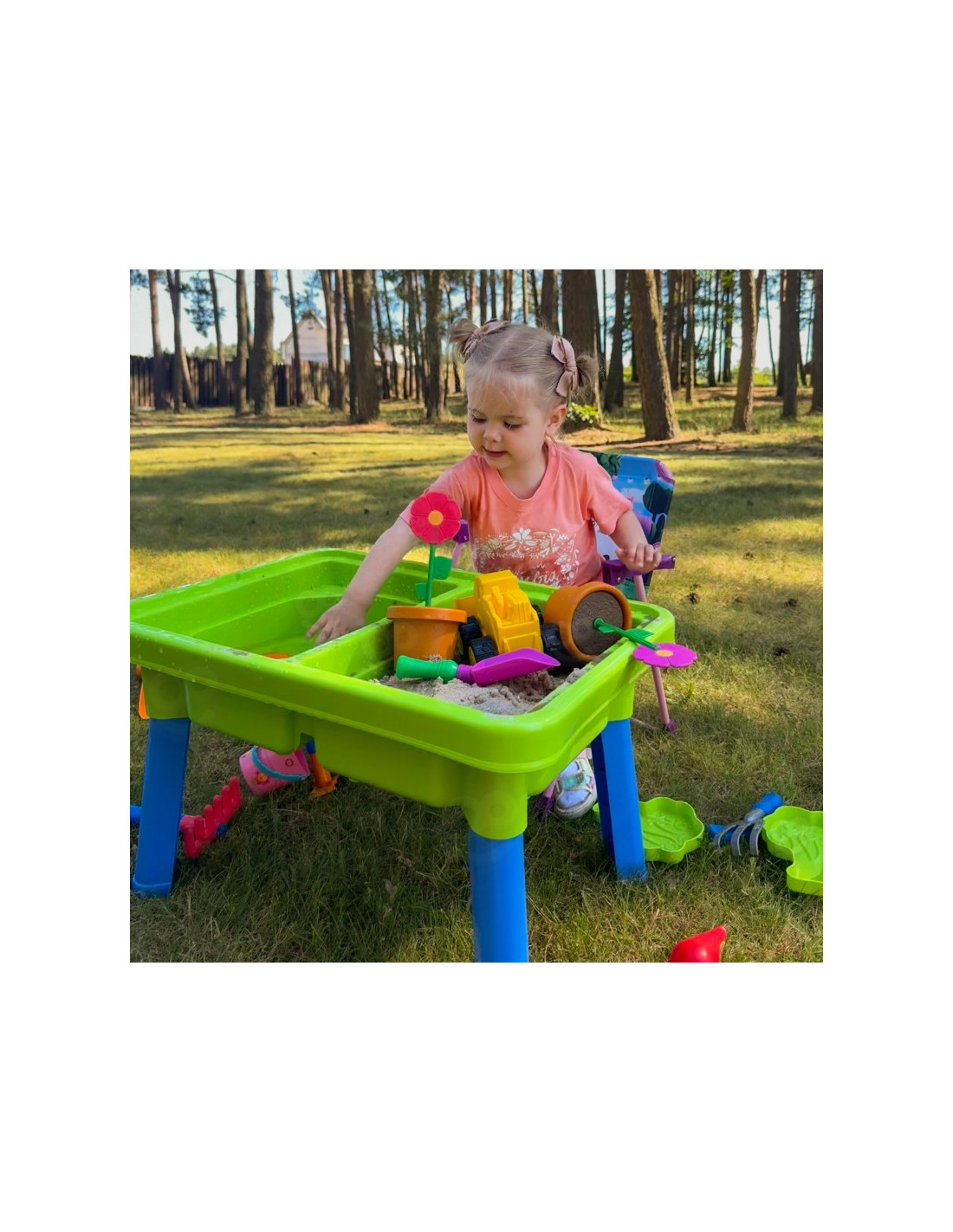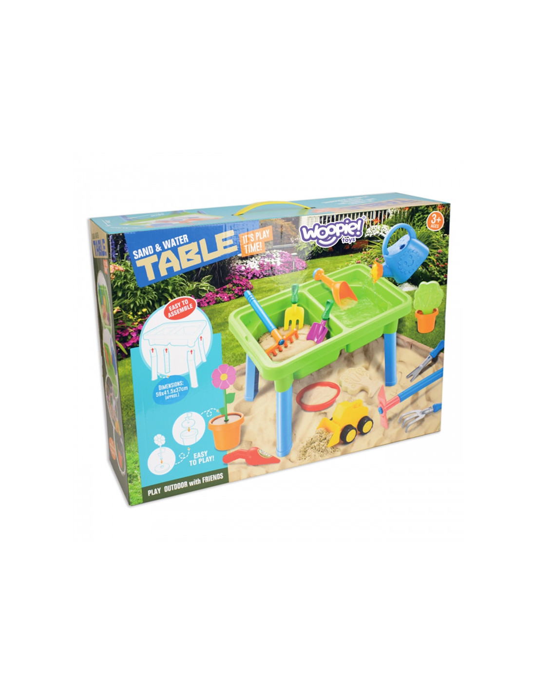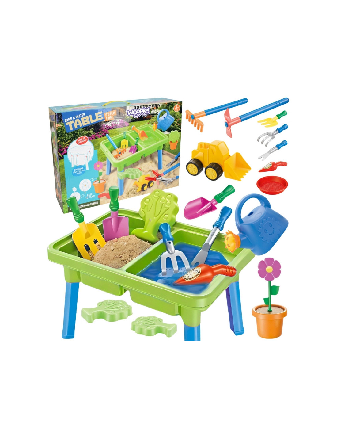 WOOPIE 2 viename vandens stalas- smėlio dėžė yra fantastiškas žaislas, kuris suteiks vaikams nesuskaičiuojamas valandas vandens ir smėlio pramogų . Rinkinį sudaro 13 skirtingų priedų, tokių kaip formelė, laistytuvas, ekskavatorius ir du kastuvai. Stalas turi dvi įdubas – vieną galima pripildyti vandens, o kitą – smėliu , todėl galima kūrybiškai žaisti bet kur. Rinkinys puikiai tinka namams, paplūdimiui ar smėlio dėžei. Šis universalus rinkinys leidžia vaikams kurti begalę žaidimo scenarijų, stimuliuoja jų vaizduotę ir lavina rankinius įgūdžius . Puikiai tinka kūrybiškam žaidimui tiek patalpose, tiek lauke!
